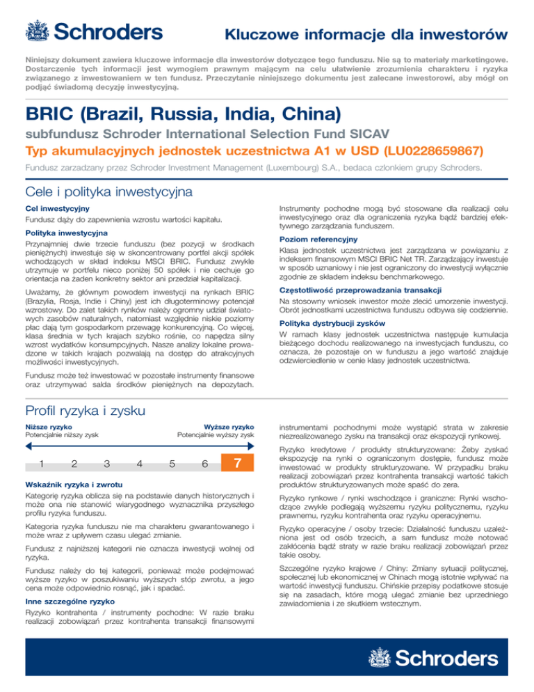 Kluczowe informacje dla inwestorów Niniejszy dokument zawiera kluczowe informacje dla inwestorów dotyczące tego funduszu. Nie są to materiały marketingowe. Dostarczenie tych informacji jest wymogiem prawnym mającym na celu ułatwienie zrozumienia charakteru i ryzyka związanego z inwestowaniem w ten fundusz. Przeczytanie niniejszego dokumentu jest zalecane inwestorowi, aby mógł on podjąć świadomą decyzję inwestycyjną. BRIC (Brazil, Russia, India, China) subfundusz Schroder International Selection Fund SICAV Typ akumulacyjnych jednostek uczestnictwa A1 w USD (LU0228659867) Fundusz zarzadzany przez Schroder Investment Management (Luxembourg) S.A., bedaca czlonkiem grupy Schroders. Cele i polityka inwestycyjna Cel inwestycyjny Fundusz dąży do zapewnienia wzrostu wartości kapitału. Polityka inwestycyjna Przynajmniej dwie trzecie funduszu (bez pozycji w środkach pieniężnych) inwestuje się w skoncentrowany portfel akcji spółek wchodzących w skład indeksu MSCI BRIC. Fundusz zwykle utrzymuje w portfelu nieco poniżej 50 spółek i nie cechuje go orientacja na żaden konkretny sektor ani przedział kapitalizacji. Uważamy, że głównym powodem inwestycji na rynkach BRIC (Brazylia, Rosja, Indie i Chiny) jest ich długoterminowy potencjał wzrostowy. Do zalet takich rynków należy ogromny udział światowych zasobów naturalnych, natomiast względnie niskie poziomy płac dają tym gospodarkom przewagę konkurencyjną. Co więcej, klasa średnia w tych krajach szybko rośnie, co napędza silny wzrost wydatków konsumpcyjnych. Nasze analizy lokalne prowadzone w takich krajach pozwalają na dostęp do atrakcyjnych możliwości inwestycyjnych. Instrumenty pochodne mogą być stosowane dla realizacji celu inwestycyjnego oraz dla ograniczenia ryzyka bądź bardziej efektywnego zarządzania funduszem. Poziom referencyjny Klasa jednostek uczestnictwa jest zarządzana w powiązaniu z indeksem finansowym MSCI BRIC Net TR. Zarządzający inwestuje w sposób uznaniowy i nie jest ograniczony do inwestycji wyłącznie zgodnie ze składem indeksu benchmarkowego. Częstotliwość przeprowadzania transakcji Na stosowny wniosek inwestor może zlecić umorzenie inwestycji. Obrót jednostkami uczestnictwa funduszu odbywa się codziennie. Polityka dystrybucji zysków W ramach klasy jednostek uczestnictwa następuje kumulacja bieżącego dochodu realizowanego na inwestycjach funduszu, co oznacza, że pozostaje on w funduszu a jego wartość znajduje odzwierciedlenie w cenie klasy jednostek uczestnictwa. Fundusz może też inwestować w pozostałe instrumenty finansowe oraz utrzymywać salda środków pieniężnych na depozytach. Profil ryzyka i zysku Niższe ryzyko Potencjalnie niższy zysk 1 2 Wyższe ryzyko Potencjalnie wyższy zysk 3 4 5 6 7 Wskaźnik ryzyka i zwrotu Kategorię ryzyka oblicza się na podstawie danych historycznych i może ona nie stanowić wiarygodnego wyznacznika przyszłego profilu ryzyka funduszu. Kategoria ryzyka funduszu nie ma charakteru gwarantowanego i może wraz z upływem czasu ulegać zmianie. Fundusz z najniższej kategorii nie oznacza inwestycji wolnej od ryzyka. Fundusz należy do tej kategorii, ponieważ może podejmować wyższe ryzyko w poszukiwaniu wyższych stóp zwrotu, a jego cena może odpowiednio rosnąć, jak i spadać. Inne szczególne ryzyko Ryzyko kontrahenta / instrumenty pochodne: W razie braku realizacji zobowiązań przez kontrahenta transakcji finansowymi instrumentami pochodnymi może wystąpić strata w zakresie niezrealizowanego zysku na transakcji oraz ekspozycji rynkowej. Ryzyko kredytowe / produkty strukturyzowane: Żeby zyskać ekspozycję na rynki o ograniczonym dostępie, fundusz może inwestować w produkty strukturyzowane. W przypadku braku realizacji zobowiązań przez kontrahenta transakcji wartość takich produktów strukturyzowanych może spaść do zera. Ryzyko rynkowe / rynki wschodzące i graniczne: Rynki wschodzące zwykle podlegają wyższemu ryzyku politycznemu, ryzyku prawnemu, ryzyku kontrahenta oraz ryzyku operacyjnemu. Ryzyko operacyjne / osoby trzecie: Działalność funduszu uzależniona jest od osób trzecich, a sam fundusz może notować zakłócenia bądź straty w razie braku realizacji zobowiązań przez takie osoby. Szczególne ryzyko krajowe / Chiny: Zmiany sytuacji politycznej, społecznej lub ekonomicznej w Chinach mogą istotnie wpływać na wartość inwestycji funduszu. Chińskie przepisy podatkowe stosuje się na zasadach, które mogą ulegać zmianie bez uprzedniego zawiadomienia i ze skutkiem wstecznym. Schroder International Selection Fund SICAV BRIC (Brazil, Russia, India, China) Opłaty Opłaty jednorazowe pobierane przed lub po dokonaniu inwestycji Opłata za subskrypcję 4,00% Opłata za umorzenie brak Wyszczególnione opłaty za nabycie i umorzenie są wartościami maksymalnymi, w pewnych przypadkach inwestor może zostać obciążony niższymi kwotami. Inwestor może zapoznać się z aktualnie obowiązującymi opłatami za nabycie i umorzenie u swego doradcy finansowego. Jest to maksymalna kwota, jaka może zostać pobrana z Państwa środków przed ich zainwestowaniem. Opłaty pobierane z funduszu w ciągu roku Opłaty bieżące 2,43% Wysokość opłat bieżących określa się na podstawie kosztów poniesionych za rok zakończony w grudnia 2013 roku i mogą one z roku na rok ulegać zmianie. Opłaty pobierane z funduszu w określonych warunkach szczególnych Opłata za wyniki Opłaty ponoszone przez inwestora służą pokryciu kosztów działalności funduszu, w tym kosztów jego marketingu i dystrybucji. Opłaty obniżają stopę potencjalnego wzrostu wartości inwestycji. brak Więcej informacji na temat opłat można znaleźć w części 3 prospektu informacyjnego funduszu. Wyniki osiągnięte w przeszłości % ¢ Typ akumulacyjnych A1 w USD (LU0228659867) ¢ MSCI BRIC Net TR Wyniki osiągnięte w przeszłości nie stanowią gwarancji wyników przyszłych i mogą nie zostać powtórzone.