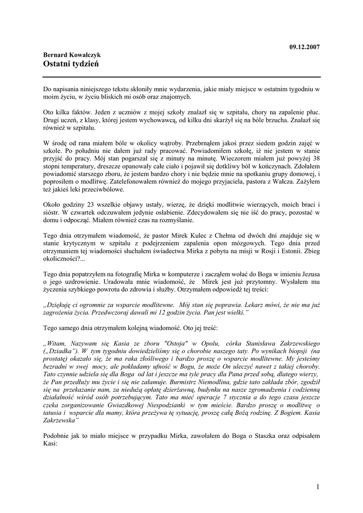 09.12.2007 Bernard Kowalczyk Ostatni tydzień Do napisania niniejszego tekstu skłoniły mnie wydarzenia, jakie miały miejsce w ostatnim tygodniu w moim Ŝyciu, w Ŝyciu bliskich mi osób oraz znajomych. Oto kilka faktów. Jeden z uczniów z mojej szkoły znalazł się w szpitalu, chory na zapalenie płuc. Drugi uczeń, z klasy, której jestem wychowawcą, od kilku dni skarŜył się na bóle brzucha. Znalazł się równieŜ w szpitalu. W środę od rana miałem bóle w okolicy wątroby. Przebrnąłem jakoś przez siedem godzin zajęć w szkole. Po południu nie dałem juŜ rady pracować. Powiadomiłem szkołę, iŜ nie jestem w stanie przyjść do pracy. Mój stan pogarszał się z minuty na minutę. Wieczorem miałem juŜ powyŜej 38 stopni temperatury, dreszcze opanowały całe ciało i pojawił się dotkliwy ból w kończynach. Zdołałem powiadomić starszego zboru, Ŝe jestem bardzo chory i nie będzie mnie na spotkaniu grupy domowej, i poprosiłem o modlitwę. Zatelefonowałem równieŜ do mojego przyjaciela, pastora z Wałcza. ZaŜyłem teŜ jakieś leki przeciwbólowe. Około godziny 23 wszelkie objawy ustały, wierzę, Ŝe dzięki modlitwie wierzących, moich braci i sióstr. W czwartek odczuwałem jedynie osłabienie. Zdecydowałem się nie iść do pracy, pozostać w domu i odpocząć. Miałem równieŜ czas na rozmyślanie. Tego dnia otrzymałem wiadomość, Ŝe pastor Mirek Kulec z Chełma od dwóch dni znajduje się w stanie krytycznym w szpitalu z podejrzeniem zapalenia opon mózgowych. Tego dnia przed otrzymaniem tej wiadomości słuchałem świadectwa Mirka z pobytu na misji w Rosji i Estonii. Zbieg okoliczności?... Tego dnia popatrzyłem na fotografię Mirka w komputerze i zacząłem wołać do Boga w imieniu Jezusa o jego uzdrowienie. Uradowała mnie wiadomość, Ŝe Mirek jest juŜ przytomny. Wysłałem mu Ŝyczenia szybkiego powrotu do zdrowia i słuŜby. Otrzymałem odpowiedź tej treści: „Dziękuję ci ogromnie za wsparcie modlitewne. Mój stan się poprawia. Lekarz mówi, Ŝe nie ma juŜ zagroŜenia Ŝycia. Przedwczoraj dawali mi 12 godzin Ŝycia. Pan jest wielki.” Tego samego dnia otrzymałem kolejną wiadomość. Oto jej treść: „Witam, Nazywam się Kasia ze zboru "Ostoja" w Opolu, córka Stanisława Zakrzewskiego („Dziadka”). W tym tygodniu dowiedzieliśmy się o chorobie naszego taty. Po wynikach biopsji (na prostatę) okazało się, Ŝe ma raka złośliwego i bardzo proszę o wsparcie modlitewne. My jesteśmy bezradni w swej mocy, ale pokładamy ufność w Bogu, Ŝe moŜe On uleczyć nawet z takiej choroby. Tato czynnie udziela się dla Boga od lat i jeszcze ma tyle pracy dla Pana przed sobą, dlatego wierzy, Ŝe Pan przedłuŜy mu Ŝycie i się nie załamuje. Burmistrz Niemodlina, gdzie tato zakłada zbór, zgodził się na przekazanie nam, za nieduŜą opłatę dzierŜawną, budynku na nasze zgromadzenia i codzienną działalność wśród osób potrzebującym. Tato ma mieć operacje 7 stycznia a do tego czasu jeszcze czeka zorganizowanie Gwiazdkowej Niespodzianki w tym mieście. Bardzo proszę o modlitwę o tatusia i wsparcie dla mamy, która przeŜywa tę sytuację, proszę całą BoŜą rodzinę. Z Bogiem. Kasia Zakrzewska” Podobnie jak to miało miejsce w przypadku Mirka, zawołałem do Boga o Staszka oraz odpisałem Kasi: 1 „Kasiu, dziękuję za wiadomość. To smutna wiadomość. Staszka "Dziadka" znam od wielu lat. Uczestniczyliśmy w wielu obozach młodzieŜowych. Ostatnio zauwaŜam, iŜ wielu sług boŜych jest w sposób szczególny atakowanych przez diabła róŜnymi chorobami. Z tego powodu musimy bardzo mocno przeciwstawiać się mu w imieniu Jezusa. Będziemy się o Staszka modlić. Pozdrawiam, Bernard Kowalczyk” Po naboŜeństwie wysłałem plik z nagraną modlitwą. Właśnie w tej chwili, kiedy piszę ten akapit otrzymałem wiadomość od Kasi: Drogi bracie, dziękuję bardzo za wsparcie i cały zbór. Mój tato odsłuchał modlitwy i mówi, Ŝe głos wcale się nie zmienił od tamtych czasów, gdy razem jeździliście na obozy. Wierzę z całego serca, Ŝe tato moŜe być całkiem uzdrowiony z tej choroby przez moc naszego wspaniałego Jezusa, który daje nam Ŝycie. Tato prosił podziękować za modlitwy i wewnętrznie odczuwa pokój, Ŝe jest w BoŜych rękach oraz serdecznie pozdrawia Ciebie i cały zbór. A na wiosnę chce przyjechać z Ŝoną odwiedzić was i poprowadzić wspólne śpiewanie :) Jeszcze raz dziękuję i proszę w dalszym ciągu o pamięć. Z Panem Kasia Z.” Pamięcią wracam do wydarzenia, bodajŜe z kwietnia tego roku, kiedy to modliliśmy się o pastora Adama Otrembę, który stracił nagle przytomność i w stanie krytycznym znalazł się w szpitalu. Chciałbym w tym momencie nawiązać do mojego stwierdzenia z maila do Kasi: „Ostatnio zauwaŜam, iŜ wielu sług boŜych jest w sposób szczególny atakowanych przez diabła róŜnymi chorobami. Z tego powodu musimy bardzo mocno przeciwstawiać się mu w imieniu Jezusa.” Wszystkie wydarzenia z ostatniego tygodnia, opisane powyŜej, rodzą pytanie: jak w świetle Słowa BoŜego mam je traktować? Ewangelista Łukasz, który był lekarzem (znał się więc na ówczesnej medycynie, kiedy opisywał Ŝycie i dzieło Pana Jezusa), w napisanej przez siebie Ewangelii stwierdza, Ŝe kiedy występowały choroby, miało miejsce równieŜ objawianie się i działanie demoniczne. Oto kilka cytatów: „O zachodzie słońca wszyscy, którzy mieli cierpiących na rozmaite choroby, przynosili ich do Niego. On zaś na kaŜdego z nich kładł ręce i uzdrawiał ich. TakŜe złe duchy wychodziły z wielu, wołając: Ty jesteś Syn BoŜy! Lecz On je gromił i nie pozwalał im mówić, poniewaŜ wiedziały, Ŝe On jest Mesjaszem.” Ew. Łukasza 4:40-41 „A Jezus odpowiadając, rzekł: O rodzie niewierzący i przewrotny, jak długo mam być z wami i mam was znosić? Przyprowadź tutaj syna swego. A gdy jeszcze podchodził, porwał go demon i szarpnął nim. Jezu
