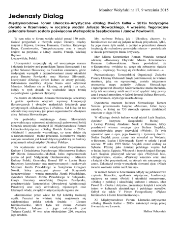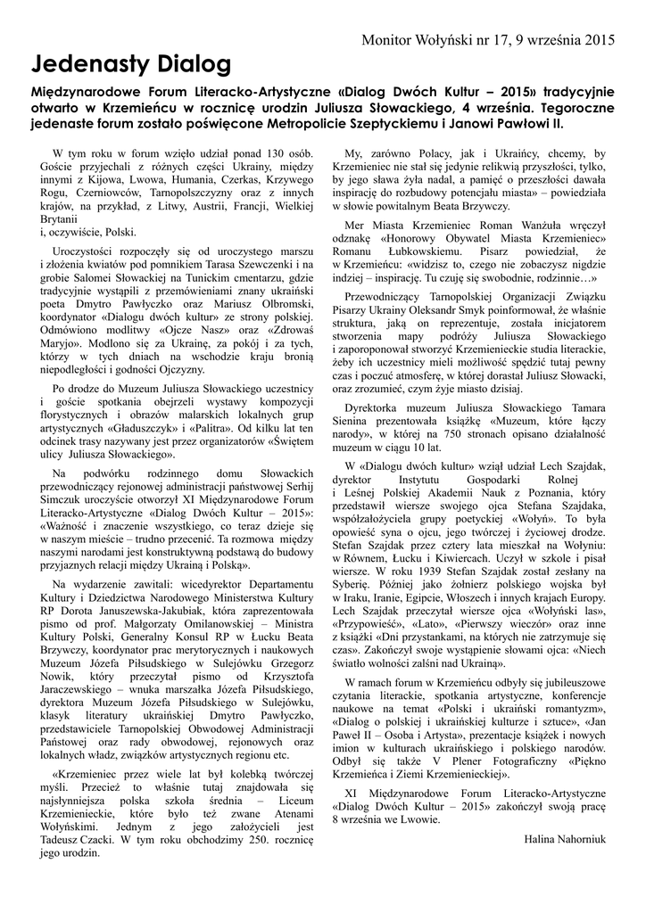 Monitor Wołyński nr 17, 9 września 2015 Jedenasty Dialog Międzynarodowe Forum Literacko-Artystyczne «Dialog Dwóch Kultur – 2015» tradycyjnie otwarto w Krzemieńcu w rocznicę urodzin Juliusza Słowackiego, 4 września. Tegoroczne jedenaste forum zostało poświęcone Metropolicie Szeptyckiemu i Janowi Pawłowi II. W tym roku w forum wzięło udział ponad 130 osób. Goście przyjechali z różnych części Ukrainy, między innymi z Kijowa, Lwowa, Humania, Czerkas, Krzywego Rogu, Czerniowców, Tarnopolszczyzny oraz z innych krajów, na przykład, z Litwy, Austrii, Francji, Wielkiej Brytanii i, oczywiście, Polski. Uroczystości rozpoczęły się od uroczystego marszu i złożenia kwiatów pod pomnikiem Tarasa Szewczenki i na grobie Salomei Słowackiej na Tunickim cmentarzu, gdzie tradycyjnie wystąpili z przemówieniami znany ukraiński poeta Dmytro Pawłyczko oraz Mariusz Olbromski, koordynator «Dialogu dwóch kultur» ze strony polskiej. Odmówiono modlitwy «Ojcze Nasz» oraz «Zdrowaś Maryjo». Modlono się za Ukrainę, za pokój i za tych, którzy w tych dniach na wschodzie kraju bronią niepodległości i godności Ojczyzny. Po drodze do Muzeum Juliusza Słowackiego uczestnicy i goście spotkania obejrzeli wystawy kompozycji florystycznych i obrazów malarskich lokalnych grup artystycznych «Gładuszczyk» i «Palitra». Od kilku lat ten odcinek trasy nazywany jest przez organizatorów «Świętem ulicy Juliusza Słowackiego». Na podwórku rodzinnego domu Słowackich przewodniczący rejonowej administracji państwowej Serhij Simczuk uroczyście otworzył XI Międzynarodowe Forum Literacko-Artystyczne «Dialog Dwóch Kultur – 2015»: «Ważność i znaczenie wszystkiego, co teraz dzieje się w naszym mieście – trudno przecenić. Ta rozmowa między naszymi narodami jest konstruktywną podstawą do budowy przyjaznych relacji między Ukrainą i Polską». Na wydarzenie zawitali: wicedyrektor Departamentu Kultury i Dziedzictwa Narodowego Ministerstwa Kultury RP Dorota Januszewska-Jakubiak, która zaprezentowała pismo od prof. Małgorzaty Omilanowskiej – Ministra Kultury Polski, Generalny Konsul RP w Łucku Beata Brzywczy, koordynator prac merytorycznych i naukowych Muzeum Józefa Piłsudskiego w Sulejówku Grzegorz Nowik, który przeczytał pismo od Krzysztofa Jaraczewskiego – wnuka marszałka Józefa Piłsudskiego, dyrektora Muzeum Józefa Piłsudskiego w Sulejówku, klasyk literatury ukraińskiej Dmytro Pawłyczko, przedstawiciele Tarnopolskiej Obwodowej Administracji Państowej oraz rady obwodowej, rejonowych oraz lokalnych władz, związków artystycznych regionu etc. «Krzemieniec przez wiele lat był kolebką twórczej myśli. Przecież to właśnie tutaj znajdowała się najsłynniejsza polska szkoła średnia – Liceum Krzemienieckie, które było też zwane Atenami Wołyńskimi. Jednym z jego założycieli jest Tadeusz Czacki. W tym roku obchodzimy 250. rocznicę jego urodzin. My, zarówno Polacy, jak i Ukraińcy, chcemy, by Krzemieniec nie stał się jedynie relikwią przyszłości, tylko, by jego sława żyła nadal, a pamięć o przeszłości dawała inspirację do rozbudowy potencjału miasta» – powiedziała w słowie powitalnym Beata Brzywczy. Mer Miasta Krzemieniec Roman Wanżuła wręczył odznakę «Honorowy Obywatel Miasta Krzemieniec» Romanu Łubkowskiemu. Pisarz powiedział, że w Krzemieńcu: «widzisz to, czego nie zobaczysz nigdzie indziej – inspirację. Tu czuję się swobodnie, rodzinnie…» Przewodniczący Tarnopolskiej Organizacji Związku Pisarzy Ukrainy Oleksandr Smyk poinformował, że właśnie struktura, jaką on reprezentuje, została inicjatorem stworzenia mapy podróży Juliusza Słowackiego i zaporoponował stworzyć Krzemienieckie studia literackie, żeby ich uczestnicy mieli możliwość spędzić tutaj pewny czas i poczuć atmosferę, w której dorastał Juliusz Słowacki, oraz zrozumieć, czym żyje miasto dzisiaj. Dyrektorka muzeum Juliusza Słowackiego Tamara Sienina prezentowała książkę «Muzeum, które łączy narody», w której na 750 stronach opisano działalność muzeum w ciągu 10 lat. W «Dialogu dwóch kultur» wziął udział Lech Szajdak, dyrektor Instytutu Gospodarki Rolnej i Leśnej Polskiej Akademii Nauk z Poznania, który przedstawił wiersze swojego ojca Stefana Szajdaka, współzałożyciela grupy poetyckiej «Wołyń». To była opowieść syna o ojcu, jego twórczej i życiowej drodze. Stefan Szajdak przez cztery lata mieszkał na Wołyniu: w Równem, Łucku i Kiwiercach. Uczył w szkole i pisał wiersze. W roku 1939 Stefan Szajdak został zesłany na Syberię. Później jako żołnierz polskiego wojska był w Iraku, Iranie, Egipcie, Włoszech i innych krajach Europy. Lech Szajdak przeczytał wiersze ojca «Wołyński las», «Przypowieść», «Lato», «Pierwszy wieczór» oraz inne z książki «Dni przystankami, na których nie zatrzymuje się czas». Zakończył swoje wystąpienie słowami ojca: «Niech światło wolności zalśni nad Ukrainą». W ramach forum w Krzemieńcu odbyły się jubileuszowe czytania literackie, spotkania artystyczne, konferencje naukowe na temat «Polski i ukraiński romantyzm», «Dialog o polskiej i ukraińskiej kulturze i sztuce», «Jan Paweł II – Osoba i Artysta», prezentacje książek i nowych imion w kulturach ukraińskiego i polskiego narodów. Odbył się także V Plener Fotograficzny «Piękno Krzemieńca i Ziemi Krzemienieckiej». XI Międzynarodowe Forum Literacko-Artystyczne «Dialog Dwóch Kultur – 2015» zakończył swoją pracę 8 września we Lwowie. Halina Nahorniuk