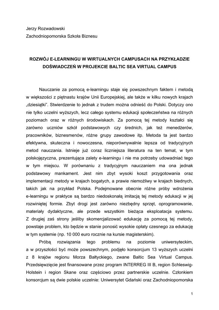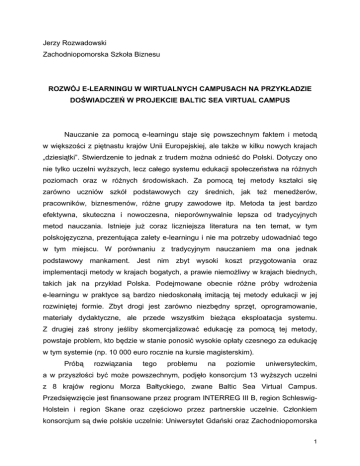 Jerzy Rozwadowski Zachodniopomorska Szkoła Biznesu ROZWÓJ E-LEARNINGU W WIRTUALNYCH CAMPUSACH NA PRZYKŁADZIE DOŚWIADCZEŃ W PROJEKCIE BALTIC SEA VIRTUAL CAMPUS Nauczanie za pomocą e-learningu staje się powszechnym faktem i metodą w większości z piętnastu krajów Unii Europejskiej, ale także w kilku nowych krajach „dziesiątki”. Stwierdzenie to jednak z trudem można odnieść do Polski. Dotyczy ono nie tylko uczelni wyższych, lecz całego systemu edukacji społeczeństwa na różnych poziomach oraz w różnych środowiskach. Za pomocą tej metody kształci się zarówno uczniów szkół podstawowych czy średnich, jak też menedżerów, pracowników, biznesmenów, różne grupy zawodowe itp. Metoda ta jest bardzo efektywna, skuteczna i nowoczesna, nieporównywalnie lepsza od tradycyjnych metod nauczania. Istnieje już coraz liczniejsza literatura na ten temat, w tym polskojęzyczna, prezentująca zalety e-learningu i nie ma potrzeby udowadniać tego w tym miejscu. W porównaniu z tradycyjnym nauczaniem ma ona jednak podstawowy mankament. Jest nim zbyt wysoki koszt przygotowania oraz implementacji metody w krajach bogatych, a prawie niemożliwy w krajach biednych, takich jak na przykład Polska. Podejmowane obecnie różne próby wdrożenia e-learningu w praktyce są bardzo niedoskonałą imitacją tej metody edukacji w jej rozwiniętej formie. Zbyt drogi jest zarówno niezbędny sprzęt, oprogramowanie, materiały dydaktyczne, ale przede wszystkim bieżąca eksploatacja systemu. Z drugiej zaś strony jeśliby skomercjalizować edukację za pomocą tej metody, powstaje problem, kto będzie w stanie ponosić wysokie opłaty czesnego za edukację w tym systemie (np. 10 000 euro rocznie na kursie magisterskim). Próbą rozwiązania tego problemu na poziomie uniwersyteckim, a w przyszłości być może powszechnym, podjęło konsorcjum 13 wyższych uczelni z 8 krajów regionu Morza Bałtyckiego, zwane Baltic Sea Virtual Campus. Przedsięwzięcie jest finansowane przez program INTERREG III B, region SchleswigHolstein i region Skane oraz częściowo przez partnerskie uczelnie. Członkiem konsorcjum są dwie polskie uczelnie: Uniwersytet Gdański oraz Zachodniopomorska 1 Szkoła Biznesu ze Szczecina. Można zaryzykować stwierdzenie, że jest to przedsięwzięcie unikalne w skali europejskiej i chyba światowej, ponieważ różne państwa, posługujące się różnymi językami, systemami edukacji, odmienną mentalnością, kulturą, tradycją, nawykami, nakładami na edukację próbują stworzyć wspólny system (sieć) nauczania z zastosowaniem wspólnego programu, wspólnych dyplomów, języka, systemu ocen oraz zbliżonego systemu finansowania. Poprzez wspólne przedsięwzięcie próbują także obniżyć koszty funkcjonowania konsorcjum i całego systemu. W tym celu utworzono sformalizowane ciała (instytucje), które powinny czuwać nad bieżącym rozwiązywaniem problemów oraz rozwijaniem campusu w przyszłości. Są to: - Rada Rektorów, składająca się po jednym przedstawicielu z każdej uczelni, wraz z rotującym co dwanaście miesięcy przewodniczącym Rady. Ciało to jest odpowiedzialne za ogólne decyzje konsorcjum oraz przyszłą współpracę; - Komitet Sterujący (Executive Steering Committee) odpowiedzialny za bieżącą współpracę partnerów, podejmowanie operatywnych decyzji oraz przygotowanie spotkań Rady Rektorów. Komitet wybiera także swojego przewodniczącego; - Władze poszczególnych uczelni i wydziału, zajmujące się wdrażaniem decyzji Rady Rektorów i Komitetu, a także implementacją i rozwijaniem e-learningu w swoim środowisku. Główne problemy, które trzeba rozwiązać w tak zróżnicowanym środowisku akademickim to przede wszystkim: - odpowiedzialność poszczególnych stron, - problemy wydatków i dochodów, - prawa własności intelektualnej, - poufność i zaufanie, - odpowiedzialność, - problemy techniczne, - problemy usług edukacyjnych, - problemy prawne związane głównie z wdrażaniem wspólnych dyplomów i uznawaniem ich przez poszczególne kraje, - problemy językowe. 2 Zagadnienia te są sukcesywnie omawiane podczas kolejnych spotkań Komitetu Sterującego lub grup roboczych, pracujących nad poszczególnymi elementami programu. Aktualnie konsorcjum Baltic Sea Virtual Campus rozwija program magisterski on-line oraz poszczególne moduły (przedmioty) w czterech specjalnościach: - Zarządzanie Transregionalne, - Inżynieria Przemysłowa, - Zarządzanie Przemysłowe, - Zarządzanie Służbą Zdrowia, - E-Business oraz ICT Management. Każda specjalność zawiera od 10-15 przedmiotów przygotowanych przez różne międzynarodowe zespoły, dobrane spośród pracowników partnerskich uczelni. Każdy przedmiot w przeliczeniu na tradycyjne podręczniki został opisany na 200-400 stronach, a następnie przetworzony w poszczególnych fazach na produkt dostępny w systemie on-line lub off-line - w pierwszym okresie dla studentów, zaś po roku lub dwóch latach, po niezbędnych uzupełnieniach i poprawkach, także dla innych grup odbiorców. Poszczególne przedmioty mają swój numer ewidencyjny, wartość punktów kredytowych ECTS, nazwę autora prowadzącego, termin rozpoczęcia, odpowiedzialny uniwersytet oraz cenę (która jest inna dla starych i nowych krajów UE). Odbiorcy (studenci) mogą korzystać z tak skonstruowanego (w ogólnym zarysie) programu niezależnie od miejsca, czasu, a także uniwersytetu. Widać to na poniższym schemacie: UNIWERSYTET UNIWERSYTET UNIWERSYTET UNIWERSYTET ... PLATFORMA E-LEARNINGOWA KLIENCI STUDENCI 3 Tak pomyślane konsorcjum pozwala również na realizację wielu celów edukacyjnych sformułowanych w różnych dokumentach Unii Europejskiej, Deklaracji Bolońskiej czy Strategii Lizbońskiej. Pozwala ono także na bliską współpracę instytucji naukowych różnych krajów z zachowaniem ich autonomicznego statusu. Stanowi też praktyczny przykład tworzenia Europejskiej Przestrzeni Edukacyjn