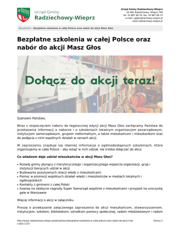 Urząd Gminy Radziechowy-Wieprz 34-381 Radziechowy, Wieprz 700 tel. 33 867 66 10, fax. 33 867 66 13 e-mail: [email protected] www.radziechowy-wieprz.pl Aktualności › Bezpłatne szkolenia w całej Polsce oraz nabór do akcji Masz Głos Bezpłatne szkolenia w całej Polsce oraz nabór do akcji Masz Głos Szanowni Państwo, Wraz z rozpoczęciem naboru do tegorocznej edycji akcji Masz Głos zachęcamy Państwa do przekazania informacji o naborze i o szkoleniach lokalnym organizacjom pozarządowym, instytucjom samorządowym, grupom nieformalnym, a także mieszkańcom i mieszkankom oraz do podjęcia z nimi wspólnych działań w ramach akcji. W zaproszeniu znajduje się również informacja o ogólnodostępnych szkoleniach, które organizujemy w całej Polsce – aby wziąć w nich udział, nie trzeba dołączać do akcji. Co władzom daje udział mieszkańców w akcji Masz Głos? ● ● ● ● ● Rozwój gminy płynący z merytorycznego i organizacyjnego wsparcia organizacji, grup i instytucji biorących udział w akcji Budowanie pozytywnych relacji władz z mieszkańcami Pomoc w promocji wspólnych działań władz i mieszkańców w mediach lokalnych i ogólnopolskich Kontakty z gminami z całej Polski Szansę na zdobycie nagrody Super Samorząd wspólnie z mieszkańcami i przyjazd na uroczystą galę w Warszawie Więcej informacji o akcji w załączniku. Proszę o przekazanie załączonego zaproszenia do akcji mieszkańcom, stowarzyszeniom, instytucjom, szkołom, bibliotekom, ośrodkom pomocy społecznej, radom młodzieżowym i radom http://www.radziechowy-wieprz.pl/aktualnosci/bezplatne-szkolenia-w-calej-polsce-oraz-nabor-do-akcji-mas z-glos,1125 Strona 1 Urząd Gminy Radziechowy-Wieprz 34-381 Radziechowy, Wieprz 700 tel. 33 867 66 10, fax. 33 867 66 13 e-mail: [email protected] www.radziechowy-wieprz.pl Aktualności › Bezpłatne szkolenia w całej Polsce oraz nabór do akcji Masz Głos seniorów, uniwersytetom trzeciego wieku, kołom gospodyń wiejskich i innym organizacjom i instytucjom działającym na Państwa terenie. Z poważaniem, Zofia Nawrocka -Zofia Nawrocka tel. 22 536 02 62 604 096 510 Masz Głos maszglos.pl facebook.com/maszglos Fundacja im. Stefana Batorego batory.org.pl facebook.com/FundacjaBatorego http://www.radziechowy-wieprz.pl/aktualnosci/bezplatne-szkolenia-w-calej-polsce-oraz-nabor-do-akcji-mas z-glos,1125 Strona 2