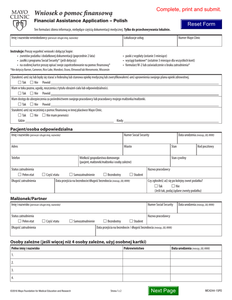 Complete, print and submit. Wniosek o pomoc finansową Financial Assistance Application – Polish Reset Form Ten formularz zbiera informacje, niebędące częścią dokumentacji medycznej. Tylko do przechowywania lokalnie. Imię i nazwisko wnioskodawcy (pierwsze i drugie imię, nazwisko) Lokalizacje usług Numer Mayo Clinic Instrukcje: Proszę wypełnić wniosek i dołączyć kopie: • zwrotów podatku i dodatkowej dokumentacji (poprzednie 2 lata) • zasiłki z programu Social Security* (jeśli dotyczy) • na osobnej kartce proszę opisać swoje zapotrzebowanie na pomoc finansową* • paski z wypłaty (ostanie 3 miesiące) • wyciągi bankowe* (ostatnie 3 miesiące dla wszystkich kont) • formularz W-2 lub zaświadczenie o braku zatrudnienia* *Nie dotyczy Barron, Cameron, Rice Lake, Mondovi, Osseo, Elmwood lub Menomonie, Wisconsin Starałem(-am) się lub będę się starać o federalną lub stanowa opiekę medyczną lub zweryfikowałem(-am) uprawnienia swojego planu opieki zdrowotnej. Tak Nie Powód Mam w toku pozew, ugodę, roszczenia z tytułu obrażeń ciała lub odpowiedzialności. Tak Nie Powód Mam dostęp do ubezpieczenia za pośrednictwem swojego pracodawcy lub pracodawcy mojego małżonka/małżonki. Tak Nie Powód Starałem(-am) się wcześniej o pomoc finansową w innej placówce Mayo Clinic. Tak Nie Nie mam pewności Gdzie Kiedy Pacjent/osoba odpowiedzialna Imię i nazwisko (pierwsze i drugie imię, nazwisko) Numer Social Security Adres Miasto Telefon Status zatrudnienia Pełen etat Data urodzenia (miesiąc, DD, RRRR) Stan Wielkość gospodarstwa domowego (pacjent, małżonek/małżonka i osoby zależne) Kod pocztowy Stan cywilny Nazwa pracodawcy Część etatu Długość zatrudnienia Samozatrudnienie Bezrobotny Student Data przejścia na bezrobocie/długość bezrobocia (miesiąc, DD, RRRR) Czy zgłosiłeś(-aś) się po kolejny zwrot podatku? Tak Nie (Jeśli tak, podaj żądane zwroty podatku) Małżonek/Partner Imię i nazwisko (pierwsze i drugie imię, nazwisko) Status zatrudnienia Pełen etat Numer Social Security Data urodzenia (miesiąc, DD, RRRR) Nazwa pracodawcy Część etatu Długość zatrudnienia Samozatrudnienie Bezrobotny Student Data przejścia na bezrobocie / długość bezrobocia (miesiąc, DD, RRRR) Osoby zależne (jeśli więcej niż 4 osoby zależne, użyj osobnej kartki) Pełne imię i nazwisko Pokrewieństwo Data urodzenia (miesiąc, DD, RRRR) 1. 2. 3. 4. ©2016 Mayo Foundation for Medical Education and Research Strona 1 z 2 Next Page MC4244-15PO Imię i nazwisko wnioskodawcy (pierwsze i drugie imię, nazwisko) Numer Mayo Clinic Konto(-a) bankowe Nie dotyczy Barron, Cameron, Rice Lake, Mondovi, Osseo, Elmwood lub Menomonie, Wisconsin Nazwa banku Typ konta Nazwa banku Typ konta Bieżące Bieżące Oszczędnościowe Oszczędnościowe Inne inwestycje i zabezpieczenia Inne inwestycje i zabezpieczenia Nieruchomość Nie dotyczy Barron, Cameron, Rice Lake, Mondovi, Osseo, Elmwood lub Menomonie, Wisconsin Typ Szczegóły Szacowana wartość Nieuregulowane saldo Drugie mieszkanie/domek wakacyjny Ziemia Liczba akrów Nieruchomość na wynajem Wyposażenie firmy/farmy Inne/Kamper Proszę udokumentować którekolwiek z poniższych źródeł dochodu Opis dochodu Źródło Miesięczna kwota dochodu Akcje/dywidendy Renta/emerytura Wynajem/nieruchomość Niepełnosprawność Alimenty/zasiłek na dziecko Inne Ubezpieczenie Typ Polisa u Miesięczna płatność Zdrowotne Dług za usługi medyczne Typ Lekarz medycyny Szpital U kogo Nieuregulowane saldo Miesięczna płatność Inne Oświadczenie Oświadczam, że wszystkie podane informacje są prawdziwe i poprawne według mojej najlepszej wiedzy. Rozumiem, że informacje te zostaną użyte do potwierdzenia mojej zdolności zapłaty za usługi świadczone przez Mayo Clinic lub powiązanej jednostki; udzielam zezwolenia Mayo Clinic i wszystkim powiązanym klinikom, szpitalom oraz jednostkom na udostępnianie tych informacji w razie potrzeby, aby rozpatrzeć moją prośbę o pomoc finansową. Niniejszym udzielam pozwolenia Mayo Clinic, wszystkim podmiotom powiązanym i przedstawicielom lub agentom Mayo Clinic na sprawdzenie zawartych tu informacji oraz na otrzymanie raportów o zdolności kredytowej. Podpis pacjenta/strony odpowiedzialnej Data (miesiąc, DD, RRRR) Signature Required Podpis małżonka/partnera Data (miesiąc, DD, RRRR) Signature Required Previous Page Strona 2 z 2 Print MC4244-15PO