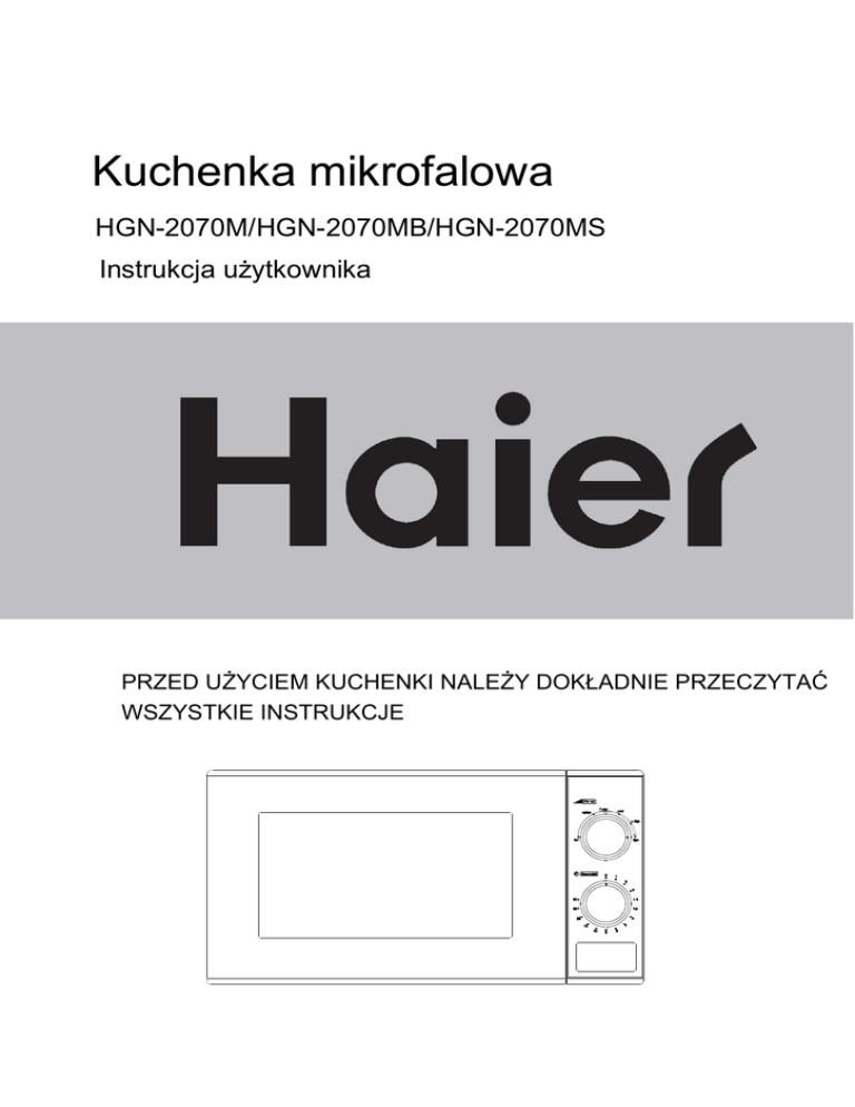 Kuchenka mikrofalowa HGN-2070M/HGN-2070MB/HGN-2070MS Instrukcja użytkownika PRZED UŻYCIEM KUCHENKI NALEŻY DOKŁADNIE PRZECZYTAĆ WSZYSTKIE INSTRUKCJE WAŻNE WSKAZÓWKI BEZPIECZEŃSTWA – NALEŻY DOKŁADNIE PRZECZYTAĆ I ZACHOWAĆ W CELU UŻYCIA W PRZYSZŁOŚCI - OSTRZEŻENIE: gdy urządzenie jest wykorzystywane w trybie kombinowanym, dzieci powinny używać kuchenki jedynie pod nadzorem dorosłych z uwagi na wysokie temperatury powstające podczas eksploatacji; - OSTRZEŻENIE: jeżeli drzwi lub uszczelka drzwi jest uszkodzona, nie należy używać kuchenki aż do momentu naprawy przez wykwalifikowaną osobę; - OSTRZEŻENIE: przeprowadzanie czynności serwisowych lub napraw, które obejmują demontaż osłony chroniącej przed działaniem energii mikrofal przez niewykwalifikowane osoby jest niebezpieczne; - OSTRZEŻENIE: płynów i innych artykułów spożywczych nie należy podgrzewać w szczelnie zamkniętych pojemnikach, ponieważ mogą wybuchnąć; - OSTRZEŻENIE: dzieciom można pozwolić na samodzielne korzystanie z kuchenki tylko wówczas, gdy otrzymały odpowiednie instrukcje, są w stanie korzystać z produktu w sposób bezpieczny i rozumieją zagrożenia płynące z niewłaściwej obsługi; - należy używać wyłącznie naczyń przeznaczonych do kuchenek mikrofalowych; - podczas podgrzewania żywności w pojemnikach plastikowych lub papierowych należy nadzorować pracę kuchenki mikrofalowej z uwagi na możliwość zapłonu; - w przypadku zaobserwowania dymu należy wyłączyć urządzenie lub odłączyć je od zasilania, nie należy otwierać drzwiczek, aby stłumić płomienie; - podgrzewanie napojów w kuchence mikrofalowej może spowodować opóźniony wybuch gorącej cieczy, dlatego należy zachować ostrożność przy przenoszeniu naczynia z podgrzanym napojem; - zawartość butelek do karmienia oraz słoiczków z żywnością dla niemowląt przed podaniem dziecku należy zamieszać lub wstrząsnąć i sprawdzić temperaturę pokarmu, aby uniknąć poparzeń; - jajek w skorupkach oraz całych jajek ugotowanych na twardo nie należy podgrzewać w kuchence mikrofalowej, ponieważ mogą wybuchnąć nawet, gdy cykl podgrzewania w kuchence mikrofalowej został już zakończony; - kuchenkę mikrofalową należy regularnie czyścić i usuwać wszelkie pozostałości żywności; - brak dbałości o czystość kuchenki może doprowadzić do pogorszenia się stanu jej powierzchni, co może skrócić żywotność urządzenia i prowadzić do niebezpiecznych sytuacji; - jeżeli kabel zasilający ulegnie uszkodzeniu, musi być wymieniony przez producenta, jego agenta serwisowego lub podobnie wykwalifikowanego technika, co pozwoli uniknąć zagrożenia. - temperatura powierzchni urządzenia podczas pracy może być wysoka. -2- DANE TECHNICZNE Zużycie prądu: 230-240V~50Hz, 1200 W Moc: 700 W Częstotliwość robocza: 2450 MHz Wymiary zewnętrzne: 452 mm (szer.) X 337 mm (gł.) X 262 mm (wys.) Wymiary wnętrza kuchenki: 315 mm (szer.) X 297 mm (gł.) X 198mm (wys.) Pojemność kuchenki: 20 litrów Ciężar: ok. 10.5 kg ZANIM ZADZWONISZ DO SERWISU 1. Jeżeli kuchenka całkowicie nie działa, nie zaświeca się wyświetlacz lub wyświetlacz gaśnie: a) Należy sprawdzić, czy kuchenka działają one poprawnie, za pomocą innego urządzenia należy sprawdzić gniazdko elektryczne. jest prawidłowo 2. Jeżeli nie działa włącznik kuchenki mikrofalowej: podłączona do zasilania. Jeżeli nie, należy wyjąć wtyczkę z a) Sprawdzić, czy ustawiony jest programator czasowy. gniazda elektrycznego, odczekać 10 sekund i prawidłowo b) Sprawdzić, czy drzwiczki są prawidłowo zamknięte i włożyć wtyczkę do gniazdka. zaryglowane przez blokady bezpieczeństwa. W Sprawdzić, czy w obwodzie nie występuje przepalony przeciwnym razie energia mikrofal nie popłynie do bezpiecznik lub automatyczny wyłącznik zasilania. Jeżeli wnętrza kuchenki. JEŻELI POWYŻSZE WSKAZÓWKI NIE ROZWIĄZĄ PROBLEMU, NALEŻY SKONTAKTOWAĆ SIĘ Z AUTORYZOWANYM PUNKTEM SERWISOWYM. Uwaga: Urządzenie jest przeznaczone tylko do użytku domowego do podgrzewania żywności i napojów za pomocą energii elektromagnetycznej i należy je stosować tylko wewnątrz pomieszczeń. ZAKŁÓCENIA RADIOWE Kuchenka mikrofalowa może zakłócać odbiór radioodbiornika, telewizora lub podobnych urządzeń. Jeżeli występują zakłócenia, można je wyeliminować lub zmniejszyć w następujący sposób. a. Wyczyścić drzwiczki i powierzchnię uszczelki w kuchence mikrofalowej. b. Ustawić radioodbiornik, telewizor itp. możliwie jak najdalej od kuchenki mikrofalowej. c. Używać właściwie zainstalowanej anteny do radioodbiornika, telewizora itp., aby zapewnić odbiór silnego sygnału. -3- 3. Kuchenka mikrofalowa waży 12 kg i należy ją ustawić INSTALACJA na płaskiej powierzchni, która utrzyma taki ciężar. 1. Sprawdzić, czy wszystkie materiały opakowania zostały 4. Kuchenkę mikrofalową należy ustawić z dala od zdjęte z wnętrza drzwiczek. 2. Po rozpakowaniu wzrokową należy urządzenia przeprowadzić pod kątem wysokich temperatur i pary wodnej. kontrolę 5. NIE NALEŻY USTAWIAĆ żadnych przedmiotów na widocznych wierzchu urządzenia. uszkodzeń, takich, jak: 6. Kuchenkę należy ustawiać przynajmniej 5 cm od - Niedopasowane drzwiczki bocznej ściany i 10 cm od tylnej ściany, aby zapewnić - Uszkodzone drzwiczki dobrą wentylację. - Wgniecenia lub dziury w drzwiczkach, wyszczerbienie 7.NIE NALEŻY DEMONTOWAĆ wału napędzającego szyby i uszkodzenie wyświetlacza talerza obrotowego. - Wgniecenia wewnątrz 8. Podobnie, jak w przypadku innych urządzeń, należy Jeżeli widoczne będzie jakiekolwiek uszkodzenie z ściśle nadzorować ich używanie przez dzieci. wymienionych powyżej, NIE NALEŻY używać kuchenki. OSTRZEŻENIE – URZĄDZENIE WYMAGA UZIEMIENIA 1. Gniazdo elektryczne powinno znajdować się w miejscu umożliwiającym łatwe podłączenie przewodu zasilającego. 2. Kuchenka wymaga mocy wej