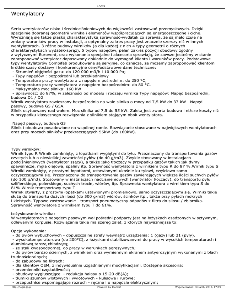 LOGIS Wentylatory Seria wentylatorów nisko i średniociśnieniowych do większości zastosowań przemysłowych. Dzięki specjalnie dobranej geometrii wirnika i elementów współpracujących są energooszczędne i ciche. Wyróżniają się także płaską charakterystyką sprawność-wydatek co sprawia, że są mało czułe na zmiany warunków pracy w instalacji, a optymalny zakres pracy jest znacznie szerszy niż w innych wentylatorach. 3 różne budowy wirników (a dla każdej z nich 4 typy geometrii o różnych charakterystykach wydatek-spręż), 5 typów napędów, pełen zakres pozycji obudowy zgodny z wytycznymi Eurovent, oraz wykonania specjalne i akcesoria sprawiają, że zawsze jesteśmy w stanie zaproponować wentylator dopasowany dokładnie do wymagań klienta i warunków pracy. Podstawowe typy wentylatorów Combifab produkowane są seryjnie, co oznacza, że możemy zaproponować klientom krótkie czasy dostawy i konkurencyjne cenyPodstawowe dane techniczne: - Strumień objętości gazu: do 120 000 m3/h i 10 000 Pa; - Typy napędów : bezpośredni lub przekładniowy - Temperatura pracy wentylatora z napędem pośrednim: do 250 °C, - Temperatura pracy wentylatora z napędem bezpośrednim: do 80 °C. - Maksymalna moc silnika: 160 kW - Sprawność: do 87%, w zależności od modelu i rodzaju wirnika Typy napędów: Napęd bezpośredni, budowa D1 / D2 Wirnik wentylatora zawieszony bezpośrednio na wale silnika o mocy od 7,5 kW do 37 kW Napęd pasowy, budowa G5 / G5A. Silnik usytuowany nad wałem. Moc silnika od 7,5 do 55 kW. Zaletą jest zwarta budowa i niższe koszty niż w przypadku klasycznego rozwiązania z silnikiem stojącym obok wentylatora. Napęd pasowy, budowa G3 Silnik i obudowa posadowione na wspólnej ramie. Rozwiązanie stosowane w największych wentylatorach oraz przy mocach silników przekraczających 55kW (do 160kW). Typy wirników: Wirnik typu R Wirnik zamknięty, z łopatkami wygiętymi do tyłu. Przeznaczony do transportowania gazów czystych lub o niewielkiej zawartości pyłów (do 40 g/m3). Zwykle stosowany w instalacjach podciśnieniowych (wentylator ssący), a także jako tłoczący w przypadku gazów takich jak dymy spawalnicze, mgła olejowa, spaliny itp. Sprawność wentylatora z wirnikiem typu R do 87 %.Wirnik typu S Wirniki zamknięty, z prostymi łopatkami, ustawionymi ukośnie ku tyłowi, częściowo samo oczyszczającymi się. Przeznaczony do transportowania gazów zawierających większe ilości suchych pyłów (do 100 g/m3). Stosowany w instalacjach nadciśnieniowych (wentylator tłoczący), do transportu pyłu szlifierskiego, polerskiego, suchych trocin, wiórów, itp. Sprawność wentylatora z wirnikiem typu S do 81%.Wirnik transportowy typu T Wirnik otwarty, z prostymi łopatkami ustawionymi promieniowo, samo oczyszczającymi się. Wirniki takie służą do transportu dużych ilości (do 500 g/m3) wiórów, ścinków itp., także przy pyłach mokrych i kleistych. Typowe zastosowanie - transport pneumatyczny odpadów z filtra do silosu / zbiornika. Sprawność wentylatora z wirnikiem typu T do 61%. Łożyskowanie wirnika: W wentylatorach z napędem pasowym wał pośredni podparty jest na łożyskach osadzonych w sztywnym, odlewanym korpusie. Rozwiązanie takie ma szereg zalet, z których najważniejsze to: Opcje wykonania: - do pyłów wybuchowych - dopuszczalne strefy wewnątrz urządzenia: 1 (gazy) lub 21 (pyły). - wysokotemperaturowa (do 200°C), z łożyskami stabilizowanymi do pracy w wysokich temperaturach i aluminiową tarczą chłodzącą; - ze stali kwasoodpornej, do pracy w warunkach agresywnych; - do pyłów bardzo ściernych, z wirnikiem oraz wymiennym ekranem antyerozyjnym wykonanymi z blach trudnościeralnych; - do zabudowy na filtrach; - dla klientów OEM, z indywidualnie uzgadnianymi modyfikacjami. Dostępne akcesoria: - przemienniki częstotliwości; - obudowy wygłuszające - redukcja hałasu o 15-20 dB(A); - tłumiki szumów wlotowych i wylotowych - kulisowe i rurowe; - przepustnice wspomagające rozruch - ręczne i o napędzie elektrycznym; http://logis-jp.pl Powered by Joomla! Wygenerowano: 3 March, 2017, 17:09 LOGIS - segmentowe aparaty regulacyjne - ręczne i o napędzie elektrycznym - do precyzyjnej regulacji wydatku i sprężu; - ramy wibroizolacyjne; http://logis-jp.pl Powered by Joomla! Wygenerowano: 3 March, 2017, 17:09