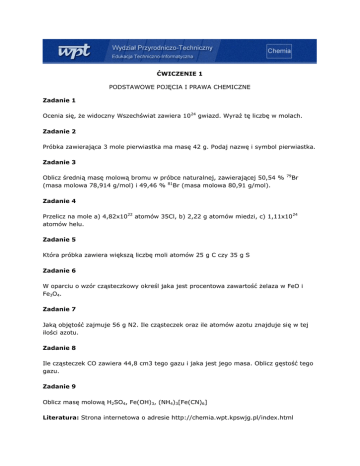 ĆWICZENIE 1 PODSTAWOWE POJĘCIA I PRAWA CHEMICZNE Zadanie 1 Ocenia się, że widoczny Wszechświat zawiera 1024 gwiazd. Wyraź tę liczbę w molach. Zadanie 2 Próbka zawierająca 3 mole pierwiastka ma masę 42 g. Podaj nazwę i symbol pierwiastka. Zadanie 3 Oblicz średnią masę molową bromu w próbce naturalnej, zawierającej 50,54 % (masa molowa 78,914 g/mol) i 49,46 % 81Br (masa molowa 80,91 g/mol). 79 Br Zadanie 4 Przelicz na mole a) 4,82x1022 atomów 35Cl, b) 2,22 g atomów miedzi, c) 1,11x10 24 atomów helu. Zadanie 5 Która próbka zawiera większą liczbę moli atomów 25 g C czy 35 g S Zadanie 6 W oparciu o wzór cząsteczkowy określ jaka jest procentowa zawartość żelaza w FeO i Fe3O4. Zadanie 7 Jaką objętość zajmuje 56 g N2. Ile cząsteczek oraz ile atomów azotu znajduje się w tej ilości azotu. Zadanie 8 Ile cząsteczek CO zawiera 44,8 cm3 tego gazu i jaka jest jego masa. Oblicz gęstość tego gazu. Zadanie 9 Oblicz masę molową H2SO4, Fe(OH)3, (NH4)3[Fe(CN)6] Literatura: Strona internetowa o adresie http://chemia.wpt.kpswjg.pl/index.html