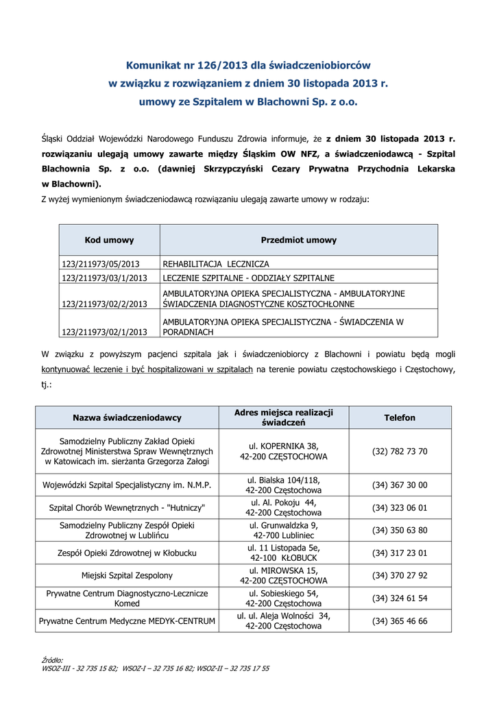 Komunikat nr 126/2013 dla świadczeniobiorców w związku z rozwiązaniem z dniem 30 listopada 2013 r. umowy ze Szpitalem w Blachowni Sp. z o.o. Śląski Oddział Wojewódzki Narodowego Funduszu Zdrowia informuje, że z dniem 30 listopada 2013 r. rozwiązaniu ulegają umowy zawarte między Śląskim OW NFZ, a świadczeniodawcą - Szpital Blachownia Sp. z o.o. (dawniej Skrzypczyński Cezary Prywatna Przychodnia Lekarska w Blachowni). Z wyżej wymienionym świadczeniodawcą rozwiązaniu ulegają zawarte umowy w rodzaju: Kod umowy Przedmiot umowy 123/211973/05/2013 REHABILITACJA LECZNICZA 123/211973/03/1/2013 LECZENIE SZPITALNE - ODDZIAŁY SZPITALNE 123/211973/02/2/2013 AMBULATORYJNA OPIEKA SPECJALISTYCZNA - AMBULATORYJNE ŚWIADCZENIA DIAGNOSTYCZNE KOSZTOCHŁONNE 123/211973/02/1/2013 AMBULATORYJNA OPIEKA SPECJALISTYCZNA - ŚWIADCZENIA W PORADNIACH W związku z powyższym pacjenci szpitala jak i świadczeniobiorcy z Blachowni i powiatu będą mogli kontynuować leczenie i być hospitalizowani w szpitalach na terenie powiatu częstochowskiego i Częstochowy, tj.: Nazwa świadczeniodawcy Adres miejsca realizacji świadczeń Telefon Samodzielny Publiczny Zakład Opieki Zdrowotnej Ministerstwa Spraw Wewnętrznych w Katowicach im. sierżanta Grzegorza Załogi ul. KOPERNIKA 38, 42-200 CZĘSTOCHOWA (32) 782 73 70 Wojewódzki Szpital Specjalistyczny im. N.M.P. ul. Bialska 104/118, 42-200 Częstochowa (34) 367 30 00 Szpital Chorób Wewnętrznych - "Hutniczy" ul. Al. Pokoju 44, 42-200 Częstochowa (34) 323 06 01 Samodzielny Publiczny Zespół Opieki Zdrowotnej w Lublińcu ul. Grunwaldzka 9, 42-700 Lubliniec (34) 350 63 80 Zespół Opieki Zdrowotnej w Kłobucku ul. 11 Listopada 5e, 42-100 KŁOBUCK (34) 317 23 01 Miejski Szpital Zespolony ul. MIROWSKA 15, 42-200 CZĘSTOCHOWA (34) 370 27 92 Prywatne Centrum Diagnostyczno-Lecznicze Komed ul. Sobieskiego 54, 42-200 Częstochowa (34) 324 61 54 Prywatne Centrum Medyczne MEDYK-CENTRUM ul. ul. Aleja Wolności 34, 42-200 Częstochowa (34) 365 46 66 Źródło: WSOZ-III - 32 735 15 82; WSOZ-I – 32 735 16 82; WSOZ-II – 32 735 17 55 Nazwa świadczeniodawcy Adres miejsca realizacji świadczeń Telefon Polska Grupa Medyczna Spółka z ograniczoną odpowiedzialnością ul. Mickiewicza 12, 42-200 Częstochowa (32) 231 71 51 Niepubliczny Zakład Opieki Zdrowotnej "CombiMed" ul. DEKABRYSTÓW 17/19, 42-200 Częstochowa (34) 322 71 71 Centrum Medyczne Świętego Łukasza ul. Zaciszańska 25a, 42-202 Częstochowa (34) 356 80 76 Centrum Medyczne "Małgorzata" Sp z o.o. ul. Wały Dwernickiego 43/45, 42-200 Częstochowa (34) 368 25 38 oraz z porad w poradniach specjalistycznych u świadczeniodawców działających na terenie powiatu, tj.: Nazwa świadczeniodawcy Samodzielny Publiczny Zakład Opieki Zdrowotnej Miejska Przychodnia Rejonowa Miasto Ulica Telefon Koniecpol Armii Krajowej 2 (34) 355 13 57 Wolności 58 (34) 328 40 10 Gminny Zespół Ośrodków Zdrowia w Poczesnej Mstów KOLONIA POCZESNA Szkolna 3 (34) 327 41 93 Samodzielny Publiczny Zakład Opieki Zdrowotnej Gminny Ośrodek Zdrowia Konopiska Konopiska Lipowa 3 (34) 328 20 07 Lelów Szczekocińska 18 (34) 355 00 10 Mstów 16-go stycznia 14 (34) 329 53 52 BLACHOWNIA SIENKIEWICZA 4 (34) 327 03 78 Stary Cykarzew Częstochowska 23 (34) 328 93 16 Kłomnice Sądowa 27 (34) 328 10 63 Rędziny Działkowiczów 20 (34) 320 14 44 Rędziny Działkowiczów 20 (34) 320 14 43 Soborzyce Strażacka 4 (34) 355 50 11 Kłomnice Strażacka 18 (34) 366 95 27 Kruszyna Kmicica 10 (34) 320 20 30 Przyrów Świętego Mikołaja 47 (34) 355 40 18 NIEPUBLICZNY ZAKŁAD OPIEKI ZDROWOTNEJ PRZYCHODNIA LEKARSKA WITAMINA Koniecpol Zamkowa 1A (34) 355 27 15 Niepubliczny Zakład Opieki Zdrowotnej Ośrodek Zdrowia Łojki Długa 50 (34) 327 10 43 Samodzielny Publiczny Zakład Opieki Zdrowotnej Zespół Ośrodków Zdrowia Gminy Mstów SAMODZIELNY PUBLICZNY ZAKŁAD OPIEKI ZDROWOTNEJ Gminny Ośrodek Zdrowia w Lelowie Niepubliczny Zakład Opieki Zdrowotnej Przychodnia Lekarska „Vena” Niepubliczny Zakład Opieki Zdrowotnej Przychodnia Lekarska ,,BLAMED” sp. z.o.o Niepubliczny Zakład Opieki Zdrowotnej Przychodnia Lekarska Niepubliczny Zakład Opieki Zdrowotnej Przychodnia Medycyny Rodzinnej Niepubliczny Zakład Opieki Zdrowotnej Przychodnia Lekarska lek.med. Agata i Paweł Dydoń s.c. Przychodnia Lekarska OPTIMA E.Zatońska, M.Paczkowska Spółka Jawna NIEPUBLICZNY ZAKŁAD OPIEKI ZDROWOTNEJ PRZYCHODNIA LEKARSKA W SOBORZYCACH Niepubliczny Zakład Opieki Zdrowotnej Przychodnia Lekarska Niepubliczny Zakład Opieki Zdrowotnej Przychodnia Lekarska w Kruszynie Sp. z o.o. Niepubliczny Zakład Opieki Zdrowotnej Ośrodek Zdrowia w Przyrowie Źródło: WSOZ-III - 32 735 15 82; WSOZ-I – 32 735 16 82; WSOZ-II – 32 735 17 55 Nazwa świadczeniodawcy NIEPUBLICZNY ZAKŁAD OPIEKI ZDROWOTNEJ PORADNIA DIABETOLOGICZNA Miasto Ulica Telefon Częstochowa Berka Joselewicza 7 (34) 324 78 41 NZOZ Przychodnia Lekarska -Bogdan Malina Olsztyn Żwirki i Wigury 34 (34) 328 52 34 Przychodnia Medycyny Rodzinnej Borowno Kolonia Armii Ludowej 10 (34) 328 90 55 ANMED GABINET LEKARSKI ANNA MENDAKIEWICZ Janów Żurawska 18 48 601 420 177 GABINET SPECJALISTYCZNO-OKULISTYCZNY REZAMED Wrzosowa Strażacka 27/1 48 608 416 059 CENTRUM Logopedii, Uzależnień i Mediacji Sądowych Edukacja, Profilaktyka, Terapia J. Z. Szeliga s.c. Olsztyn Sienkiewicza 20 (34) 328 51 11 z porad w poradniach rehabilitacyjnych u świadczeniodawców działających na terenie powiatu częstochowskiego, tj.: Nazwa świadczeniodawcy Miasto Ulica Samodzielny Publiczny Zakład Opieki Zdrowotnej Zespół Ośrodków Zdrowia Gminy Janów 42-253 Janów ul. Leśna 3, (34) 327 80 23 Niepubliczny Zakład Opieki Zdrowotnej Przychodnia Lekarska 42-270 Kłomnice ul. Strażacka 18, (34) 366 95 27 Samodzielny Publiczny Zakład Opieki Zdrowotnej Gminny Ośrodek Zdrowia Konopiska 42-274 KONOPISKA ul. Lipowa 3, (34) 328 20 07 Niepubliczny Zakład Opieki Zdrowotnej Beta-Dent 42-244 Mstów ul. Wolności 58B, Przychodnia Medycyny Rodzin
