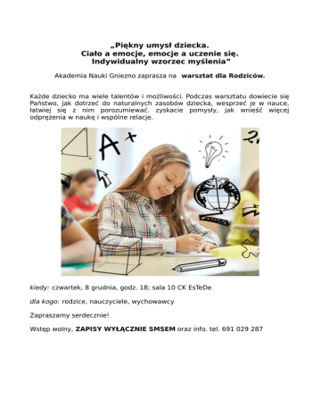 „Piękny umysł dziecka. Ciało a emocje, emocje a uczenie się. Indywidualny wzorzec myślenia” Akademia Nauki Gniezno zaprasza na warsztat dla Rodziców. Każde dziecko ma wiele talentów i możliwości. Podczas warsztatu dowiecie się Państwo, jak dotrzeć do naturalnych zasobów dziecka, wesprzeć je w nauce, łatwiej się z nim porozumiewać. zyskacie pomysły, jak wnieść więcej odprężenia w naukę i wspólne relacje. kiedy: czwartek, 8 grudnia, godz. 18; sala 10 CK EsTeDe dla kogo: rodzice, nauczyciele, wychowawcy Zapraszamy serdecznie! Wstęp wolny, ZAPISY WYŁĄCZNIE SMSEM oraz info. tel. 691 029 287