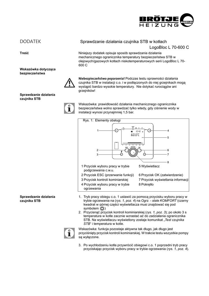 DODATEK Treść Sprawdzanie działania czujnika STB w kotłach LogoBloc L 70-600 C Niniejszy dodatek opisuje sposób sprawdzania działania mechanicznego ogranicznika temperatury bezpieczeństwa STB w olejowych/gazowych kotłach niskotemperaturowych serii LogoBloc L 70600 C Wskazówka dotycząca bezpieczeństwa Niebezpieczeñstwo poparzenia! Podczas testu sprawności działania czujnika STB w instalacji c.o. i w podłączonych do niej grzejnikach mogą wystąpić bardzo wysokie temperatury. Nie dotykać rurociągów ani grzejników! Sprawdzanie działania czujnika STB Wskazówka: prawidłowość działania mechanicznego ogranicznika bezpieczeństwa wolno sprawdzać tylko wtedy, gdy ciśnienie wody w instalacji wynosi przynajmniej 1,5 bar. Rys. 1: Elementy obsługi 1 Przycisk wyboru pracy w trybie podgrzewania c.w.u. 2 Przycisk ESC (przerwanie funkcji) 3 Przycisk kontroli kominiarskiej 4 Przycisk wyboru pracy w trybie ogrzewania Sprawdzanie działania czujnika STB 5 Wyświetlacz 6 Przycisk OK (zatwierdzenie) 7 Przycisk wyświetlania informacji 8 Pokrętło 1. Tryb pracy obiegu c.o. 1 ustawić za pomocą przycisku wyboru pracy w trybie ogrzewania na (rys. 1, poz. 4) na Ogrz. - stale KOMFORT (czarny kwadrat w górnej części wyświetlacza musi znajdować się pod symbolem ) 2. Przycisnąć przycisk kontroli kominiarskiej (rys. 1, poz. 3); po około 3 s temperatura w kotle zacznie wzrastać aż do zadziałania ogranicznika STB. Na wyświetlaczu wyświetlony zostaje komunikat „Test czujnika STB“ i temperatura w kotle. Wskazówka: funkcja pozostaje aktywna tak długo, jak długo jest przyciśnięty przycisk kontroli kominiarskiej. W trakcie testu wszystkie pompy są wyłączone. 3. Po wychłodzeniu kotła przywrócić obiegowi c.o. 1 poprzedni tryb pracy przyciskając przycisk wyboru pracy w trybie ogrzewania (rys. 1, poz. 4). Rys. 2: Odblokowanie ogranicznika temperatury bezpieczeństwa 6,3 AT 1 4. Odblokować ogranicznik temperatury bezpieczeństwa (rys. 2, poz. 1) wciskając go za pomocą wkrętaka. Wymiana ogranicznika temperatury bezpieczeństwa STB Rys. 3: Wymiana ogranicznika temperatury bezpieczeñstwa STB (w przypadku awarii) Osłona panela sterowania pracą kotła Osłona modułu regulacyjnego Zdjąć przednią ściankę obudowy kotła (1) Otworzyć osłonę modułu regulacyjnego (2) Otworzyć zamki (3) i wychylić panel sterowania pracą kotła do przodu (4) Blokady osłony modułu regulacyjnego wcisnąć za pomocą wkrętaka, tak żeby trzpienie wpadły w otwory (5) 5. Moduł regulacyjny wraz z osłoną wychylić do przodu z panela sterowania pracą kotła 6. Zatrzaski w tylnej części modułu regulacyjnego wcisnąć do środka (6) i zdjąć osłonę modułu regulacyjnego (7) 7. Odłączyć przewody przyłączeniowe czujnika STB 8. Odkręcić śruby i wyjąć osłonę czujnika STB wraz z czujnikiem STB (8) 9. Odkręcić nakrętkę sześciokątną w dolnej części osłony czujnika STB i wyjąć czujnik STB 10. Zamontować nowy ogranicznik temperatury bezpieczeństwa i złożyć moduł regulacyjny postępując w odwrotnej kolejności. August Brötje GmbH · Postfach 13 54 · 26171 Rastede Telefon 04402 80-0 · Telefax 04402 80-583 · www.broetje.pl 7305243-01 11.11 1. 2. 3. 4.