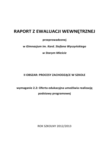 RAPORT Z EWALUACJI WEWNĘTRZNEJ przeprowadzonej w Gimnazjum im. Kard. Stefana Wyszyńskiego w Starym Mieście II OBSZAR: PROCESY ZACHODZĄCE W SZKOLE wymaganie 2.2: Oferta edukacyjna umożliwia realizację podstawy programowej ROK SZKOLNY 2012/2013 Gimnazjum im. Kard. Stefana Wyszyńskiego w Starym Mieście ZESPÓŁ EWALUACYJNY: - Wioletta Dawicka - Jolanta Kowalczyk ADRESACI: - DYREKTOR SZKOŁY - RADA PEDAGOGICZNA - RODZICE UCZNIÓW - UCZNIOWIE DATA SPORZĄDZENIA RAPORTU: CZERWIEC 2013 r. 1. CEL EWALUACJI Pozyskanie informacji w jakim stopniu oferta edukacyjna umożliwia realizacje podstawy programowej pozalekcyjnych, ich oraz ocena atrakcyjności oraz trafności doboru skuteczności w oferty zajęć oddziaływaniu dydaktyczno-wychowawczym. Wnioski z analizy posłużą poprawie jakości pracy szkoły. 2. KRYTERIA EWALUACJI - skuteczność - systematyczność - zgodność i dostępność - powszechność, - efektywność zajęć, - systematyczność, - organizacja zajęć, - atrakcyjność środków i zajęć. Gimnazjum im. Kard. Stefana Wyszyńskiego w Starym Mieście 3. OPIS ZASTOSOWANEJ METODOLOGII ORAZ ŹRÓDŁA INFORMACJI WYKORZYSTANYCH W BADANIU Do zebrania danych posłużyły kwestionariusze ankietowe: - ankiety skierowane do nauczycieli - ankiety skierowane do rodziców uczniów - ankiety skierowane do uczniów - analiza zapisów w dziennikach zajęć pozalekcyjnych - analiza harmonogramu zajęć pozalekcyjnych - wywiad z Dyrektorem szkoły Ankiety zawierały pytania zamknięte i otwarte – co pozwoliło uzyskać szeroki materiał informacyjny. Odpowiedzi udzieliło 111 uczniów (losowo wybranych z każdego oddziału), co stanowi ok. 80% wszystkich uczniów. Zapytano również 40 rodziców (losowo wybranych z każdego oddziału) oraz 18 nauczycieli, czyli niemalże wszystkich zatrudnionych w szkole. Przyjęcie takiej strategii badawczej pozwoliło na zgromadzenie danych stanowiących podstawę do uzyskania obiektywnych wniosków przedstawionych w dalszej części opracowania. Zgromadzony materiał został wykorzystany w analizie niniejszego raportu. Wszyscy badani byli informowani o celach badań, sposobie wykorzystania ich wyników oraz całkowitej anonimowości uzyskanych informacji. Podstawowym ograniczeniem jakie napotkał zespół przeprowadzający badanie, było niekiedy brak chęci do wypełnienia ankiety. Gimnazjum im. Kard. Stefana Wyszyńskiego w Starym Mieście 4. SPOSÓB PREZENTACJI WYNIKÓW - Nauczycielom – na posiedzeniu Rady Pedagogicznej - Uczniom – na szkolnej stronie internetowej - Rodzicom – na szkolnej stronie internetowej Gimnazjum im. Kard. Stefana Wyszyńskiego w Starym Mieście 5. ANALIZA MATERIAŁU BADAWCZEGO W celu zbadania, czy oferta edukacyjna szkoły umożliwia realizacje podstawy programowe przeanalizowana, została ankieta dla nauczycieli „Oferta edukacyjna umożliwia realizację podstawy programowej”. Pyt. 1 (nauczyciele) Oferta edukacyjna wynika z podstawy programowej. 89% ankietowanych nauczycieli twierdzi, że oferta edukacyjna szkoły wynika z obowiązującej podstawy programowej, 11% badanych jest skłonna powiedzieć, że raczej tak. Pyt. 2 (nauczyciele) Oferta edukacyjna odpowiada potrzebom uczniów. 56% respondentów uważa, że oferta edukacyjna raczej odpowiada potrzebom uczniów; zdecydowanie potwierdzających ten fakt jest 44% badanych. Pyt. 3 (nauczyciele) W szkole monitoruje się realizację podstawy programowej. Gimnazjum im. Kard. Stefana Wyszyńskiego w Starym Mieście 56% ankietowanych wybrało najwyższą ocenę, 44% potwierdza, że podstawa programowa jest w szkole monitorowana. Pyt. 4 (nauczyciele) Oferta edukacyjna szkoły jest modyfikowana, wzbogacana i umożliwia rozwój zainteresowań uczniów. Najwyższą ocenę wybrało 22% ankietowanych; 78% badanych jest skłonna przyznać, że oferta szkoły jest modyfikowana, wzbogacana i umożliwia rozwój zainteresowań uczniów. Pyt. 5 (nauczyciele) Szkoła realizuje nowatorskie rozwiązania programowe. Według 83% ankietowanych szkoła raczej realizuje nowatorskie rozwiązania programowe, a 17 % jest pewna, że takie działania mają miejsce. Pyt. 6 (nauczyciele) Czy wybrany przez Panią/Pana program nauczania zawiera treści z podstawy programowej? Gimnazjum im. Kard. Stefana Wyszyńskiego w Starym Mieście 100% badanych nauczycieli deklaruje, że wybrany przez nich program nauczania zawiera w całości treści z podstawy programowej. Pyt. 7 (nauczyciele) W jaki sposób monitoruje Pani/Pan realizację podstawy programowej? 5% nauczycieli nie udzieliło odpowiedzi, pozostali ankietowani potwierdzają monitorowanie realizacji podstawy programowej. Podano zadeklarowano następujące sposoby monitorowania podstawy programowej: - odpowiedni zapis w dokumentacji typu: rozkład materiału, plan dydaktyczny, plan wynikowy (numer treści programowych z podstawy programowej przy każdej jednostce lekcyjnej), - monitorowanie liczby godzin przeprowadzonych zajęć, - wybór podręcznika, którego treści odpowiadają obowiązującej podstawie programowej, - przygotowywanie sprawdzianów, prac klasowych, których tematyka i zagadnienia - są zgodne z podstawą programową, - samokontrola w przygotowywaniu się do zajęć, - co miesięczny zapis w dziennikach lekcyjnych liczby godzin zrealizowanych w danej klasie, - ilościowe sprawozdanie roczne z realizacji podstawy programowej w poszczególnych klasach, - ilościowe sprawozdanie realizacji podstawy programowej każdej w cyklu edukacyjnym, - na koniec każdego semestru, roku szkolnego i cyklu edukacyjnego jakościowe podsumowanie zrealizowanych treści z podstawy programowej. Gimnazjum im. Kard. Stefana Wyszyńskiego w Starym Mieście Pyt. 8 (nauczyciele) Czy Pani/Pana plany dydaktyczne ujmują treści określone w podstawie programowej? 94% zapytanych nauczycieli deklaruje, że ich plany dydaktyczne w całości ujmują treści określone w podstawie programowej. Pyt. 9 (nauczyciele) Które metody nauczania wpływają na lepsze p