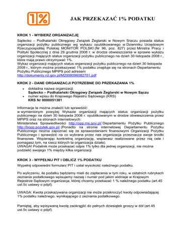 JAK PRZEKAZAĆ 1% PODATKU KROK 1 - WYBIERZ ORGANIZACJĘ Sądecko – Podhalański Okręgowy Związek Żeglarski w Nowym Sraczu posiada status organizacji pożytku publicznego wg wykazu opublikowanego w Dzienniku Urzędowym Rzeczypospolitej Polskiej MONITOR POLSKI (Nr 96, poz. 827) przez Ministra Pracy i Polityki Społecznej z dnia 29 grudnia 2008 r. w drodze obwieszczenia w sprawie wykazu organizacji mających status organizacji pożytku publicznego na dzień 30 listopada 2008 r., które mają prawo otrzymywać 1%. Wykaz organizacji mających status organizacji pożytku publicznego na dzień 30 listopada 2008 r., którym można przekazywać 1% podatku znajduje się na stronach Departamentu Pożytku Publicznego MPiPS pod adresem http://dokumenty.rcl.gov.pl/M2008096082701.pdf KROK 2 - DANE ORGANIZACJI POTRZEBNE DO PRZEKAZANIA 1% • • dokładna nazwa organizacji Sądecko – Podhalański Okręgowy Związek Żeglarski w Nowym Sączu numer wpisu do Krajowego Rejestru Sądowego (KRS) KRS Nr 0000051381 Informacje te można znaleźć lub sprawdzić: w wymienionym powyżej Wykazie organizacji mających status organizacji pożytku publicznego na dzień 30 listopada 2008 r. opublikowanym w drodze obwieszczenia przez MPiPS oraz na stronach internetowych: Ministerstwa Sprawiedliwości http://opp.ms.gov.pl/ Departamentu Pożytku Publicznego http://bopp.pozytek.gov.pl/ (Ponadto na stronie internetowej Departamentu Pożytku Publicznego można zapoznać się ze sprawozdaniami finansowymi Organizacji Pożytku Publicznego i sprawdzić na co wybrana przez nas organizacja przeznacza swoje środki finansowe. Wspierając konkretną organizację, wspierasz realizowane przez nią cele i pomagasz tym, na rzecz których ta organizacja działa). UWAGA! Podatnik może przekazać odpis 1% tylko dla jednej organizacji, nie można podzielić swojego 1% między kilka organizacji. KROK 3 - WYPEŁNIJ PIT I OBLICZ 1% PODATKU Wypełnij odpowiedni formularz PIT i ustal wysokość należnego podatku. Po wyliczeniu, ile podatku będziemy mieli do zapłacenia w tym roku, w ostatnich rubrykach zeznania podatkowego wpisujemy nazwę i numer pod jakim widnieje w Krajowym Rejestrze Sądowym organizacja, której chcemy przekazać 1 % należnego podatku (art.45 ust.5c ustawy o pdpf). UWAGA: Kwota przekazywana organizacji nie może przekroczyć kwoty odpowiadającej 1% podatku należnego, wynikającego z zeznania podatkowego. Pamiętaj, aby wpisywaną kwotę zaokrąglić do pełnych dziesiątek groszy w dół (art.45 ust.5c ustawy o pdpf). KROK 4 – REZULTAT Pieniądze - 1% podatku należnego - na konto wybranej organizacji przekaże urząd skarbowy w terminie do 3 miesięcy. Z wyliczonej kwoty potrącone zostaną koszty przelewu. 1% można przekazać tylko w zeznaniach podatkowych złożonych w terminie (art.45 ust.5f ustawy o pdpf). UWAGA: Odpis 1% nie znosi możliwości odliczenia od dochodu darowizny. Informacje na temat czym się różni darowizna od mechanizmu 1% można znaleźć na stronach Departamentu Pożytku Publicznego MPiPS http://www.pozytek.gov.pl/1,podatku,na,rzecz,OPP,465.html lub na portalu ngo.pl pod adresami: http://www.pozytek.ngo.pl/x/33409, http://www.ksiegowosc.ngo.pl/ Informacje nt. 1% można znaleźć również na stronach http://www.pozytek.gov.pl/ http://www.pozytek.ngo.pl/