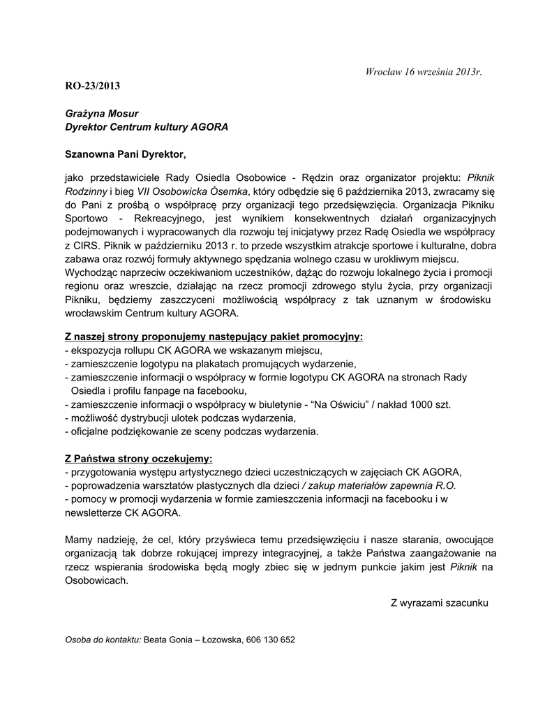 Wrocław 16 września 2013r. RO23/2013 Grażyna Mosur Dyrektor Centrum kultury AGORA Szanowna Pani Dyrektor, jako przedstawiciele Rady Osiedla Osobowice Rędzin oraz organizator projektu: Piknik Rodzinny i bieg VII Osobowicka Ósemka, który odbędzie się 6 października 2013, zwracamy się do Pani z prośbą o współpracę przy organizacji tego przedsięwzięcia. Organizacja Pikniku Sportowo Rekreacyjnego, jest wynikiem konsekwentnych działań organizacyjnych podejmowanych i wypracowanych dla rozwoju tej inicjatywy przez Radę Osiedla we współpracy z CIRS. Piknik w październiku 2013 r. to przede wszystkim atrakcje sportowe i kulturalne, dobra zabawa oraz rozwój formuły aktywnego spędzania wolnego czasu w urokliwym miejscu. Wychodząc naprzeciw oczekiwaniom uczestników, dążąc do rozwoju lokalnego życia i promocji regionu oraz wreszcie, działając na rzecz promocji zdrowego stylu życia, przy organizacji Pikniku, będziemy zaszczyceni możliwością współpracy z tak uznanym w środowisku wrocławskim Centrum kultury AGORA. Z naszej strony proponujemy następujący pakiet promocyjny: ekspozycja rollupu CK AGORA we wskazanym miejscu, zamieszczenie logotypu na plakatach promujących wydarzenie, zamieszczenie informacji o współpracy w formie logotypu CK AGORA na stronach Rady Osiedla i profilu fanpage na facebooku, zamieszczenie informacji o współpracy w biuletynie “Na Oświciu” / nakład 1000 szt. możliwość dystrybucji ulotek podczas wydarzenia, oficjalne podziękowanie ze sceny podczas wydarzenia. Z Państwa strony oczekujemy: przygotowania występu artystycznego dzieci uczestniczących w zajęciach CK AGORA, poprowadzenia warsztatów plastycznych dla dzieci / zakup materiałów zapewnia R.O. pomocy w promocji wydarzenia w formie zamieszczenia informacji na facebooku i w newsletterze CK AGORA. Mamy nadzieję, że cel, który przyświeca temu przedsięwzięciu i nasze starania, owocujące organizacją tak dobrze rokującej imprezy integracyjnej, a także Państwa zaangażowanie na rzecz wspierania środowiska będą mogły zbiec się w jednym punkcie jakim jest Piknik na Osobowicach. Z wyrazami szacunku Osoba do kontaktu: Beata Gonia – Łozowska, 606 130 652 Koordynator: Joanna Nawrot, 506953441 Ramowy Plan Wydarzenia: 11.00 – Rozpoczęcie Imprezy ● dmuchane zjeżdżalnie dla dzieci, tor przeszkód, eurobunge ● jazda konna ● stoiska: Ø „Pasieka Marcina” – prezentacja multimedialna „Wszystko o pszczołach” – na stoisku ekologicznym miody, świece i inne wyroby miodowe oraz opracowania ekologiczne Ø Stowarzyszenie Łucznictwa Tradycyjnego – prezentacja strojów łuczników, nauka strzelania z łuków tradycyjnych Ø stoisko cateringowe 12.00 start biegu Osobowica Ósemka 13.00 zakończenie biegu 13.00 – Rozpoczęcie działań dla dzieci ● klaunada – konkursy i zabawy z nagrodami ● pokaz baniek ● baloniki – pokaz figur balonowych ● malowanie twarzy ● warsztaty plastyczne CK AGORA ● występ artystyczny dzieci z CK AGORA 16.00 zakończenie Imprezy Organizator: Rada Osiedla Osobowice – Rędzin Projekt częściowo finansowany ze środków: CIRS Współorganizator: Centrum Kultury AGORA Sponsorzy: MPWiK Wrocław, Skanska, Flower Dent, Eko Las, Fortum, Maratony24.pl, Aquapark Wrocław, Dajar, Restauracja Rodzinna