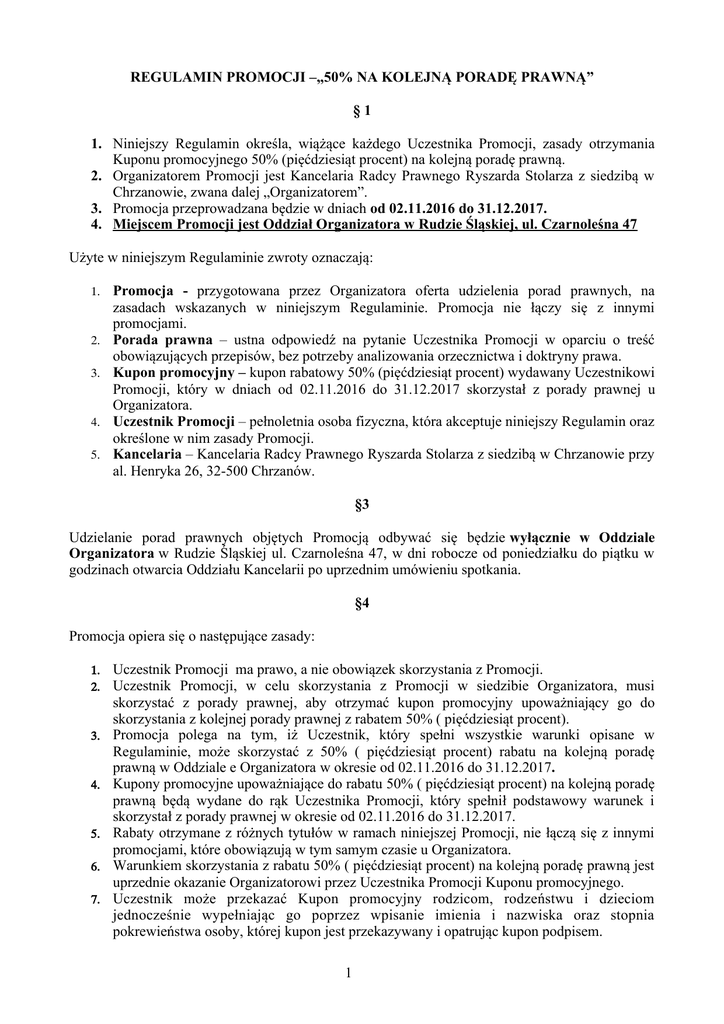 REGULAMIN PROMOCJI –„50% NA KOLEJNĄ PORADĘ PRAWNĄ” §1 1. Niniejszy Regulamin określa, wiążące każdego Uczestnika Promocji, zasady otrzymania Kuponu promocyjnego 50% (pięćdziesiąt procent) na kolejną poradę prawną. 2. Organizatorem Promocji jest Kancelaria Radcy Prawnego Ryszarda Stolarza z siedzibą w Chrzanowie, zwana dalej „Organizatorem”. 3. Promocja przeprowadzana będzie w dniach od 02.11.2016 do 31.12.2017. 4. Miejscem Promocji jest Oddział Organizatora w Rudzie Śląskiej, ul. Czarnoleśna 47 Użyte w niniejszym Regulaminie zwroty oznaczają: 1. 2. 3. 4. 5. Promocja - przygotowana przez Organizatora oferta udzielenia porad prawnych, na zasadach wskazanych w niniejszym Regulaminie. Promocja nie łączy się z innymi promocjami. Porada prawna – ustna odpowiedź na pytanie Uczestnika Promocji w oparciu o treść obowiązujących przepisów, bez potrzeby analizowania orzecznictwa i doktryny prawa. Kupon promocyjny – kupon rabatowy 50% (pięćdziesiąt procent) wydawany Uczestnikowi Promocji, który w dniach od 02.11.2016 do 31.12.2017 skorzystał z porady prawnej u Organizatora. Uczestnik Promocji – pełnoletnia osoba fizyczna, która akceptuje niniejszy Regulamin oraz określone w nim zasady Promocji. Kancelaria – Kancelaria Radcy Prawnego Ryszarda Stolarza z siedzibą w Chrzanowie przy al. Henryka 26, 32-500 Chrzanów. §3 Udzielanie porad prawnych objętych Promocją odbywać się będzie wyłącznie w Oddziale Organizatora w Rudzie Śląskiej ul. Czarnoleśna 47, w dni robocze od poniedziałku do piątku w godzinach otwarcia Oddziału Kancelarii po uprzednim umówieniu spotkania. §4 Promocja opiera się o następujące zasady: 1. 2. 3. 4. 5. 6. 7. Uczestnik Promocji ma prawo, a nie obowiązek skorzystania z Promocji. Uczestnik Promocji, w celu skorzystania z Promocji w siedzibie Organizatora, musi skorzystać z porady prawnej, aby otrzymać kupon promocyjny upoważniający go do skorzystania z kolejnej porady prawnej z rabatem 50% ( pięćdziesiąt procent). Promocja polega na tym, iż Uczestnik, który spełni wszystkie warunki opisane w Regulaminie, może skorzystać z 50% ( pięćdziesiąt procent) rabatu na kolejną poradę prawną w Oddziale e Organizatora w okresie od 02.11.2016 do 31.12.2017. Kupony promocyjne upoważniające do rabatu 50% ( pięćdziesiąt procent) na kolejną poradę prawną będą wydane do rąk Uczestnika Promocji, który spełnił podstawowy warunek i skorzystał z porady prawnej w okresie od 02.11.2016 do 31.12.2017. Rabaty otrzymane z różnych tytułów w ramach niniejszej Promocji, nie łączą się z innymi promocjami, które obowiązują w tym samym czasie u Organizatora. Warunkiem skorzystania z rabatu 50% ( pięćdziesiąt procent) na kolejną poradę prawną jest uprzednie okazanie Organizatorowi przez Uczestnika Promocji Kuponu promocyjnego. Uczestnik może przekazać Kupon promocyjny rodzicom, rodzeństwu i dzieciom jednocześnie wypełniając go poprzez wpisanie imienia i nazwiska oraz stopnia pokrewieństwa osoby, której kupon jest przekazywany i opatrując kupon podpisem. 1 8. Osoba której kupon przekazano przy jego okazaniu winna wykazać stopień pokrewieństwa do osoby Uczestnika. 9. Organizator nie ponosi odpowiedzialności za utratę Kuponu przez Uczestnika promocji. §5 Informacja o Promocji zawarta w prasie i materiałach reklamowych nie stanowi oferty ani przyrzeczenia publicznego. Za wadliwe lub niepełne odczytanie hasła Promocji Organizator nie odpowiada. §6 Organizator ma prawo odwołać lub skrócić okres trwania Promocji bez podawania przyczyn, poprzez umieszczenie pisemnej informacji w Internecie na stronie www.kancelariars.pl. §7 1. 2. 3. 4. 5. Regulamin Promocji jest dostępny w Oddziale Organizatora w Rudzie Śląskiej przy ul. Czarnoleśnej 47 oraz w siedzibie Organizatora w Chrzanowie przy al. Henryka 26, 32-500 Chrzanów, a także na jego stronie internetowej www.kancelariars.pl przez cały czas trwania promocji. Wszelkich informacji na temat Promocji można zasięgnąć w Odziale Organizatora, a także pod nr tel. 32 753 86 10 oraz za pomocą poczty elektronicznej pod adresem [email protected]. Niniejszy Regulamin może być zmieniany przez Organizatora w dowolnym czasie poprzez zamieszczenie zmian na stronie internetowej www.kancelariars.pl. Wszelkie zmiany do Regulaminu stają się skuteczne z chwilą ich zamieszczenia na w/w stronie internetowej, o ile nie zastrzeżono inaczej. Organizator zastrzega sobie pełne i nieograniczone prawo do ostatecznej interpretacji niniejszego Regulaminu. W zakresie nieobjętym niniejszym Regulaminem rozstrzyga Organizator. WZÓR KUPONU AWERS Upoważnia Pana/Panią ….................................................................... do rabatu 50% na kolejną poradę prawną w okresie od 02.11.2016 do 31.12.2017. REWERS: Pieczątka Kancelarii i podpis wydającego 2