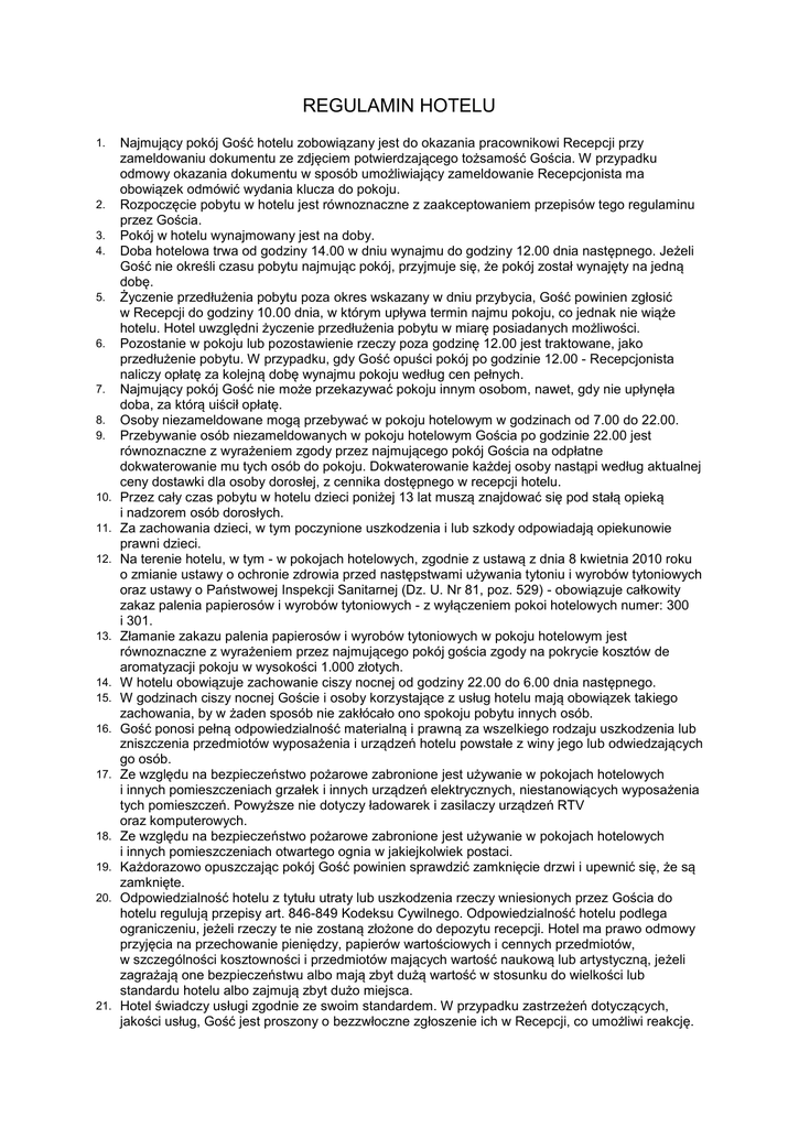 REGULAMIN HOTELU 1. 2. 3. 4. 5. 6. 7. 8. 9. 10. 11. 12. 13. 14. 15. 16. 17. 18. 19. 20. 21. Najmujący pokój Gość hotelu zobowiązany jest do okazania pracownikowi Recepcji przy zameldowaniu dokumentu ze zdjęciem potwierdzającego tożsamość Gościa. W przypadku odmowy okazania dokumentu w sposób umożliwiający zameldowanie Recepcjonista ma obowiązek odmówić wydania klucza do pokoju. Rozpoczęcie pobytu w hotelu jest równoznaczne z zaakceptowaniem przepisów tego regulaminu przez Gościa. Pokój w hotelu wynajmowany jest na doby. Doba hotelowa trwa od godziny 14.00 w dniu wynajmu do godziny 12.00 dnia następnego. Jeżeli Gość nie określi czasu pobytu najmując pokój, przyjmuje się, że pokój został wynajęty na jedną dobę. Życzenie przedłużenia pobytu poza okres wskazany w dniu przybycia, Gość powinien zgłosić w Recepcji do godziny 10.00 dnia, w którym upływa termin najmu pokoju, co jednak nie wiąże hotelu. Hotel uwzględni życzenie przedłużenia pobytu w miarę posiadanych możliwości. Pozostanie w pokoju lub pozostawienie rzeczy poza godzinę 12.00 jest traktowane, jako przedłużenie pobytu. W przypadku, gdy Gość opuści pokój po godzinie 12.00 - Recepcjonista naliczy opłatę za kolejną dobę wynajmu pokoju według cen pełnych. Najmujący pokój Gość nie może przekazywać pokoju innym osobom, nawet, gdy nie upłynęła doba, za którą uiścił opłatę. Osoby niezameldowane mogą przebywać w pokoju hotelowym w godzinach od 7.00 do 22.00. Przebywanie osób niezameldowanych w pokoju hotelowym Gościa po godzinie 22.00 jest równoznaczne z wyrażeniem zgody przez najmującego pokój Gościa na odpłatne dokwaterowanie mu tych osób do pokoju. Dokwaterowanie każdej osoby nastąpi według aktualnej ceny dostawki dla osoby dorosłej, z cennika dostępnego w recepcji hotelu. Przez cały czas pobytu w hotelu dzieci poniżej 13 lat muszą znajdować się pod stałą opieką i nadzorem osób dorosłych. Za zachowania dzieci, w tym poczynione uszkodzenia i lub szkody odpowiadają opiekunowie prawni dzieci. Na terenie hotelu, w tym - w pokojach hotelowych, zgodnie z ustawą z dnia 8 kwietnia 2010 roku o zmianie ustawy o ochronie zdrowia przed następstwami używania tytoniu i wyrobów tytoniowych oraz ustawy o Państwowej Inspekcji Sanitarnej (Dz. U. Nr 81, poz. 529) - obowiązuje całkowity zakaz palenia papierosów i wyrobów tytoniowych - z wyłączeniem pokoi hotelowych numer: 300 i 301. Złamanie zakazu palenia papierosów i wyrobów tytoniowych w pokoju hotelowym jest równoznaczne z wyrażeniem przez najmującego pokój gościa zgody na pokrycie kosztów de aromatyzacji pokoju w wysokości 1.000 złotych. W hotelu obowiązuje zachowanie ciszy nocnej od godziny 22.00 do 6.00 dnia następnego. W godzinach ciszy nocnej Goście i osoby korzystające z usług hotelu mają obowiązek takiego zachowania, by w żaden sposób nie zakłócało ono spokoju pobytu innych osób. Gość ponosi pełną odpowiedzialność materialną i prawną za wszelkiego rodzaju uszkodzenia lub zniszczenia przedmiotów wyposażenia i urządzeń hotelu powstałe z winy jego lub odwiedzających go osób. Ze względu na bezpieczeństwo pożarowe zabronione jest używanie w pokojach hotelowych i innych pomieszczeniach grzałek i innych urządzeń elektrycznych, niestanowiących wyposażenia tych pomieszczeń. Powyższe nie dotyczy ładowarek i zasilaczy urządzeń RTV oraz komputerowych. Ze względu na bezpieczeństwo pożarowe zabronione jest używanie w pokojach hotelowych i innych pomieszczeniach otwartego ognia w jakiejkolwiek postaci. Każdorazowo opuszczając pokój Gość powinien sprawdzić zamknięcie drzwi i upewnić się, że są zamknięte. Odpowiedzialność hotelu z tytułu utraty lub uszkodzenia rzeczy wniesionych przez Gościa do hotelu regulują przepisy art. 846-849 Kodeksu Cywilnego. Odpowiedzialność hotelu podlega ograniczeniu, jeżeli rzeczy te nie zostaną złożone do depozytu recepcji. Hotel ma prawo odmowy przyjęcia na przechowanie pieniędzy, papierów wartościowych i cennych przedmiotów, w szczególności kosztowności i przedmiotów mających wartość naukową lub artystyczną, jeżeli zagrażają one bezpieczeństwu albo mają zbyt dużą wartość w stosunku do wielkości lub standardu hotelu albo zajmują zbyt dużo miejsca. Hotel świadczy usługi zgodnie ze swoim standardem. W przypadku zastrzeżeń dotyczących, jakości usług, Gość jest proszony o bezzwłoczne zgłoszenie ich w Recepcji, co umożliwi reakcję. 22. Przedmioty osobistego użytku pozostawione w pokoju przez wyjeżdżającego Gościa będą odesłane na jego koszt, na adres przez niego wskazany. W przypadku nie otrzymania takiej dyspozycji hotel przechowa te przedmioty przez 3 miesiące, a następnie przekaże je na cele charytatywne lub do użytku publicznego. 23. W przypadku naruszenia postanowień niniejszego regulaminu, hotel może odmówić dalszego świadczenia usług osobie, która je narusza. Osoba taka zobowiązana jest do niezwłocznego zastosowania się do żądań personelu hotelu, uregulowania należności za dotychczasowe świadczenia oraz do zapłaty za ewentualnie poczynione uszkodzenia i zniszczenia oraz opuszczenia terenu hotelu. 24. Hotel może odmówić przyjęcia Gościa, który podczas poprzedniego pobytu rażąco naruszył regulamin, wyrządzając szkodę w mieniu hotelowym lub Gości albo szkodę na osobie Gości, pracowników hotelu lub innych osób przebywających w hotelu, albo też w inny sposób zakłócił spokój w hotelu.
