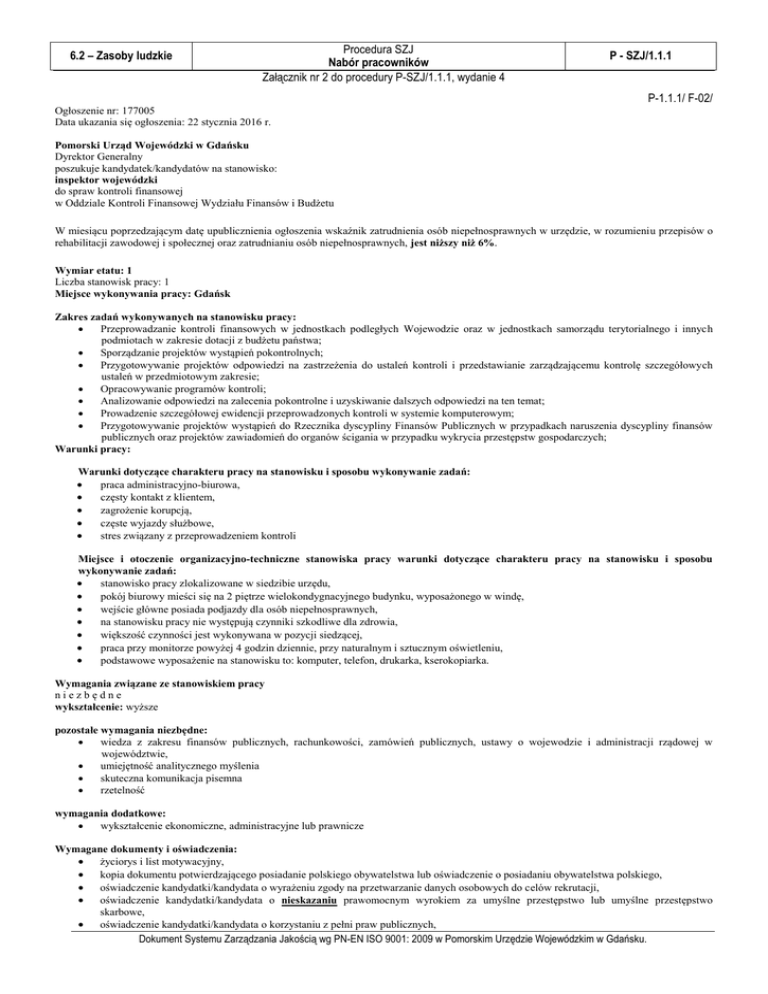 6.2 – Zasoby ludzkie Procedura SZJ Nabór pracowników Załącznik nr 2 do procedury P-SZJ/1.1.1, wydanie 4 P - SZJ/1.1.1 P-1.1.1/ F-02/ Ogłoszenie nr: 177005 Data ukazania się ogłoszenia: 22 stycznia 2016 r. Pomorski Urząd Wojewódzki w Gdańsku Dyrektor Generalny poszukuje kandydatek/kandydatów na stanowisko: inspektor wojewódzki do spraw kontroli finansowej w Oddziale Kontroli Finansowej Wydziału Finansów i Budżetu W miesiącu poprzedzającym datę upublicznienia ogłoszenia wskaźnik zatrudnienia osób niepełnosprawnych w urzędzie, w rozumieniu przepisów o rehabilitacji zawodowej i społecznej oraz zatrudnianiu osób niepełnosprawnych, jest niższy niż 6%. Wymiar etatu: 1 Liczba stanowisk pracy: 1 Miejsce wykonywania pracy: Gdańsk Zakres zadań wykonywanych na stanowisku pracy: Przeprowadzanie kontroli finansowych w jednostkach podległych Wojewodzie oraz w jednostkach samorządu terytorialnego i innych podmiotach w zakresie dotacji z budżetu państwa; Sporządzanie projektów wystąpień pokontrolnych; Przygotowywanie projektów odpowiedzi na zastrzeżenia do ustaleń kontroli i przedstawianie zarządzającemu kontrolę szczegółowych ustaleń w przedmiotowym zakresie; Opracowywanie programów kontroli; Analizowanie odpowiedzi na zalecenia pokontrolne i uzyskiwanie dalszych odpowiedzi na ten temat; Prowadzenie szczegółowej ewidencji przeprowadzonych kontroli w systemie komputerowym; Przygotowywanie projektów wystąpień do Rzecznika dyscypliny Finansów Publicznych w przypadkach naruszenia dyscypliny finansów publicznych oraz projektów zawiadomień do organów ścigania w przypadku wykrycia przestępstw gospodarczych; Warunki pracy: Warunki dotyczące charakteru pracy na stanowisku i sposobu wykonywanie zadań: praca administracyjno-biurowa, częsty kontakt z klientem, zagrożenie korupcją, częste wyjazdy służbowe, stres związany z przeprowadzeniem kontroli Miejsce i otoczenie organizacyjno-techniczne stanowiska pracy warunki dotyczące charakteru pracy na stanowisku i sposobu wykonywanie zadań: stanowisko pracy zlokalizowane w siedzibie urzędu, pokój biurowy mieści się na 2 piętrze wielokondygnacyjnego budynku, wyposażonego w windę, wejście główne posiada podjazdy dla osób niepełnosprawnych, na stanowisku pracy nie występują czynniki szkodliwe dla zdrowia, większość czynności jest wykonywana w pozycji siedzącej, praca przy monitorze powyżej 4 godzin dziennie, przy naturalnym i sztucznym oświetleniu, podstawowe wyposażenie na stanowisku to: komputer, telefon, drukarka, kserokopiarka. Wymagania związane ze stanowiskiem pracy niezbędne wykształcenie: wyższe pozostałe wymagania niezbędne: wiedza z zakresu finansów publicznych, rachunkowości, zamówień publicznych, ustawy o wojewodzie i administracji rządowej w województwie, umiejętność analitycznego myślenia skuteczna komunikacja pisemna rzetelność wymagania dodatkowe: wykształcenie ekonomiczne, administracyjne lub prawnicze Wymagane dokumenty i oświadczenia: życiorys i list motywacyjny, kopia dokumentu potwierdzającego posiadanie polskiego obywatelstwa lub oświadczenie o posiadaniu obywatelstwa polskiego, oświadczenie kandydatki/kandydata o wyrażeniu zgody na przetwarzanie danych osobowych do celów rekrutacji, oświadczenie kandydatki/kandydata o nieskazaniu prawomocnym wyrokiem za umyślne przestępstwo lub umyślne przestępstwo skarbowe, oświadczenie kandydatki/kandydata o korzystaniu z pełni praw publicznych, Dokument Systemu Zarządzania Jakością wg PN-EN ISO 9001: 2009 w Pomorskim Urzędzie Wojewódzkim w Gdańsku. 6.2 – Zasoby ludzkie Procedura SZJ Nabór pracowników Załącznik nr 2 do procedury P-SZJ/1.1.1, wydanie 4 P - SZJ/1.1.1 P-1.1.1/ F-02/ kopie dokumentów potwierdzających wykształcenie, kopia dokumentu potwierdzającego niepełnosprawność - w przypadku, gdy kandydatka/kandydat zamierza skorzystać z uprawnienia, o którym mowa w art. 29a ust. 2 ustawy z dnia 21 listopada 2008 r. o służbie cywilnej (Dz. U. Nr 227, poz. 1505 ze zm.). Termin składania dokumentów: 01 – 02 - 2016 Miejsce składania dokumentów: Pomorski Urząd Wojewódzki w Gdańsku Punkt przyjęć korespondencji w holu budynku Urzędu przy wejściu „B” ul. Okopowa 21/27 80-810 Gdańsk Na kopercie i liście motywacyjnym należy umieścić dopisek: 58/15 Inne informacje: O przebiegu naboru kandydaci będą informowani za pośrednictwem poczty elektronicznej. W ofercie należy podać swoje dane kontaktowe: adres do korespondencji, adres e-mail, numer telefonu. Każde oświadczenie wymagane w ogłoszeniu powinno być zgodne z treścią ujętą w ogłoszeniu. Treść oświadczeń załączonych do dokumentów aplikacyjnych należy opatrzyć odręcznym podpisem wraz z datą. Oferty otrzymane po terminie (decyduje data stempla pocztowego) oraz aplikacje niekompletne nie będą rozpatrywane. Oferty odrzucone i nieodebrane zostaną komisyjnie zniszczone. Techniki i metody naboru: • weryfikacja formalna nadesłanych ofert, • test wiedzy (opcjonalnie - zgodnie z obowiązującym regulaminem naboru), • sprawdzian praktyczny (opcjonalnie - zgodnie z obowiązującym regulaminem naboru), • rozmowa kwalifikacyjna. Zachęcamy do zapoznania się z informacjami dotyczącymi zasad organizacji naboru w Pomorskim Urzędzie Wojewódzkim w Gdańsku oraz skorzystania z wzorów oświadczeń, dostępnych na stronie BIP Urzędu w zakładce Praca w PUW/Zasady rekrutacji (http://uwgdansk.ssdip.bip.gov.pl/zasady-rekrutacji/dokumenty-i-oswiadczenia.html). Do składania dokumentów zachęcamy również osoby niepełnosprawne, które spełniają wymagania określone w niniejszym ogłoszeniu (z uwzględnieniem informacji dotyczących miejsca i otoczenia organizacyjno-technicznego stanowiska pracy). Nasz urząd jest pracodawcą równych szans i wszystkie aplikacje są rozważane z równą uwagą bez względu na płeć, wiek, niepełnosprawność, rasę, narodowość, przekonania polityczn
