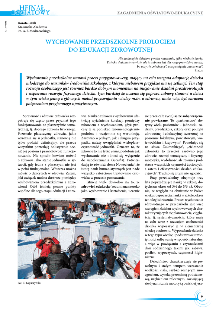 HEJNAŁ 1/139/2015 OŚWIATOWY ZAGADNIENIA OŚWIATOWO-EDUKACYJNE Dorota Lizak Krakowska Akademia im. A. F. Modrzewskiego WYCHOWANIE PRZEDSZKOLNE PROLOGIEM DO EDUKACJI ZDROWOTNEJ Nie zadawajcie dzieciom gwałtu nauczania, tylko niech się bawią. Dziecko doskonale bawi się, ale ta zabawa jest dla niego prawdziwą nauką, bo uczy się „niechcący”, a zapamiętuje „na zawsze”. Platon Wychowanie przedszkolne stanowi proces przygotowawczy, mający na celu wstępną adaptację dziecka młodszego do warunków środowiska szkolnego, z którym niebawem przyjdzie mu się zetknąć. Ten etap rozwoju osobniczego jest również bardzo dobrym momentem na inicjowanie działań prozdrowotnych i wspieranie rozwoju fizycznego dziecka, tym bardziej że uczenie się poprzez zabawę stanowi u dzieci w tym wieku jedną z głównych metod przyswajania wiedzy m.in. o zdrowiu, może więc być zarazem połączeniem przyjemnego z pożytecznym. Sprawność i zdrowie człowieka rozpatruje się często przez pryzmat jego funkcjonowania na płaszczyźnie somatycznej, tj. dobrego zdrowia fizycznego. Pozostałe płaszczyzny zdrowia, jakie wyróżnia się u jednostki, stanowią nie tylko podział definicyjny, ale przede wszystkim pozwalają holistycznie ocenić jej poziom i prawidłowość funkcjonowania. Nie sposób bowiem mówić o zdrowiu jako stanie jednostki w sytuacji, gdy jedna z płaszczyzn nie jest w pełni funkcjonalna. Wówczas można mówić o deficytach w zdrowiu. Zatem, jaki związek można dostrzec pomiędzy wychowaniem przedszkolnym a zdrowiem? Otóż istnieją pewne punkty wspólne dla tego etapu edukacji i zdro- Fot. T. Łopuszyński wia. Nauki o zdrowiu i wychowaniu ułatwiają wyjaśnienie korelacji pomiędzy zdrowiem a wychowaniem, gdyż procesy te są poniekąd fenomenologicznie podobne i wzajemnie się warunkują. Zarówno w jednym, jak i drugim przypadku należy uwzględniać wielopłaszczyznowość jednostki. Oznacza to, że zdrowie to nie tylko soma, podobnie jak wychowanie nie odnosi się wyłącznie do uspołeczniania (socialis). Potwierdzają to również słowa Nowocienia1, że istotą nauk humanistycznych jest nade wszystko całościowe traktowanie człowieka w procesie poznawania. Istnieje wiele dowodów na to, że zdrowie i edukacja (rozumiana szeroko jako wychowanie i kształcenie, uczenie się przez całe życie) są ze sobą wzajemnie powiązane. To „partnerstwo” dotyczy wielu poziomów – jednostki, rodziny, przedszkola, szkoły oraz polityki zdrowotnej i edukacyjnej tworzonej na poziomie lokalnym, powiatowym, wojewódzkim i krajowym2. Powołując się na słowa Żukowskiego3, „cielesność człowieka to przecież zarówno jego zdrowie, rozwój somatyczny i fizyczny, motoryka, wydolność, ale również podstawa wszystkich czynności życiowych, a zatem i efektywności działań edukacyjnych”. Trudno się z tym nie zgodzić. Etap przedszkolny obejmuje trzy lata poprzedzające naukę w szkole, dotychczas okres od 3/4 do 5/6 r.ż. Obecnie, ze względu na obniżenie w Polsce wieku rozpoczęcia nauki w szkole, okres ten uległ skróceniu. Proces wychowania zdrowotnego w przedszkolu jest więc szeregiem działań wychowawczych charakteryzujących się planowością, ciągłością, tj. systematycznością, które mają na celu wraz z rozwojem osobowości dziecka wyposażyć je w elementarną wiedzę o zdrowiu. Wyposażanie dziecka w tego typu wiedzę i podstawowe umiejętności odbywa się w sposób naturalny, a więc w powiązaniu z czynnościami dnia codziennego, takimi jak: zabawa, posiłek, wypoczynek, czynności higieniczne. Dzieciństwo charakteryzuje się powolnym i stałym tempem wzrastania wielkości ciała, szybko rosnącym mózgowiem, wysoką przemianą podstawową, uzębieniem mlecznym, rozwijającą się dynamicznie motoryką o niskiej jesz9 cze sprawności, niezakończonym procesem rozwoju myślenia oraz kończącym okres przedszkolny szybszym przyrostem (skokiem) wysokości ciała na skutek aktywności hormonów nadnerczy (adrenarche)4. W związku z powyższym zmiany, jakie dokonują się w młodym organizmie przebiegają dosyć szybko, dlatego też ważnym zadaniem zarówno dla rodziców, jak i nauczycieli jest monitorowanie, stymulowanie, a jeśli pojawią się nieprawidłowości – korygowanie tych procesów (uwzględniając dynamikę zmian). Według Przewędy5 „przedszkolny etap ontogenezy jest więc szczególnie dogodnym okresem dla wychowania fizycznego. Zbiegają się w nim bowiem trzy elementy sprzyjające temu procesowi: duża potrzeba ruchu, duża wrażliwość na bodźce i czynniki oraz dostateczny poziom dojrzałości motorycznej, umysłowej i społecznej”. Rozwój fizyczny i motoryczny dzieci przebiega nierównomiernie, skokowo, w cyklach dwuletnich. W okresie przedszkolnym można wyodrębnić dwie grupy wiekowe, między którymi następuje owo przyspieszenie. Są to trzy- i czterolatki oraz pięcio- i sześciolatki. Wskazane jest dokonanie na początku roku szkolnego oceny rozwoju fizycznego i motorycznego dzieci. Jest to potrzebne do właściwego planowania zajęć, trafnego doboru ćwiczeń, dostrzeżenia dzieci z deficytami i udzielenia im pomocy poprzez indywidualizację zadań, a także do udzielenia rodzicom informacji zwrotnej dotyczącej sytuacji zdrowotnej dziecka względem grupy rówieśniczej. Dla pięciolatków ocena ta będzie stanowić jeden z elementów diagnozy gotowości dziecka do podjęcia nauki szkolnej. Zdrowie człowieka to nie tylko rozwój fizyczny, ale w przypadku dzieci jest on czułym miernikiem ich stanu zdrowia. W związku z powyższym rozwój dziecka należy monitorować w sposób ustawiczny, mając na uwadze rodzaj i tempo zmian, jakie zachodzą w rozwijającym się organizmie. Partycypując w tym procesie, warto mieć na uwadze stan wyjściowy oraz progresję zmian, dlatego tak obserwacja, jak i umiejętność dokonania oceny z perspektywy czasu mogą stanowić cenną informację dotyczącą prawidłowości