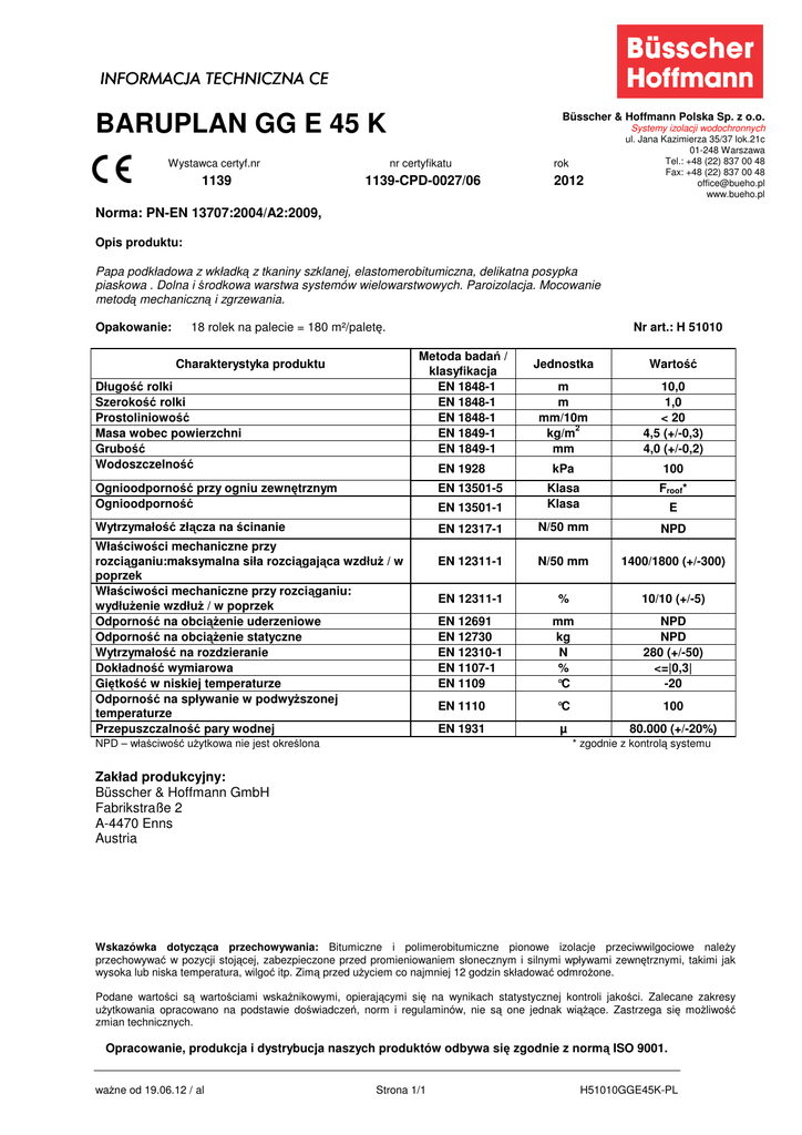 INFORMACJA TECHNICZNA CE Büsscher & Hoffmann Polska Sp. z o.o. BARUPLAN GG E 45 K Wystawca certyf.nr nr certyfikatu 1139 1139-CPD-0027/06 O rok 2012 Systemy izolacji wodochronnych ul. Jana Kazimierza 35/37 lok.21c 01-248 Warszawa Tel.: +48 (22) 837 00 48 Fax: +48 (22) 837 00 48 [email protected] www.bueho.pl Norma: PN-EN 13707:2004/A2:2009, Opis produktu: Papa podkładowa z wkładką z tkaniny szklanej, elastomerobitumiczna, delikatna posypka piaskowa . Dolna i środkowa warstwa systemów wielowarstwowych. Paroizolacja. Mocowanie metodą mechaniczną i zgrzewania. Opakowanie: Nr art.: H 51010 18 rolek na palecie = 180 m²/paletę. Metoda badań / klasyfikacja EN 1848-1 EN 1848-1 EN 1848-1 EN 1849-1 EN 1849-1 Charakterystyka produktu Długość rolki Szerokość rolki Prostoliniowość Masa wobec powierzchni Grubość Wodoszczelność EN 1928 EN 13501-5 Jednostka Wartość m m mm/10m 2 kg/m mm 10,0 1,0 < 20 4,5 (+/-0,3) 4,0 (+/-0,2) kPa 100 Ognioodporność przy ogniu zewnętrznym Ognioodporność Klasa Klasa Froof* EN 13501-1 Wytrzymałość złącza na ścinanie EN 12317-1 N/50 mm NPD EN 12311-1 N/50 mm 1400/1800 (+/-300) EN 12311-1 % 10/10 (+/-5) EN 12691 EN 12730 EN 12310-1 EN 1107-1 EN 1109 mm kg N % °C NPD NPD 280 (+/-50) <=|0,3| -20 EN 1110 °C 100 EN 1931 µ Właściwości mechaniczne przy rozciąganiu:maksymalna siła rozciągająca wzdłuŜ / w poprzek Właściwości mechaniczne przy rozciąganiu: wydłuŜenie wzdłuŜ / w poprzek Odporność na obciąŜenie uderzeniowe Odporność na obciąŜenie statyczne Wytrzymałość na rozdzieranie Dokładność wymiarowa Giętkość w niskiej temperaturze Odporność na spływanie w podwyŜszonej temperaturze Przepuszczalność pary wodnej NPD – właściwość uŜytkowa nie jest określona E 80.000 (+/-20%) * zgodnie z kontrolą systemu Zakład produkcyjny: Büsscher & Hoffmann GmbH Fabrikstraße 2 A-4470 Enns Austria Wskazówka dotycząca przechowywania: Bitumiczne i polimerobitumiczne pionowe izolacje przeciwwilgociowe naleŜy przechowywać w pozycji stojącej, zabezpieczone przed promieniowaniem słonecznym i silnymi wpływami zewnętrznymi, takimi jak wysoka lub niska temperatura, wilgoć itp. Zimą przed uŜyciem co najmniej 12 godzin składować odmroŜone. Podane wartości są wartościami wskaźnikowymi, opierającymi się na wynikach statystycznej kontroli jakości. Zalecane zakresy uŜytkowania opracowano na podstawie doświadczeń, norm i regulaminów, nie są one jednak wiąŜące. Zastrzega się moŜliwość zmian technicznych. Opracowanie, produkcja i dystrybucja naszych produktów odbywa się zgodnie z normą ISO 9001. waŜne od 19.06.12 / al Strona 1/1 H51010GGE45K-PL