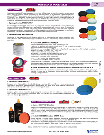MATERIAŁY POLERSKIE 17 Seria „URBAN” Gąbki polerskie „URBAN” są produkowane z najwyższą dokładnością, co pozwala na idealne ich wyważenie. Gąbka podczas pracy nie wpada w wibrację, co znacznie wpływa na jej żywotność. Profesjonalna gąbka polerska „URBAN” przeznaczona jest do mechanicznego polerowania i szlifowania z możliwością użycia gruboziarnistych past polerskich. Można stosować ją zarówno na mokro, jak i na sucho, w zakresie prędkości od 600 do 2600 obr./min. bez obciążenia. Gąbki polerskie „URBAN” charakteryzuje wysoka jakość i profesjonalne wykonanie, wyprodukowane z precyzyjnie dobranych materiałów o wysokiej jakości. Gąbka polerska „FREZOWANA” Na roboczej powierzchni gąbki znajdują się trzy zagłębienia tworzące okręgi, których funkcją jest zatrzymywanie oraz równomierne oddawanie pasty polerskiej na polerowany element i ochrona przed jej nadmiernym rozpryskiwaniem. Dozowanie pasty odbywa się poprzez napełnienie jednego, dwóch lub trzech zagłębień. Po rozpoczęciu obróbki w niskim zakresie obrotów pasta jest równomiernie rozprowadzana na powierzchni polerowanej, a jej nadmiar utrzymywany jest na płaszczyźnie ściernicy tarczowej. Gąbka polerska „KARBOWANA” Stosowana do prac wykończeniowych. Idealnie nadaje się do ostatecznego polerowania mleczkami polerskimi. Struktura gąbki pozwala na pracę przy większych obrotach i nie powoduje efektu przypalania pasty polerskiej. Taśma DWUSTRONNIE KLEJĄCA • stosowana do mocowania listew, profili dekoracyjnych, itp. • odporna na działanie soli, wody, promieniowania UV oraz wysokiej temperatury • posiada wysoką odporność na ścinanie. Wykonana ze wzmocnionej pianki PE z klejem AM doskonale zdaje egzamin w ekstremalnych warunkach. • zakres temperatur roboczych: -40o C do 110o C • odporność na działanie wody: bardzo duża • odporność na działanie promieniowania UV: bardzo duża • odporność na działanie oleju silnikowego: bardzo duża • odporność na działanie paliw: bardzo duża Taśma MASKUJĄCO-ODCHYLAJĄCA Pianki poliuretanowe do wnęk samochodowych o wymiarach 13 mm na 20 m Pianka poliuretanowa do wypełniania wnęk samochodowych między drzwiami, pokrywą silnika, pokrywą bagażnika, itp. Służy ona do maskowania przejść lakierowanych elementów samochodowych, tak aby nie było równego „odcięcia” lakieru. Seria „URBAN PRO” Gąbka URBAN PRO SNAKE Dostępna tylko w kolorze żółtym (twardość średnia), w rozmiarze 150 mm x 25 mm, z mocowaniem na rzep. Zalecana do polerowania trudno dostępnych miejsc takich jak: dolne partie drzwi, zderzaki. Układ nacięć z łatwością pozwala prowadzić gąbkę całą powierzchnią po lakierze. Gąbka URBAN PRO SQUARE Dostępna tylko w kolorze niebieskim (najtwardszym), w rozmiarze 150 mm x 25 mm, z mocowaniem na rzep. Unikalne nacięcia oraz duża agresywność piany, znacznie skracają czas polerowania głębokich rys oraz usuwania utlenionej części lakieru. Seria „HONEYCOMBination” Gąbka HONEYCOMBination Łatwe i precyzyjne prowadzenie gąbki po lakierze całą jej powierzchnią. Szybciej się poleruje, dzięki czemu wystarcza na zdecydowanie dłużej. Kilkanaście małych, niezależnych powierzchni roboczych dla pasty lub mleczka, w ten sposób zminimalizowana zostaje możliwość powstania śladów wirowania. Łatwiejszy, szybszy i przyjemniejszy sposób na otrzymanie na lakierze najwyższego połysku nawet dla najbardziej wymagających. Pasta HONEYCOMBination URBAN Shine Można stosować z użyciem maszyn polerskich, ale także w obróbce ręcznej. Aby skrócić czas polerowania i usunąć drobne rysy należy zastosować maszynę polerską 1500-2500 obr. Po polerowaniu powierzchni przygotowanej papierem P2000-P2500 uzyskasz od razu efekt wysokiego połysku bez hologramów. Jedną pastą i jedną gąbką - nawet na czarnych powierzchniach. PEŁNA OFERTA FIRMY URBAN U NASZEGO PRZEDSTAWICIELA HANDLOWEGO. www.produktyprzemyslowe.pl tel.: 32/ 356 30 60 do 65 Materiały polerskie Taśma maskująco - odchylająca „URBAN” służy do maskowania uszczelek niezdejmowalnych szyb wklejanych. Dzięki zastosowaniu specjalnego plastikowego paska, taśmę można z dużą swobodą umieścić pod uszczelką. Pozostała część taśmy zapewnia ochronę gumowej uszczelki i szyby przy lakierowaniu.