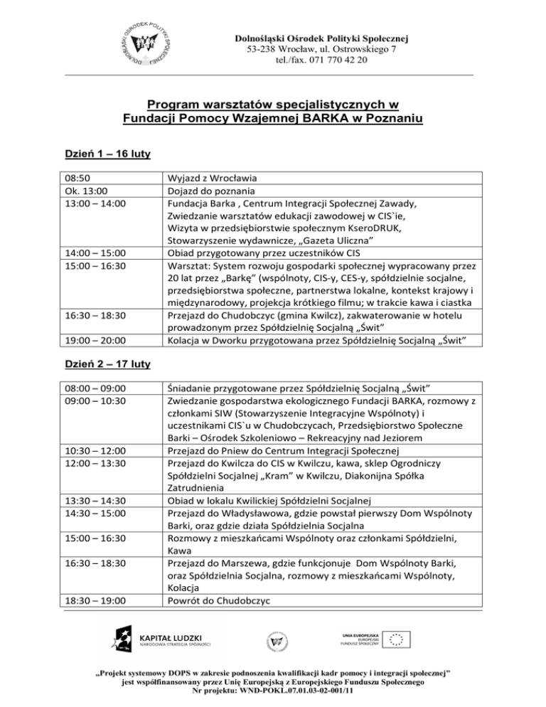 Dolnośląski Ośrodek Polityki Społecznej 53-238 Wrocław, ul. Ostrowskiego 7 tel./fax. 071 770 42 20 _________________________________________________________________________________ Program warsztatów specjalistycznych w Fundacji Pomocy Wzajemnej BARKA w Poznaniu Dzień 1 – 16 luty 08:50 Ok. 13:00 13:00 – 14:00 14:00 – 15:00 15:00 – 16:30 16:30 – 18:30 19:00 – 20:00 Wyjazd z Wrocławia Dojazd do poznania Fundacja Barka , Centrum Integracji Społecznej Zawady, Zwiedzanie warsztatów edukacji zawodowej w CIS`ie, Wizyta w przedsiębiorstwie społecznym KseroDRUK, Stowarzyszenie wydawnicze, „Gazeta Uliczna” Obiad przygotowany przez uczestników CIS Warsztat: System rozwoju gospodarki społecznej wypracowany przez 20 lat przez „Barkę” (wspólnoty, CIS-y, CES-y, spółdzielnie socjalne, przedsiębiorstwa społeczne, partnerstwa lokalne, kontekst krajowy i międzynarodowy, projekcja krótkiego filmu; w trakcie kawa i ciastka Przejazd do Chudobczyc (gmina Kwilcz), zakwaterowanie w hotelu prowadzonym przez Spółdzielnię Socjalną „Świt” Kolacja w Dworku przygotowana przez Spółdzielnię Socjalną „Świt” Dzień 2 – 17 luty 08:00 – 09:00 09:00 – 10:30 10:30 – 12:00 12:00 – 13:30 13:30 – 14:30 14:30 – 15:00 15:00 – 16:30 16:30 – 18:30 18:30 – 19:00 Śniadanie przygotowane przez Spółdzielnię Socjalną „Świt” Zwiedzanie gospodarstwa ekologicznego Fundacji BARKA, rozmowy z członkami SIW (Stowarzyszenie Integracyjne Wspólnoty) i uczestnikami CIS`u w Chudobczycach, Przedsiębiorstwo Społeczne Barki – Ośrodek Szkoleniowo – Rekreacyjny nad Jeziorem Przejazd do Pniew do Centrum Integracji Społecznej Przejazd do Kwilcza do CIS w Kwilczu, kawa, sklep Ogrodniczy Spółdzielni Socjalnej „Kram” w Kwilczu, Diakonijna Spółka Zatrudnienia Obiad w lokalu Kwilickiej Spółdzielni Socjalnej Przejazd do Władysławowa, gdzie powstał pierwszy Dom Wspólnoty Barki, oraz gdzie działa Spółdzielnia Socjalna Rozmowy z mieszkańcami Wspólnoty oraz członkami Spółdzielni, Kawa Przejazd do Marszewa, gdzie funkcjonuje Dom Wspólnoty Barki, oraz Spółdzielnia Socjalna, rozmowy z mieszkańcami Wspólnoty, Kolacja Powrót do Chudobczyc „Projekt systemowy DOPS w zakresie podnoszenia kwalifikacji kadr pomocy i integracji społecznej” jest współfinansowany przez Unię Europejską z Europejskiego Funduszu Społecznego Nr projektu: WND-POKL.07.01.03-02-001/11 Dolnośląski Ośrodek Polityki Społecznej 53-238 Wrocław, ul. Ostrowskiego 7 tel./fax. 071 770 42 20 _________________________________________________________________________________ Dzień 3 – 18 luty 08:00 – 09:00 09:00 – 12:30 12:30 – 13:00 13:00 – 14:00 14:00 Śniadanie przygotowane przez Spółdzielnię Socjalną „Świt” Przejazd do Poznania – Spółdzielnie Socjalne w dzielnicy Piątkowo: „Tajemniczy Ogród” i „Ogrobud”, CIS Poznań – Piątkowo Os. Jana III Sobieskiego oraz Bolesława Śmiałego Przejazd do lokalu „Koziołeczek” na Śródce (Rynek Śródecki” Obiad w „Kosiołeczku” Powrót do Wrocławia „Projekt systemowy DOPS w zakresie podnoszenia kwalifikacji kadr pomocy i integracji społecznej” jest współfinansowany przez Unię Europejską z Europejskiego Funduszu Społecznego Nr projektu: WND-POKL.07.01.03-02-001/11