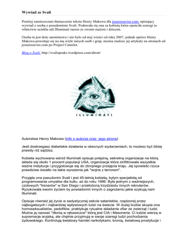 Wywiad ze Svali Poniżej zamieszczam tłumaczenie tekstu Henry Makowa dla jesusissavior.com, opisujący wywiad z osobą o pseudonimie Svali. Podawała się ona za kobietę która opuściła szeregi (a właściwie uciekła od) Illuminati razem ze swoim mężem i dziecmi. Osoba ta jest dośc anonimowa i nie bylo od niej wieści od roku 2007, jednak oprócz Henry Makowa powołuje się na nią wiele innych osób i grup, można znalezc jej artykuły na stronach od jesusissavior.com po Project Camelot. Blog o Svali. http://svalispeaks.wordpress.com/about/ Autorstwa Henry Makowa (info o autorze oraz jego strona) Jesli dostrzegasz diabelskie działania w obecnych wydarzeniach, to możesz być bliżej prawdy niż sądzisz. Kobieta wychowana wśród Illuminati opisuje potężną, sekretną organizacje na którą składa się około 1 procent populacji USA, organizacje która zinfiltrowała wszystkie ważne instytucje i przygotowuje się do zbrojnego przejęcia kraju. Jej opowieśc rzuca prawdziwe światło na takie wyrażenia jak "wojna z terrorem". Przyjęła ona pseudonim Svali i jest 45-letnią kobietą, byłym specjalistą od programowania umysłów dla kultu, aż do roku 1996. Była jednym z ważniejszych, czołowych "trenerów" w San Diego i przełożoną trzydziestu innych rekruterów. Ryzykowała swoim życiem by powiadomić innych o zagrożeniu jakie szykują nam Illuminati. Opisuje również jej życie w sadystycznej sekcie satanistów, rządzonej przez najbogatszych i najbardziej wpływowych ludzi na świecie. W dużej liczbie skupia ona homoseksualistów, pedofilów, praktykuje rytualne składanie ofiar ze zwierząt i ludzi. Można ją nazwać "dłonią w rękawiczce" którą jest CIA i Masoneria. Ci ludzie wierzą w supremacje aryjską, ale chętnie przyjmują w swoje szeregi ludzi pochodzenia żydowskiego. Kontrolują światowy handel narkotykami, bronią, światową prostytucje i pornografie, kryją się za ogromną liczbą politycznych zabójstw, za zamachami terrorystycznymi takimi jak 9/11, snajperem z Maryland czy bombami na Bali. Zinfiltrowali oni rząd oraz władze na poziomie lokalnym. Zinfiltrowali nasz system edukacji i finansjery, nasze religie i media. Ulokowani w swojej bazie w Europie planują zaprowadzenie Nowego Światowego Ładu, systemu przy którym nazizm czy komunizm wyglądają jak piknik. Co bardzo ważne: ci ludzie na pewno nie są ludzmi szczęśliwymi. Svali wyjaśniła mi dlaczego nasze dzieci nie są już uczone moralnych wartości, dlaczego przyzwyczaja się je do homoseksualizmu i przemocy i dlaczego nasza "kultura" stacza się w kierunku nihilizmu i seksualnej deprawacji. Daje do zrozumienia że Bush i jego administracja należą do Illuminati tak samo zresztą jak przytłaczająca częśc światowej klasy politycznej. W marcu roku 2000, Svali zaczęła pisać w comiesięcznej kolumnie dla ludzi którzy przeżyli rytualne deprawacje Illuminati na Suite101.com. W grudniu tego samego roku, H.J. Springer, naczelny CentrExNews.com skontaktował się z nią i przeprowadził 18nasto częściowy wywiad przez emaile. "Jestem przekonany że mówi prawde", to słowa które Springer napisał do mnie. " Osobiście sprawdziłem duzą ilosc emaili adresowanych do niej i przysłanych przez ludzi poddanych kiedyś praniu mózgu, zgwałconych, seksualnie molestowanych itd. Wielu z nich potwierdziło mi jej wersje historii. Nie mam więc powodów by wątpić iż Svali była częścią Illuminati od momentu urodzenia." Ja również wierze Svali ponieważ jej opowieśc potwierdza moje dotychczasowe badania i zebraną wiedze. Wszystko tutaj do siebie pasuje: od zródła spisku które tłumi prawde dla ludzkości po oddanie sekretnej technologii Chinczykom przez Clintona czy raporty o przygotowywanych obozach koncetracyjnych. Wyjaśnia dlaczego ludzie których znam działają w takiej konspiracji. Dziekuje Svali za tą przerażającą ale bardzo przydatną wiedze która pozwala nam zrozumieć świat w którym żyjemy. Mój przyjaciel nalegał bym wystrzegał się oszustwa i zaproponował by potwierdzić wersje Svali. Zgodziłem się. Zapraszam czytelników do zapoznania się z jej świadectwem i wyrobienia na ten temat własnego zdania. Za ich pozwoleniem, zamieszczam częśc korenspondecji ze Svali z CentrExnews.com H.J. Springera. Zamieściłem tu również materiał z jej artykułu "Are the Illuminati Taking Over the World?" Ciągła obecnośc Svali: Illuminati znajdują się w każdym wiekszym mieście w USA. Wierzą że mogą kontrolować nimi poprzez banki i instytucje finansowe (zgadnij ile z nich siedzi w zarządach banków? Mógłbys się zdziwić), lokalne władze. Jesli chodzi o kontrole prawa, dzieci z rodzin tej organizacji są zachęcane by studiować prawo, medycyne lub dziennikarstwo. Członkowie sekty finansują również lokalne gazety. Wierzenia Svali: Grupy Illuminati praktykują coś co my znamy jako Oświecenie. Inaczej Lucyferianizm. Uczą swoich członków że korzenie tych praktyk sięgają do tajemnych praktyk magicznych Babilonu(Kabała -przyp. tłum), Egiptu i celtyckich Druidów. Wzięli oni wszystkiego po trochu, wszystko co uznali z tego za najlepsze i stworzyli z tego własną droge okultyzmu. Wielu z nich na poziomach lokalnych czci rózne antyczne demony, takie jak El, Baal czy Astarte, oraz Izys, Ozyrysa, Seta... Wiem że ci ludzie zwyczajnie uczą i praktykują zło. Weishaupt Svali: Weishaupt nie stworzył Illuminati, był wybrany przez nich na figuranta i mówili o czym ma pisać. To finansjera, którą możemy datować do czasów Templariuszy finansujących wczesnych europejskich królów , stworzyła Illuminati. Weishupt był tylko ich pionkiem. Militarny przewrót Svali: Każdy region w USA posiada bazy i kwatery główne dla agentów Illuminati. Stany Zjednoczone podzielono na siedem takich regionów. Każdy z nich posiada lokacje zawierające sprzęt wojskowy oraz mniejsze bazy i ośrodki, w specjalnie wyizolowanych częściach kraju