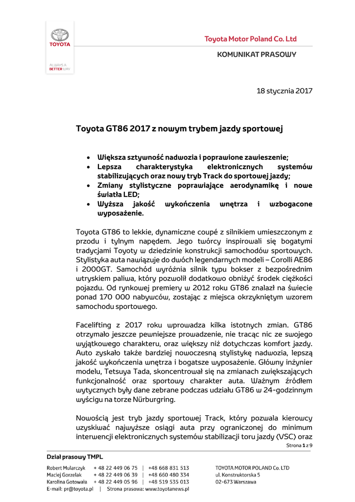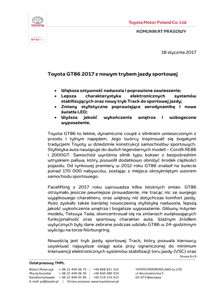 18 stycznia 2017 Toyota GT86 2017 z nowym trybem jazdy sportowej Większa sztywność nadwozia i poprawione zawieszenie; Lepsza charakterystyka elektronicznych systemów stabilizujących oraz nowy tryb Track do sportowej jazdy; Zmiany stylistyczne poprawiające aerodynamikę i nowe światła LED; Wyższa jakość wykończenia wnętrza i wzbogacone wyposażenie. Toyota GT86 to lekkie, dynamiczne coupé z silnikiem umieszczonym z przodu i tylnym napędem. Jego twórcy inspirowali się bogatymi tradycjami Toyoty w dziedzinie konstrukcji samochodów sportowych. Stylistyka auta nawiązuje do dwóch legendarnych modeli – Corolli AE86 i 2000GT. Samochód wyróżnia silnik typu bokser z bezpośrednim wtryskiem paliwa, który pozwolił dodatkowo obniżyć środek ciężkości pojazdu. Od rynkowej premiery w 2012 roku GT86 znalazł na świecie ponad 170 000 nabywców, zostając z miejsca okrzykniętym wzorem samochodu sportowego. Facelifting z 2017 roku wprowadza kilka istotnych zmian. GT86 otrzymało jeszcze pewniejsze prowadzenie, nie tracąc nic ze swojego wyjątkowego charakteru, oraz większy niż dotychczas komfort jazdy. Auto zyskało także bardziej nowoczesną stylistykę nadwozia, lepszą jakość wykończenia wnętrza i bogatsze wyposażenie. Główny inżynier modelu, Tetsuya Tada, skoncentrował się na zmianach zwiększających funkcjonalność oraz sportowy charakter auta. Ważnym źródłem wytycznych były dane zebrane podczas udziału GT86 w 24-godzinnym wyścigu na torze Nürburgring. Nowością jest tryb jazdy sportowej Track, który pozwala kierowcy uzyskiwać najwyższe osiągi auta przy ograniczonej do minimum interwencji elektronicznych systemów stabilizacji toru jazdy (VSC) oraz Strona 1 z 9 kontroli trakcji (TCS). Wielofunkcyjny wyświetlacz komputera pokładowego umieszczony między zegarami umożliwia w czasie rzeczywistym śledzić moment obrotowy i moc silnika oraz przeciążenia i czasy okrążeń. Toyota Motorsport oferuje także wersję rajdową GT86 CS-R3, homologowaną zgodnie z przepisami FIA Rajdowych Mistrzostw Świata. Auto daje szansę kierowcom amatorom spróbować swoich sił w międzynarodowych imprezach sportowych w profesjonalnym samochodzie rajdowym z tylnym napędem za rozsądną cenę. DYNAMIKA JAZDY Udoskonalone zawieszenie zapewniające większą stabilność i pewność prowadzenia, komfort jazdy i pewniejsze manewrowanie; Nowy tryb Track do jazdy sportowej z minimalną interwencją systemu stabilizacji toru jazdy (VSC) i kontroli trakcji; Większa sztywność nadwozia; Nowe detale w projekcie nadwozia poprawiające aerodynamikę, w tym nowy tylny spojler. Zawieszenie Udoskonalenia kolumn MacPhersona z przodu oraz tylnego zawieszenia dwuwahaczowego przeprowadzono z myślą o lepszym prowadzeniu i większej stabilności. Zoptymalizowany został stopień uginania się sprężyn. Dla poprawy sterowności zredukowano różnicę w obciążeniu lewej i prawej strony podczas skrętów. Amortyzatory Showa mają poprawioną charakterystykę tarcia, co ułatwia kierowanie i zwiększa stabilność. Większa średnica stabilizatora poprzecznego przyczyniła się do ograniczenia przechyłów samochodu. Opcjonalne amortyzatory SACHS pozwalają na jeszcze bardziej sportową jazdę, dodatkowo redukując przechyły i zapewniając bardziej sportowe wrażenia z jazdy. Większa sztywność nadwozia W odświeżonej wersji GT86 zastosowano kombinację różnych rodzajów stali o wysokiej sztywności. W tylnej części nadwozia wzrost sztywności uzyskano poprzez dodatkowe zgrzewanie punktowe przy słupkach oraz Strona 2 z 9 zwiększenie grubości niektórych elementów tylnego panelu i wsporników. Samochód otrzymał także wzmocnienia w zawieszeniu, przekładni i nadkolach. Aby dodatkowo ograniczyć masę samochodu, maska została wykonana z aluminium, a spojlery z cienkiej stali. Nowy tryb Track Sportowy samochód powinien dostarczać jak najwięcej wrażeń z jazdy. Dlatego system stabilizacji toru jazdy (VSC) otrzymał nowy tryb Track, który daje kierowcy więcej kontroli przy hamowaniu i jeździe torowej. Ustawienie Track włącza się przełącznikiem na konsoli centralnej. Powoduje ono, że VSC i kontrola trakcji (TRC) działają na minimalnym poziomie, aby kierowca mógł w większym stopniu polegać na własnych umiejętnościach. Tryb Track zwiększa wybór ustawień VSC i TRC do czterech poziomów. W normalnym trybie oba systemy działają w pełni. TRC może też być wyłączony i włączać się tylko na złej jakości nawierzchniach. Tryb Sport zwiększa dopuszczalny zakres przyspieszenia podczas jazdy bokiem, zanim systemy zareagują, pozwalając kierowcy na sprawdzanie możliwości samochodu bez ryzykowania utraty stabilności. Wprowadzenie trybu Track to element zmiany postrzegania roli, jaką pełnią elektroniczne systemy kontroli w zwiększaniu możliwości GT86 w jeździe wyczynowej. Korzystając bezpośrednio z danych zbieranych podczas udziału tego modelu w rajdach i wyścigach, takich jak 24godzinny wyścig na torze Nürburgring, inżynierowie zmienili ustawienia elektronicznych systemów kontroli jazdy. Tetsuya Tada uważa, że zmiany te pozwolą kierowcom rozwinąć umiejętności i odkryć pełny potencjał samochodu. Aerodynamika W modelu GT86 zastosowano warstwowy układ elementów aerodynamicznych, które przyczyniają się do większej stabilności auta, nie generując niepotrzebnego docisku ani nie zwiększając bardzo dobrego współczynnika oporu powietrza Cx 0,27. Pracując nad aerodynamiką nadwozia i podwozia, projektanci inspirowali się sprawdzonym rozwiązaniem japońskich dachów typu pagoda. Strona 3 z 9 Zgodnie z wytycznymi głównego inżyniera, wprowadzono praktyczne zmiany w projekcie karoserii. Na przednim zderzaku pod grillem dodano nowy spojler z dwoma kłami, a dolna krawędź zderzaka została zakrzywiona pod kątem 45 stopni, aby poprawić przepływ powietrza. Analogicznie została uformowana także dolna kraw