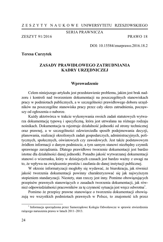 Z E S Z Y T Y N A U K O W E UNIWERSYTETU RZESZOWSKIEGO SERIA PRAWNICZA ZESZYT 91/2016 PRAWO 18 DOI: 10.15584/znurprawo.2016.18.2 Teresa Curzytek ZASADY PRAWIDŁOWEGO ZATRUDNIANIA KADRY URZĘDNICZEJ Wprowadzenie Celem niniejszego artykułu jest przedstawienie problemu, jakim jest brak nadzoru i kontroli nad tworzeniem dokumentacji na poszczególnych stanowiskach pracy w podmiotach publicznych, a w szczególności prawidłowego doboru urzędników na poszczególne stanowiska pracy przez cały okres zatrudnienia, począwszy od ogłoszenia o naborze. Każdy aktotwórca w trakcie wykonywania swoich zadań statutowych wytwarza dokumentację typową i specyficzną, która jest utrwalana na różnego rodzaju nośnikach. Dokumentacja ta rejestruje działalność jednostki od strony technicznej oraz prawnej, a w szczególności odzwierciedla sposób podejmowania decyzji, planowania, realizacji określonych zadań gospodarczych, administracyjnych, politycznych, społecznych, oświatowych czy zawodowych. Jest także podstawowym źródłem informacji o danym podmiocie, a tym samym stanowi niezbędny czynnik sprawnego zarządzania. Dlatego prawidłowe tworzenie dokumentacji jest bardzo istotne dla działalności danej jednostki. Ponadto jakość wytwarzanej dokumentacji stanowi o wizerunku, który w dzisiejszych czasach jest bardzo ważny z uwagi na to, że wpływa na zwiększenie prestiżu i zaufania do danej instytucji publicznej. W okresie informatyzacji mogłoby się wydawać, że biurokracja, jak również jakość tworzenia dokumentacji powinny charakteryzować się jak najwyższym stopieniem standaryzacji. Niestety, stan rzeczy jest inny. Pomimo obowiązujących przepisów prawnych stanowiących o zasadach tworzenia dokumentacji, jak również odpowiedzialności pracowników za tę czynność sytuacja jest wręcz odwrotna1. Pomimo że przepisy prawne stanowiące o tworzeniu dokumentacji obowiązują we wszystkich podmiotach prawnych w Polsce, to znajomość ich przez 1 Informacja sporządzona przez Samorządowe Kolegia Odwoławcze w sprawie stwierdzenia rażącego naruszenia prawa w latach 2011–2013. 24 urzędników nie jest taka sama, nie jest również jednakowo egzekwowana przez kierownictwo jednostki, w wyniku czego za błędy popełniane przez urzędników odpowiedzialność finansową ponosi Skarb Państwa, stając się dłużnikiem wobec obywateli. Obywatele natomiast ponoszą niewspółmierne straty majątkowe niejednokrotnie doprowadzające do utraty całego dorobku życia. Obowiązujące przepisy dotyczące nakładania na urzędników kar finansowych okazały się nieskuteczne 2 . Ustawa o odpowiedzialności majątkowej funkcjonariuszy publicznych, która weszła w życie w 2011 r., już na etapie projektowania wzbudzała dużo kontrowersji, o czym świadczy m.in. wystawiona na zlecenie Biura Analiz Sejmowych opinia prof. nadzw. UG dr hab. Ewy Bagińskiej, która stwierdziła, że „projekt ustawy należy odrzucić, jako oparty na błędnych założeniach, godzących w utrwalone historycznie zasady cywilnej odpowiedzialności regresowej oraz naruszający kanony podziału władzy, a ponadto ze względu na niezupełne podmiotowe i przedmiotowe ujęcie problematyki, niejasności terminologiczne i zbędną ingerencję w fundamentalne akty prawne regulujące postępowanie administracyjne, sądowo-administracyjne oraz podatkowe”3. Po 4 latach od wejścia w życie ww. ustawy przeprowadzone przez autorkę badania dotyczące jej działania wykazały, że założenia ustawy, które miały doprowadzić do zminimalizowania prowadzonych spraw z rażącym naruszeniem przepisów, odniosły skutek odwrotny – liczba spraw z rażącym naruszeniem prawa wzrosła, natomiast pracownicy, aby uniknąć kar, ubezpieczyli się od odpowiedzialności majątkowej4. Konsekwencje nieprawidłowego tworzenia dokumentacji przez urzędników W celu właściwego i sprawnego funkcjonowania każdy podmiot powinien stosować przepisy prawne, które stanowią o tworzeniu dokumentacji pod względem technicznym i prawnym. Jakość wytwarzanej dokumentacji uzależniona jest od znajomości przepisów prawa przez urzędnika. Urzędnicy przez wadliwe rozstrzygnięcia administracyjne oraz działania podejmowane poza postępowaniem administracyjnym lub przez nieuzasadnioną bierność wyrządzają obywatelom oraz przedsiębiorcom niejednokrotnie bardzo poważne szkody natury materialnej, psychicznej – w najbardziej 2 Ustawa z 20 stycznia 2011 r. o odpowiedzialności majątkowej funkcjonariuszy publicznych (DzU nr 34, poz. 173). 3 Biuro Analiz Sejmowych, Opinia zlecona, Opinia prawna o projekcie ustawy o szczególnych zasadach odpowiedzialności funkcjonariuszy publicznych za rażące naruszenie prawa (druk sejmowy nr 1407), Toruń 2009. 4 http://www.fundacjaskarbowosci.pl/files/articles/4/umowa_generalna_2015.pdf. 25 drastycznych przypadkach dochodzi do spektakularnych bankructw i likwidacji setek miejsc pracy, np. głośna sprawa R. Kluski, prezesa Optimusa5. Problem poruszony w artykule sprowokował autorkę do postawienia następujących pytań badawczych: Jakie są konsekwencje nieprawidłowego tworzenia dokumentacji przez urzędników? Czy obowiązujący nadzór kierowniczy nad prawidłowym tworzeniem dokumentacji jest należycie prowadzony pod względem terminowości, merytoryki i prawnym? Czy kierownictwo wyciąga wnioski z nieprawidłowego tworzenia dokumentacji? Czy podczas oceny okresowej pracownika6 jest brane pod uwagę prawidłowe tworzenie dokumentacji? Czy urzędnicy są pociągani do odpowiedzialności za nieprawidłowe tworzenie dokumentacji pod względem technicznym i prawnym? Przeanalizowanie zasad i podstaw prawnych dotyczących odpowiedzialności urzędników za powierzone im czynności związane z tworzeniem dokumentacji powinno dać odpowiedź, w czym tkwi problem nierzetelności i w jaki sposób należałoby go rozwiązać. Aby dogłębnie zbadać problem, w niniejszym artykule przytoczono akty pra