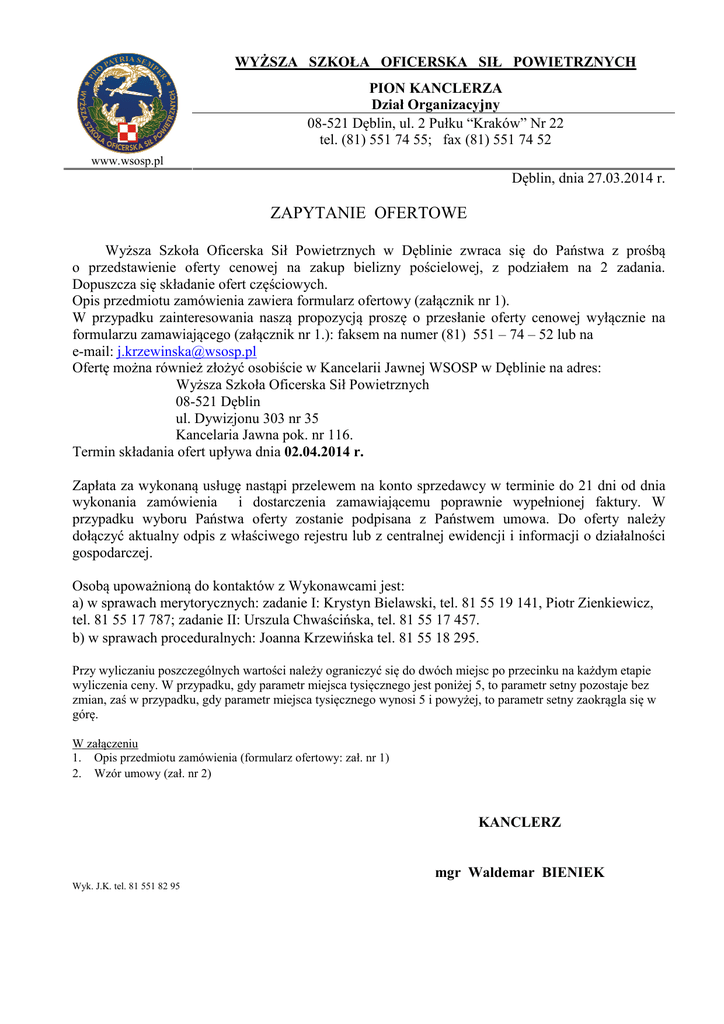 WYŻSZA SZKOŁA OFICERSKA SIŁ POWIETRZNYCH PION KANCLERZA Dział Organizacyjny 08-521 Dęblin, ul. 2 Pułku “Kraków” Nr 22 tel. (81) 551 74 55; fax (81) 551 74 52 www.wsosp.pl Dęblin, dnia 27.03.2014 r. ZAPYTANIE OFERTOWE Wyższa Szkoła Oficerska Sił Powietrznych w Dęblinie zwraca się do Państwa z prośbą o przedstawienie oferty cenowej na zakup bielizny pościelowej, z podziałem na 2 zadania. Dopuszcza się składanie ofert częściowych. Opis przedmiotu zamówienia zawiera formularz ofertowy (załącznik nr 1). W przypadku zainteresowania naszą propozycją proszę o przesłanie oferty cenowej wyłącznie na formularzu zamawiającego (załącznik nr 1.): faksem na numer (81) 551 – 74 – 52 lub na e-mail: [email protected] Ofertę można również złożyć osobiście w Kancelarii Jawnej WSOSP w Dęblinie na adres: Wyższa Szkoła Oficerska Sił Powietrznych 08-521 Dęblin ul. Dywizjonu 303 nr 35 Kancelaria Jawna pok. nr 116. Termin składania ofert upływa dnia 02.04.2014 r. Zapłata za wykonaną usługę nastąpi przelewem na konto sprzedawcy w terminie do 21 dni od dnia wykonania zamówienia i dostarczenia zamawiającemu poprawnie wypełnionej faktury. W przypadku wyboru Państwa oferty zostanie podpisana z Państwem umowa. Do oferty należy dołączyć aktualny odpis z właściwego rejestru lub z centralnej ewidencji i informacji o działalności gospodarczej. Osobą upoważnioną do kontaktów z Wykonawcami jest: a) w sprawach merytorycznych: zadanie I: Krystyn Bielawski, tel. 81 55 19 141, Piotr Zienkiewicz, tel. 81 55 17 787; zadanie II: Urszula Chwaścińska, tel. 81 55 17 457. b) w sprawach proceduralnych: Joanna Krzewińska tel. 81 55 18 295. Przy wyliczaniu poszczególnych wartości należy ograniczyć się do dwóch miejsc po przecinku na każdym etapie wyliczenia ceny. W przypadku, gdy parametr miejsca tysięcznego jest poniżej 5, to parametr setny pozostaje bez zmian, zaś w przypadku, gdy parametr miejsca tysięcznego wynosi 5 i powyżej, to parametr setny zaokrągla się w górę. W załączeniu 1. Opis przedmiotu zamówienia (formularz ofertowy: zał. nr 1) 2. Wzór umowy (zał. nr 2) KANCLERZ mgr Waldemar BIENIEK Wyk. J.K. tel. 81 551 82 95 Załącznik nr 1 FORMULARZ OFERTOWY Zadanie I W odpowiedzi na zapytanie składamy ofertę. Szczegółowy opis przedmiotu zamówienia Przedmiotem zamówienia są: • kołdry – ilość: 50 sztuk. Kołdra o wymiarach 160/200 cm, z oblamówką, wypełnienie silikonowe, poszycie bawełna + mikrofaza. • poszewki na poduszkę – ilość: 200 sztuk. Poszewka o wymiarach 70x80 cm, wykonana z bawełny 100%, kolor jasny wzorzysty, gramatura 150g/m2. L.p. Nazwa przedmiotu Ilość sztuk 1 Kołdra 50 2 Poszewka na poduszkę 200 Cena jednostkowa netto VAT % Wartość netto zamówienia Wartość brutto zamówienia SUMA Termin dostawy: do 30.04.2014 r. Gwarancja: 24 miesiące. Koszt dostawy po stronie wykonawcy: wliczony w cenę towaru. Dostawa jednorazowa. Termin płatności: płatność w ciągu 21 dni od daty otrzymania faktury. Zobowiązuję się wykonać usługę zgodnie z umową i/lub formularzem ofertowym. ……………………………….…… Miejscowość , data …………………………….. Wykonawca FORMULARZ OFERTOWY Zadanie II W odpowiedzi na zapytanie składamy ofertę. Szczegółowy opis przedmiotu zamówienia Lp. Nazwa Ilość sztuk cena netto wartość netto zamówienia Vat 1 Poszewka - 80x70 cm z zakładką 20 cm z tkaniny Musso: skład - 100 % bawełna, splot - satynowo-atłasowy (adamszek), gramatura - 155 ± 6/ m2; kolor złoty- deseń pasy 70 23% 2 Poszwa - 160x200 cm, zakładka 30 cm z tkaniny Musso: skład - 100 % bawełna, splot - satynowo-atłasowy (adamszek), gramatura - 155 ± 6/ m2; kolor złoty- deseń pasy 70 23% 60 23% 10 23% 70 23% 70 23% 10 23% 60 23% 140 23% 200 23% 4 5 6 7 8 9 10 11 Prześcieradło - 160x220 obszywane czterostronnie z tkaniny Musso: skład - 100 % bawełna, splot - satynowo-atłasowy (adamszek), gramatura - 155 ± 6/m2; kolor złotydeseń pasy Prześcieradło - 180x220 obszywane czterostronnie z tkaniny Musso: skład - 100 % bawełna, splot - satynowo-atłasowy (adamszek), gramatura - 155 ± 6/m2; kolor złotydeseń pasy Ręcznik deseń gładki- biel klasyczna, gramatura 550/m2, obszyte podwójnym szwem z czterech stron; wymiar 50x100 cm Ręcznik deseń gładki- biel klasyczna, gramatura 550/m2, obszyte są podwójnym szwem z czterech stron; wymiar 70x140 cm Ochraniacz na materac, skład: frotte+poliuretan, gramatura: 140/m2, rozmiar 140x200 cm. Temperatura prania – 95C . Ochraniacz na materac, skład: frotte+poliuretan, gramatura: 140/m2, rozmiar 90x200 cm. Temperatura prania – 95C . Bankietówka 43x43 cm- obszywane czterostronnie, wykonana jest z tkaniny ALIGATOR, bawełna 100 %, w kolorze łosoś, deseń kosteczka Bankietówka 43x43 cm- obszywane czterostronnie, wykonana jest z tkaniny ALIGATOR, bawełna 100%, w kolorze stary róż, deseń kosteczka RAZEM : wartość brutto zamówienia 23% Uwaga! Tolerancję w rozmiarze ± 3%. Tkaniny użyte do uszycia konfekcji muszą być wyprodukowane zgodnie z warunkami technicznymi zawartymi w PN. Do oferty należy dołączyć próbki tkanin Aligator i Musso oraz zdjęcia wszystkich pozycji wyrobów gotowych celem oceny zgodności z opisem przedmiotu zamówienia. Termin dostawy: 14 dni od dnia podpisania umowy. Koszt dostawy po stronie wykonawcy: wliczony w cenę towaru. Dostawa jednorazowa. Termin płatności: płatność w ciągu 21 dni od daty otrzymania faktury. Zobowiązuję się wykonać usługę zgodnie z umową i/lub formularzem ofertowym. ……………………………….…… Miejscowość , data …………………………….. Wykonawca