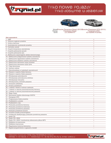 ModelPorsche Panamera Diesel (2012-) Porsche Panamera GTS (2012-) Wersja Panamera Diesel Panamera GTS Silnik 3,0 250KM AT 4,8 430KM AT(PDK) Opis wyposażenia 1 - ABS 2 - Aktywne zaglowki przednie 3 - Antena dachowa 4 - Automatyczne wycieraczki przednie 5 - Centralny zamek 6 - Czujnik temperatury zewnetrznej 7 - Czujniki parkowania (przod) 8 - Czujniki parkowania (tyl) 9 - Elektryczne wspomaganie ukladu kierowniczego 10 - Elektrycznie podgrzewane lusterka zewnetrzne 11 - Elektrycznie regulowane lusterka zewnetrzne 12 - Elektrycznie skladane lusterka zewnetrzne 13 - Elektrycznie sterowane szyby przednie 14 - Elektrycznie sterowane szyby tylne 15 - Felgi aluminiowe 16 - Kamera cofania 17 - Kierunkowskazy w lusterkach zewnetrznych 18 - Kieszen w oparciu fotela kierowcy 19 - Kieszen w oparciu fotela pasazera 20 - Klimatyzacja automatyczna 21 - Klimatyzacja automatyczna strefowa 22 - Klimatyzacja manualna 23 - Klimatyzowany schowek pasazera 24 - Komputer pokladowy 25 - Kurtyny powietrzne 26 - Lusterka i klamki w kolorze nadwozia 27 - Lusterko w oslonie przeciwslonecznej kierowcy 28 - Lusterko w oslonie przeciwslonecznej pasazera 29 - Magic Seats 30 - Mocowanie fotelika dzieciecego ISOFIX 31 - Nawigacja GPS 32 - Podgrzewane fotele przednie 33 - Podlokietnik z przodu 34 - Podlokietnik z tylu 35 - Poduszka powietrzna kierowcy 36 - Poduszka powietrzna kolanowa 37 - Poduszka powietrzna pasazera 38 - Poduszki powietrzne boczne 39 - Przednie światla przeciwmgielne 40 - Przelącznik deaktywujący poduszke powietrzną pasazera 41 - Radio CD 42 - Radio CD z RDS 43 - Radio CD z RDS i mozliwością odtwarzania plikow MP3 44 - Reflektory bi-ksenonowe 45 - Reflektory ksenonowe 46 - Regulowana kolumna kierownicy 47 - Sygnal przypomnienia o zgaszeniu światel + + + + + + + + + + + + + + + + + + + + + + + + + - + + + + + + + + + + + + + + + + + + + + + + + + + + + - 48 - System doświetlenia zakretow 49 - System Follow Me Home 50 - System kontroli ciśnienia w oponach 51 - System kontroli trakcji 52 - System ograniczający skutki kolizji 53 - System rozdzielający sile hamowania EBD 54 - System utrzymania pojazdu na pasie ruchu 55 - System wspomagania sily hamowania 56 - Szklany dach panoramiczny 57 - Szyberdach (okno dachowe) 58 - Tapicerka skorzana 59 - Tempomat 60 - Tempomat adaptacyjny 61 - Tylna wycieraczka o zmiennej predkości 62 - Uchwyt na napoje (przod) 63 - Uchwyt na napoje (tyl) 64 - Uchwyty mocujące w bagazniku 65 - USB 66 - Wspomaganie ukladu kierowniczego 67 - Zderzaki w kolorze nadwozia 68 - Zmieniarka CD + + + + + + + - + + + + + + + + + + + - 4970 172 tarcze wentylowane tarcze wentylowane 2335 250 184 550 1730 2967 80 242 6,8 olej napędowy 2920 automatyczna 1931 1418 podwójne wahacze multi o¶ 6,8 7,6 7,1 4970 256 2480 430 316 520 1920 445 4806 100 288 4,5 benzyna 2920 automatyczna 1931 1408 8,0 16,1 10,9 Opis silnika 1 - Długość całkowita (mm) 2 - Emisja CO2 (g/km) 3 - Hamulce przednie 4 - Hamulce tylne 5 - Kąt natarcia (stopnie) 6 - Kąt rampowy (stopnie) 7 - Kąt zejścia (stopnie) 8 - Maksymalna masa całkowita (kg) 9 - Maksymalna moc (KM) 10 - Maksymalna moc (kW) 11 - Maksymalny moment obrotowy (Nm) 12 - Masa własna (kg) 13 - Pojemność bagażnika (l) 14 - Pojemność skokowa (cm3) 15 - Pojemność zbiornika paliwa (l) 16 - Prędkość maksymalna (km/h) 17 - Przyspieszenie 0-100 km/h (sek.) 18 - Rodzaj paliwa 19 - Rozstaw osi (mm) 20 - Silnik elektryczny - Maksymalna moc (KM) 21 - Silnik elektryczny - Maksymalna moc (kW) 22 - Silnik elektryczny - Maksymalny moment (Nm) 23 - Skrzynia biegów 24 - Szerokość całkowita (mm) 25 - Wysokość całkowita (mm) 26 - Zawieszenie kół przednich 27 - Zawieszenie kół tylnych 28 - Zużycie paliwa w cyklu drogowym (l) 29 - Zużycie paliwa w cyklu miejskim (l) 30 - Zużycie paliwa w cyklu mieszanym (l)