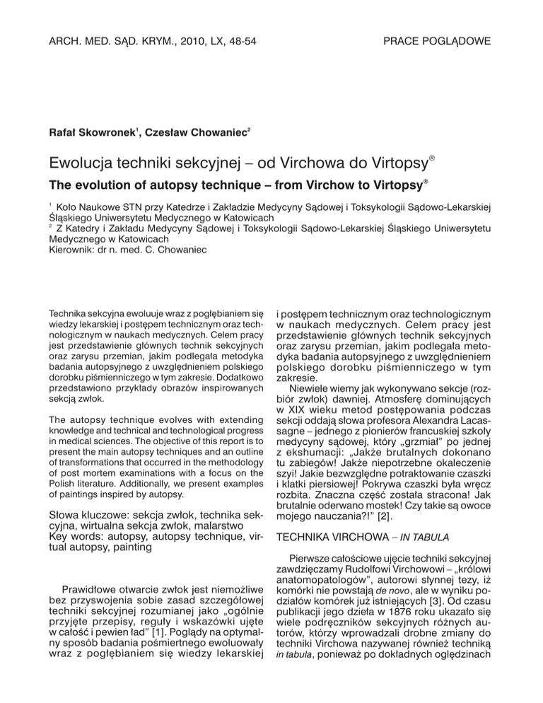 ARCH. MED. SĄD. KRYM., 2010, LX, 48-54 PRACE POGLĄDOWE Rafał Skowronek , Czesław Chowaniec 1 2 Ewolucja techniki sekcyjnej – od Virchowa do Virtopsy® The evolution of autopsy technique – from Virchow to Virtopsy® Koło Naukowe STN przy Katedrze i Zakładzie Medycyny Sądowej i Toksykologii Sądowo-Lekarskiej Śląskiego Uniwersytetu Medycznego w Katowicach 2 Z Katedry i Zakładu Medycyny Sądowej i Toksykologii Sądowo-Lekarskiej Śląskiego Uniwersytetu Medycznego w Katowicach Kierownik: dr n. med. C. Chowaniec 1 Technika sekcyjna ewoluuje wraz z pogłębianiem się wiedzy lekarskiej i postępem technicznym oraz technologicznym w naukach medycznych. Celem pracy jest przedstawienie głównych technik sekcyjnych oraz zarysu przemian, jakim podlegała metodyka badania autopsyjnego z uwzględnieniem polskiego dorobku piśmienniczego w tym zakresie. Dodatkowo przedstawiono przykłady obrazów inspirowanych sekcją zwłok. The autopsy technique evolves with extending knowledge and technical and technological progress in medical sciences. The objective of this report is to present the main autopsy techniques and an outline of transformations that occurred in the methodology of post mortem examinations with a focus on the Polish literature. Additionally, we present examples of paintings inspired by autopsy. Słowa kluczowe: sekcja zwłok, technika sekcyjna, wirtualna sekcja zwłok, malarstwo Key words: autopsy, autopsy technique, virtual autopsy, painting Prawidłowe otwarcie zwłok jest niemożliwe bez przyswojenia sobie zasad szczegółowej techniki sekcyjnej rozumianej jako „ogólnie przyjęte przepisy, reguły i wskazówki ujęte w całość i pewien ład” [1]. Poglądy na optymalny sposób badania pośmiertnego ewoluowały wraz z pogłębianiem się wiedzy lekarskiej i postępem technicznym oraz technologicznym w naukach medycznych. Celem pracy jest przedstawienie głównych technik sekcyjnych oraz zarysu przemian, jakim podlegała metodyka badania autopsyjnego z uwzględnieniem polskiego dorobku piśmienniczego w tym zakresie. Niewiele wiemy jak wykonywano sekcje (rozbiór zwłok) dawniej. Atmosferę dominujących w XIX wieku metod postępowania podczas sekcji oddają słowa profesora Alexandra Lacassagne – jednego z pionierów francuskiej szkoły medycyny sądowej, który „grzmiał” po jednej z ekshumacji: „Jakże brutalnych dokonano tu zabiegów! Jakże niepotrzebne okaleczenie szyi! Jakie bezwzględne potraktowanie czaszki i klatki piersiowej! Pokrywa czaszki była wręcz rozbita. Znaczna część została stracona! Jak brutalnie oderwano mostek! Czy takie są owoce mojego nauczania?!” [2]. TECHNIKA VIRCHOWA – IN TABULA Pierwsze całościowe ujęcie techniki sekcyjnej zawdzięczamy Rudolfowi Virchowowi – „królowi anatomopatologów”, autorowi słynnej tezy, iż komórki nie powstają de novo, ale w wyniku podziałów komórek już istniejących [3]. Od czasu publikacji jego dzieła w 1876 roku ukazało się wiele podręczników sekcyjnych różnych autorów, którzy wprowadzali drobne zmiany do techniki Virchowa nazywanej również techniką in tabula, ponieważ po dokładnych oględzinach Nr 1 EWOLUCJA TECHNIKI SEKCYJNEJ narządu i ustaleniu jego położenia względem otoczenia Virchow wycinał narząd i sekcjonował go poza zwłokami bezpośrednio na stole sekcyjnym. TECHNIKA ROKITANSKY’EGO – IN SITU Współczesny Virchowowi patolog wiedeński – Karl von Rokitansky, nazywany również „księciem anatomopatologów austriackich”, stosował inną technikę, lecz niestety nie ogłosił jej drukiem. Na szczęście, przechowała się ona w tradycji jego uczniów, np. podręczniku Hannsa Chiariego wydanym po raz pierwszy w 1894 roku [4]. „Rokitansky sekcjonował narządy in situ, tj. nie oddzielał, nie odcinał narządu od innych, badał go i rozkrawał lub otwierał na miejscu, gdzie narząd się znajduje” [1]. TECHNIKA ZENKERA – „EN BLOC” W 1913 roku ukazała się „Technika sekcyjna Zenkera” autorstwa Gustava Hausera, w której przedstawiono „rękoczyny” stojące na pograniczu pomiędzy technikami Virchowa i Rokitansky’ego, czyli sekcjonowanie narządów w określonych konglomeratach zwanych blokami narządowymi (technika „en bloc”) [5]. Zenker „zalecał badanie narządów poza zwłokami, ale w pewnym zespole, jak: oddzielnie badanie wyciętych razem narządów szyi i klatki piersiowej, oddzielnie badanie narządów jamy brzusznej według układów (przewód pokarmowy w całości, układ moczowy), oddzielnie narządów miednicy” [1]. W literaturze anglojęzycznej technika ta często jest określana jako technika Ghona od nazwiska jednego z jej współtwórców. TECHNIKA LETULLE – „EN MASSE” Francuski patolog Maurice Letulle w 1903 roku zaproponował własną odmianę techniki sekcyjnej [6]. Nie dzielił narządów wewnętrznych tylko wycinał i wyciągał je ze zwłok in toto, w jednym bloku narządowym (technika „en masse”). Narządy sekcjonował już na stoliku. Dzięki tej technice zachowane zostają wzajemne relacje w zakresie anatomii topograficznej oraz, co ważne, unaczynienie. Nierzadko technika Letulle bywa mylnie nazywana techniką Rokitansky’ego. 49 WADY I ZALETY KLASYCZNYCH TECHNIK SEKCYJNYCH Każda z powyższych technik ma swoje wady i zalety. Według Virchowa, nie ma sensu nie wycinać narządów po ich dokładnych oględzinach w „naturalnym otoczeniu”. Technika ta jest najszybsza, stosunkowo łatwa, nie wymaga wiele wysiłku i daje dość dokładny obraz sekcyjny. Podczas nauczania w ośrodkach akademickich technika ta daje lepsze efekty, gdyż zabiera niewiele czasu, wszyscy studenci lub lekarze mogą zobaczyć dany narząd; podczas pokazów teoretycznych wygodniej dla wykładowcy jest mieć narząd wycięty, niż całe zwłoki, a poza tym liczba szczegółów nie rozprasza wtedy uwagi obserwatora. Wartość techniki in situ dobrze oddają słowa profesora Paszkiewicza: „Kto opanuje te