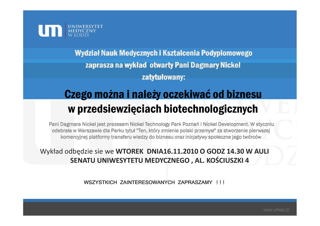 Wydział Nauk Medycznych i Ksztalcenia Podyplomowego zaprasza na wykład otwarty Pani Dagmary Nickel zatytułowany: Czego można i należy oczekiwać od biznesu w przedsiewzięciach biotechnologicznych Pani Dagmara Nickel jest prezesem Nickel Technology Park Poznań i Nickel Development. W styczniu odebrała w Warszawie dla Parku tytuł "Ten, który zmienia polski przemysł" za stworzenie pierwszej komercyjnej platformy transferu wiedzy do biznesu oraz inicjatywy społeczne jego twórców Wykład odbędzie sie we WTOREK DNIA16.11.2010 O GODZ 14.30 W AULI SENATU UNIWESYTETU MEDYCZNEGO , AL. KOŚCIUSZKI 4 WSZYSTKICH ZAINTERESOWANYCH ZAPRASZAMY !!!