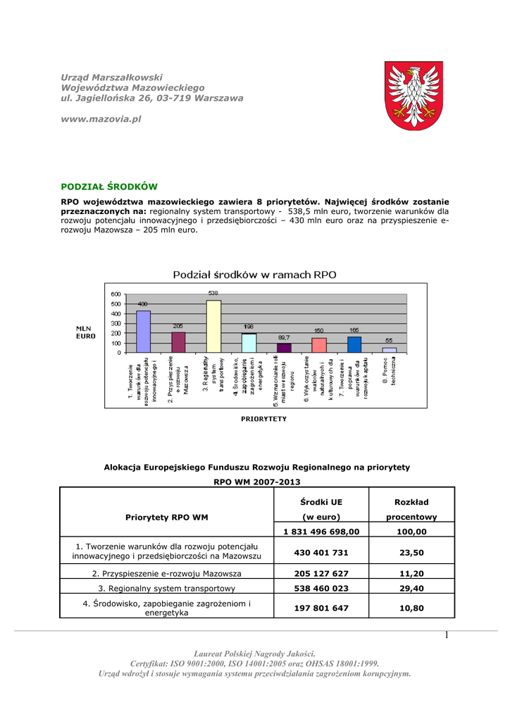 Urząd Marszałkowski Województwa Mazowieckiego ul. Jagiellońska 26, 03-719 Warszawa www.mazovia.pl PODZIAŁ ŚRODKÓW RPO województwa mazowieckiego zawiera 8 priorytetów. Najwięcej środków zostanie przeznaczonych na: regionalny system transportowy - 538,5 mln euro, tworzenie warunków dla rozwoju potencjału innowacyjnego i przedsiębiorczości – 430 mln euro oraz na przyspieszenie erozwoju Mazowsza – 205 mln euro. Alokacja Europejskiego Funduszu Rozwoju Regionalnego na priorytety RPO WM 2007-2013 Środki UE Rozkład (w euro) procentowy 1 831 496 698,00 100,00 1. Tworzenie warunków dla rozwoju potencjału innowacyjnego i przedsiębiorczości na Mazowszu 430 401 731 23,50 2. Przyspieszenie e-rozwoju Mazowsza 205 127 627 11,20 3. Regionalny system transportowy 538 460 023 29,40 4. Środowisko, zapobieganie zagrożeniom i energetyka 197 801 647 10,80 Priorytety RPO WM 1 Laureat Polskiej Nagrody Jakości. Certyfikat: ISO 9001:2000, ISO 14001:2005 oraz OHSAS 18001:1999. Urząd wdrożył i stosuje wymagania systemu przeciwdziałania zagrożeniom korupcyjnym. Urząd Marszałkowski Województwa Mazowieckiego ul. Jagiellońska 26, 03-719 Warszawa www.mazovia.pl 5. Wzmacnianie roli miast w rozwoju regionu 89 743 340 4,90 6. Wykorzystanie walorów naturalnych i kulturowych dla rozwoju turystyki i rekreacji 150 182726 8,20 7. Tworzenie i poprawa warunków dla rozwoju kapitału ludzkiego 164 834 703 9,00 8. Pomoc techniczna 54 944 901 3,00 2 Laureat Polskiej Nagrody Jakości. Certyfikat: ISO 9001:2000, ISO 14001:2005 oraz OHSAS 18001:1999. Urząd wdrożył i stosuje wymagania systemu przeciwdziałania zagrożeniom korupcyjnym.
