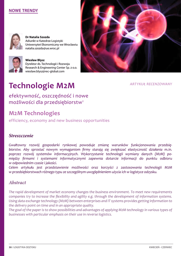 NOWE TRENDY Dr Natalia Szozda Adiunkt w Katedrze Logistyki Uniwersytet Ekonomiczny we Wrocławiu [email protected] Wiesław Błysz Dyrektor ds. Technologii i Rozwoju Research & Engineering Center Sp. z o.o. [email protected] Technologie M2M artykuł recenzowany efektywność, oszczędność i nowe możliwości dla przedsiębiorstw 1 M2M Technologies efficiency, economy and new business opportunities Streszczenie Gwałtowny rozwój gospodarki rynkowej powoduje zmianę warunków funkcjonowania przedsiębiorstw. Aby sprostać nowym wymaganiom firmy starają się zwiększać elastyczność działania m.in. poprzez rozwój systemów informacyjnych. Wykorzystanie technologii wymiany danych (M2M) pomiędzy firmami i systemami informatycznymi zapewnia dotarcie informacji do punktu odbioru w odpowiednim czasie i jakości. Celem artykułu jest przedstawienie możliwości oraz korzyści z zastosowania technologii M2M w przedsiębiorstwach różnego typu ze szczególnym uwzględnieniem użycia ich w logistyce odzysku. Abstract The rapid development of market economy changes the business environment. To meet new requirements companies try to increase the flexibility and agility e.g. through the development of information systems. Using data exchange technology (M2M) between enterprises and IT systems provides getting information to the delivery point on time and in an appropriate quality. The goal of the paper is to show possibilities and advantages of applying M2M technology in various types of businesses with particular emphasis on their use in reverse logistics. 30 / LOGISTYKA ODZYSKU KWIECIEŃ - CZERWIEC P oczątki rozwoju technologii M2M to telemetria i przesyłanie danych pomiarowych na odległość. Jedno z pierwszych zastosowań to transmisja danych z pojazdów kosmicznych oraz samochodów Formuły 1. Pierwsze rozwiązania wymagały dużych nakładów finansowych, obecnie technologia ta jest powszechna, a zakres jej użycia ciągle się poszerza między innymi przez postęp technologiczny, miniaturyzację urządzeń i rozwój technologii sieciowych2. Technologia M2M Technologie komunikacji M2M (ang. machine to machine communication) to element sieciowych systemów wymiany danych, pozwalający na rejestrację zdarzeń, które są przekazywane za pośrednictwem sieci bezprzewodowych, przewodowych lub hybrydowych do aplikacji (oprogramowania)3. Istnieje wiele różnych możliwości podłączenia urządzeń i komunikacji między nimi, jakkolwiek można wyróżnić cztery podstawowe etapy wspólne dla każdej aplikacji M2M4: 1.gromadzenie danych, 2.przekazanie wybranych danych za pośrednictwem sieci łączności komórkowej, 3.odbiór danych w systemie, z którego dany użytkownik korzysta lub w systemie dedykowanym dla technologii M2M, 4.zarządzanie informacjami, generowanie raportów, automa- tyzacja procesów, ekstrakcja wartości zebranych danych. Rozwiązania M2M to logiczne kombinacje różnych technologii: elektronicznych (takich jak czujniki, RFiD i modemy), teleko- interfaces interfaces Mobile networks internet ŹRÓDŁO DANYCH czujnik / system wbudowany oprogramowanie / sprzęt wbudowany URZĄDZENIA DO KOMUNIKACJI BEZPRZEWODOWEJ oprogramowanie / sprzęt wbudowany Rys 1. Sposób działania technologii M2M Źródło: REC sp. z o.o. APLIKACJE TELEMATYCZNE zdalne sterowanie zarządzanie zasobami telemetria Smart Meteric / Smart Grid INTERFEJS UŻYTKOWNIKA integracja z platformami internetowymi (WEB 2.0) integracja z systemem IT klienta, ECR, CRM munikacyjnych (jak CPRS, WiFi, SMS i internet) i informatycznych (tj. XML i systemy informacyjne)5. Urządzenia komunikujące się z serwerem (np. liczniki, panele słoneczne, wiatraki, samochody) wyposażone są we wbudowany system, umożliwiający przesyłanie danych. Systemy i aplikacje telematyczne6 u odbiorcy pozwalają na komunikację elektroniczną poprzez sieci rozległe WAN, lokalne LAN, sieci telekomunikacji ruchomej lub systemy satelitarne, z tym że ze względu na zasięg i koszty najczęściej wykorzystuje się telekomunikację ruchomą, czyli komórkową. Nadawany sygnał jest odbierany i prezentowany w postaci informacji dla administratora lub użytkowanika systemu. Zazwyczaj przesyłane dane są integrowane do systemów klasy ERP (ang. Enterprise Resource Planning) lub CRM (ang. Customer Relationship Management). Możliwości i korzyści stosowania komunikacji M2M w przedsiębiorstwach Wykorzystanie technologii M2M determinuje szeroki zakres korzyści. Aktualne informacje przekazywane pomiędzy urządzeniami pozwalają na podjęcie w czasie rzeczywistym odpowiednich decyzji. Mają duże znaczenie w osiąganiu większej wydajności, usprawnieniu działań i procesów, terminowym podejmowaniu decyzji i poprawie obsługi7. Ciągłe monitorowanie i zdalne zarządzanie urządzeniami przez przedsiębiorstwa, czy też użytkowników pozwala na natychmiastową reakcję na nieodpowiednie użytkowanie i uszkodzenia nawet w odległych, trudno dostępnych miejscach. Powiązanie systemów M2M z systemami do zarządzania serwisem w znaczny sposób poprawia ich efektywność, a także wspomaga ciągłość operacyjną obsługiwanych systemów. Technologie M2M zapewniają podejmowanie decyzji w oparciu o bezpośrednie potrzeby, ograniczając problemy związane między innymi z nadmiernymi stanami zapasów. Zgromadzone dane w dłuższym okresie przynoszą dodatkowe informacje statystyczne o niezawodności i wydajności systemów. Technologie M2M są powszechnie stosowane w wielu branżach, tj. samochodowej, transportowo-logistycznej, zdalnego zarządzania i kontroli, inteligentnych pomiarów sieci, bezpieczeństwa, odnawialnych źródeł energii, elektroniki, handlu, automatyzacji gospodarstw domowych oraz opieki zdrowotnej8. Wykorzystywane są do zdalnego monitorowania stanu zdrowia pacjentów, umożliwiając pracownikom służby zdrowia reagowanie na wszelkie jego zmiany 9. Technologie M2M umożliwiają monitorowanie na bieżąco ruchu i dostosowa