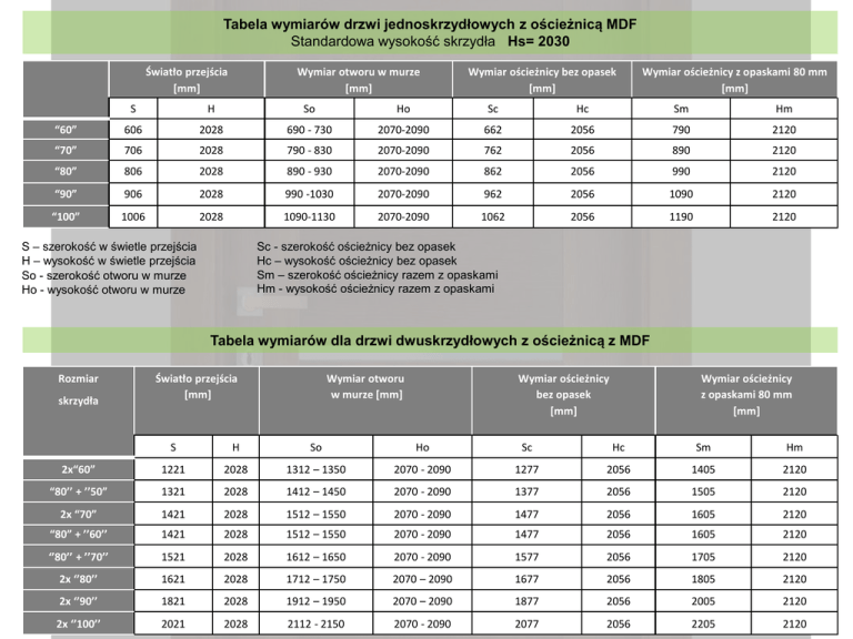 Tabela wymiarów drzwi jednoskrzydłowych z ościeżnicą MDF Standardowa wysokość skrzydła Hs= 2030 Światło przejścia [mm] Wymiar otworu w murze [mm] Wymiar ościeżnicy bez opasek [mm] Wymiar ościeżnicy z opaskami 80 mm [mm] S H So Ho Sc Hc Sm Hm “60” 606 2028 690 - 730 2070-2090 662 2056 790 2120 “70” 706 2028 790 - 830 2070-2090 762 2056 890 2120 “80” 806 2028 890 - 930 2070-2090 862 2056 990 2120 “90” 906 2028 990 -1030 2070-2090 962 2056 1090 2120 “100” 1006 2028 1090-1130 2070-2090 1062 2056 1190 2120 Sc - szerokość ościeżnicy bez opasek Hc – wysokość ościeżnicy bez opasek Sm – szerokość ościeżnicy razem z opaskami Hm - wysokość ościeżnicy razem z opaskami S – szerokość w świetle przejścia H – wysokość w świetle przejścia So - szerokość otworu w murze Ho - wysokość otworu w murze Tabela wymiarów dla drzwi dwuskrzydłowych z ościeżnicą z MDF Rozmiar skrzydła Światło przejścia [mm] Wymiar otworu w murze [mm] Wymiar ościeżnicy bez opasek [mm] Wymiar ościeżnicy z opaskami 80 mm [mm] S H So Ho Sc Hc Sm Hm 2x“60” 1221 2028 1312 – 1350 2070 - 2090 1277 2056 1405 2120 “80’’ + ’’50” 1321 2028 1412 – 1450 2070 - 2090 1377 2056 1505 2120 2x “70” 1421 2028 1512 – 1550 2070 - 2090 1477 2056 1605 2120 “80” + ’’60’’ 1421 2028 1512 – 1550 2070 - 2090 1477 2056 1605 2120 ‘’80’’ + ’’70’’ 1521 2028 1612 – 1650 2070 - 2090 1577 2056 1705 2120 2x ‘’80’’ 1621 2028 1712 – 1750 2070 – 2090 1677 2056 1805 2120 2x ‘’90’’ 1821 2028 1912 – 1950 2070 – 2090 1877 2056 2005 2120 2x ‘’100’’ 2021 2028 2112 - 2150 2070 - 2090 2077 2056 2205 2120 1 Tabela wymiarów ościeżnicy typu TUNEL dla drzwi SUWANYCH Rozmiar skrzydła Światło przejścia [mm] Wymiar otworu w murze [mm] Wymiar ościeżnicy Wymiar ościeżnicy bez opasek [mm] z opaskami 80mm [mm] Szerokość maskownicy [mm] Wysokość z maskownicą [mm] S H So Ho Sc Hc Sm Hm Smm Hmm “60” 570 2028 660-700 2070-2090 626 2056 754 2120 1540 2172 “70” 670 2028 760-800 2070-2090 726 2056 854 2120 1640 2172 “80” 770 2028 860-900 2070-2090 826 2056 954 2120 1740 2172 “90” 870 2028 960-1000 2070-2090 926 2056 1054 2120 1840 2172 Tabela wymiarów ościeżnicy typu TUNEL dla drzwi PODWÓJNYCH Rozmiar skrzydła Światło przejścia [mm] Wymiar otworu w murze [mm] Wymiar ościeżnicy bez opasek [mm] Wymiar ościeżnicy z opaskami 80 mm [mm] S H So Ho Sc Hc Sm Hm 2 x “60” 1197 2028 1280-1310 2070-2090 1253 2056 1381 2120 2 x “70” 1397 2028 1480-1510 2070-2090 1453 2056 1581 2120 2 x “80” 1597 2028 1680-1710 2070-2090 1653 2056 1781 2120 2 x “90” 1797 2028 1780-1810 2070-2090 1853 2056 1981 2120 2 x “100” 1997 2028 2080-2110 2070-2090 2053 2056 2181 2120 Tabela wymiarów dla drzwi w systemie ODWRÓCONYM Rozmiar skrzydła Światło przejścia Wymiar w murze Wymiar ościeżnicy bez opasek [mm] Wymiar ościeżnicy z opaskami luźnymi [mm] Wymiar środkowy ościeżnicy [mm] Wymiar ościeżnicy z opaskami stałymi S H So Ho Sc Hc Sml Hml Ss Hs Sm Hm “60” 574 2040 690-730 2095-2110 662 2084 802 2154 618 2062 734 2120 “70” 674 2040 790-830 2095-2110 762 2084 902 2154 718 2062 834 2120 “80” 774 2040 890-930 2095-2110 862 2084 1002 2154 818 2062 934 2120 “90” 874 2040 990-1030 2095-2110 962 2084 1102 2154 918 2062 1034 2120 “100” 974 2040 1090-1130 2095-2110 1062 2084 1202 2154 1018 2062 1134 2120