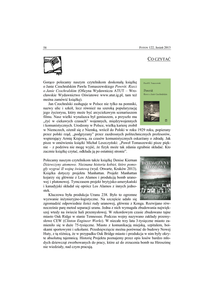 58 FOTON 122, Jesień 2013 CO CZYTAĆ Gorąco polecamy naszym czytelnikom doskonałą książkę o Janie Czochralskim Pawła Tomaszewskiego Powrót. Rzecz o Janie Czochralskim (Oficyna Wydawnicza ATUT – Wrocławskie Wydawnictwo Oświatowe www.atut.ig.pl, tam też można zamówić książkę). Jan Czochralski zasługuje w Polsce nie tylko na pomniki, nazwy ulic i szkół, lecz również na szeroką popularyzację jego życiorysu, który może być arcyciekawym scenariuszem filmu. Nasz wielki wynalazca był geniuszem, a przyszło mu „żyć w ciekawych czasach” wojennych, międzywojennych i komunistycznych. Urodzony w Polsce, wielką karierę zrobił w Niemczech, ożenił się z Niemką, wrócił do Polski w roku 1929 roku, popierany przez polski rząd, „podgryzany” przez zazdrosnych politechnicznych profesorów, wspierający Armię Krajową, za czasów komunistycznych oskarżany o zdradę. Jak pisze w omówieniu książki Michał Leszczyński: „Paweł Tomaszewski pisze pięknie – z podziwu nie mogę wyjść, że fizyk może tak zdania zgrabnie składać. Kto zacznie książkę czytać, odkłada ją po ostatniej stronie”. Polecamy naszym czytelnikom także książkę Denise Kiernan Dziewczyny atomowe. Nieznana historia kobiet, które pomogły wygrać II wojnę światową (wyd. Otwarte, Kraków 2013). Książka dotyczy projektu Manhattan. Projekt Manhattan kojarzy się głównie z Los Alamos i produkcją bomb uranowej i plutonowej. Tymczasem projekt brytyjsko-amerykański i kanadyjski składał się oprócz Los Alamos z innych jednostek. Kluczowa była produkcja Uranu 238. Było to ogromne wyzwanie inżynieryjno-logistyczne. Na szczęście udało się zgromadzić odpowiednie ilości rudy uranowej, głównie z Konga. Rozwijano równocześnie parę metod separacji uranu. Jedna z nich wymagała zbudowania największej wtedy na świecie hali przemysłowej. W rekordowym czasie zbudowano tajne miasto Oak Ridge w stanie Tennessee. Podczas wojny nazywano zakłady przemysłowe CEW (Clinton Engineer Works). W niecałe trzy lata 3-tysięczne miasto zamieniło się w duże 75-tysięczne. Miasto z komunikacją miejską, szpitalem, boiskami sportowymi i szkołami. Przedsięwzięcie można porównać do budowy Nowej Huty, z tą różnicą, że w przypadku Oak Bridge miasto i produkcja w nim były okryte absolutną tajemnicą. Historię Projektu poznajemy przez opis losów bardzo młodych dziewcząt zwerbowanych do pracy, które aż do zrzucenia bomb na Hiroszimę nie wiedziały, nad czym pracują.