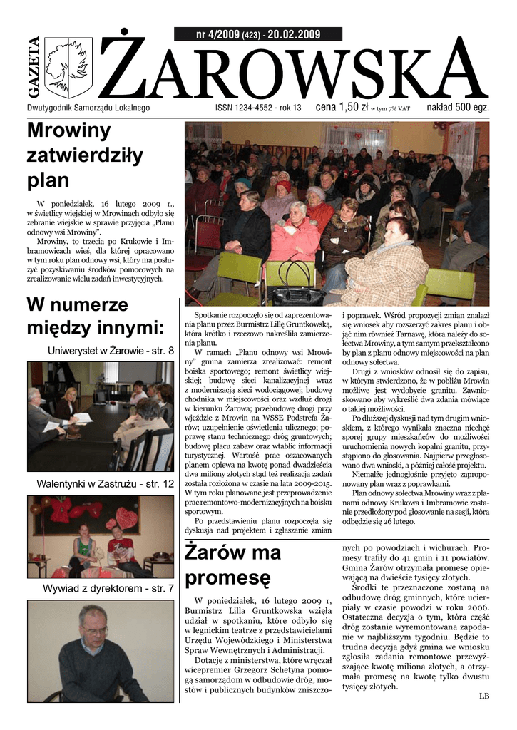 nr 4/2009 (423) - 20.02.2009 Dwutygodnik Samorządu Lokalnego ISSN 1234-4552 - rok 13 cena 1,50 zł w tym 7% VAT nakład 500 egz. Mrowiny zatwierdziły plan W poniedziałek, 16 lutego 2009 r., w świetlicy wiejskiej w Mrowinach odbyło się zebranie wiejskie w sprawie przyjęcia „Planu odnowy wsi Mrowiny”. Mrowiny, to trzecia po Krukowie i Imbramowicach wieś, dla której opracowano w tym roku plan odnowy wsi, który ma posłużyć pozyskiwaniu środków pomocowych na zrealizowanie wielu zadań inwestycyjnych. W numerze między innymi: Uniwerystet w Żarowie - str. 8 Walentynki w Zastrużu - str. 12 Wywiad z dyrektorem - str. 7 Spotkanie rozpoczęło się od zaprezentowania planu przez Burmistrz Lillę Gruntkowską, która krótko i rzeczowo nakreśliła zamierzenia planu. W ramach „Planu odnowy wsi Mrowiny” gmina zamierza zrealizować: remont boiska sportowego; remont świetlicy wiejskiej; budowę sieci kanalizacyjnej wraz z modernizacją sieci wodociągowej; budowę chodnika w miejscowości oraz wzdłuż drogi w kierunku Żarowa; przebudowę drogi przy wjeździe z Mrowin na WSSE Podstrefa Żarów; uzupełnienie oświetlenia ulicznego; poprawę stanu technicznego dróg gruntowych; budowę placu zabaw oraz wtablic informacji turystycznej. Wartość prac oszacowanych planem opiewa na kwotę ponad dwadzieścia dwa miliony złotych stąd też realizacja zadań została rozłożona w czasie na lata 2009-2015. W tym roku planowane jest przeprowadzenie prac remontowo-modernizacyjnych na boisku sportowym. Po przedstawieniu planu rozpoczęła się dyskusja nad projektem i zgłaszanie zmian Żarów ma promesę W poniedziałek, 16 lutego 2009 r, Burmistrz Lilla Gruntkowska wzięła udział w spotkaniu, które odbyło się w legnickim teatrze z przedstawicielami Urzędu Wojewódzkiego i Ministerstwa Spraw Wewnętrznych i Administracji. Dotacje z ministerstwa, które wręczał wicepremier Grzegorz Schetyna pomogą samorządom w odbudowie dróg, mostów i publicznych budynków zniszczo- i poprawek. Wśród propozycji zmian znalazł się wniosek aby rozszerzyć zakres planu i objąć nim również Tarnawę, która należy do sołectwa Mrowiny, a tym samym przekształcono by plan z planu odnowy miejscowości na plan odnowy sołectwa. Drugi z wniosków odnosił się do zapisu, w którym stwierdzono, że w pobliżu Mrowin możliwe jest wydobycie granitu. Zawnioskowano aby wykreślić dwa zdania mówiące o takiej możliwości. Po dłuższej dyskusji nad tym drugim wnioskiem, z którego wynikała znaczna niechęć sporej grupy mieszkańców do możliwości uruchomienia nowych kopalni granitu, przystąpiono do głosowania. Najpierw przegłosowano dwa wnioski, a później całość projektu. Niemalże jednogłośnie przyjęto zaproponowany plan wraz z poprawkami. Plan odnowy sołectwa Mrowiny wraz z planami odnowy Krukowa i Imbramowic zostanie przedłożony pod głosowanie na sesji, która odbędzie się 26 lutego. nych po powodziach i wichurach. Promesy trafiły do 41 gmin i 11 powiatów. Gmina Żarów otrzymała promesę opiewającą na dwieście tysięcy złotych. Środki te przeznaczone zostaną na odbudowę dróg gminnych, które ucierpiały w czasie powodzi w roku 2006. Ostateczna decyzja o tym, która część dróg zostanie wyremontowana zapodanie w najbliższym tygodniu. Będzie to trudna decyzja gdyż gmina we wniosku zgłosiła zadania remontowe przewyższające kwotę miliona złotych, a otrzymała promesę na kwotę tylko dwustu tysięcy złotych. LB 2 Gazeta Żarowska Wieści z Ratusza nr 4/2009-20.02.2009 W kilku słowach UWAGA ! Kultura i Sport Do klasy pierwszej: przyjmowane będą wszystkie dzieci urodzone w 2002 roku Gminne Centrum Kultury i Sportu, tak na dobrą sprawę, niedawno ruszyło, a już w tej chwili trudno jest zdobyć wolny termin by wynająć choćby część hali. GCKiS kontynuuje również niektóre zadania, odziedziczone po Żarowskim Ośrodku Kultury. Wielu mieszkańców naszej gminy zastanawia się – Co z tego wyniknie. Ile z tego będzie kultury, a ile sportu? Ja myślę, że należy dać szansę nowej ekipie GCKiS i nie chodzi tutaj o czas rzędu miesiąca, ale z pewnością sporo dłuższy. Nie jest możliwe, by tak szeroko rozumiane połączenie kultury i sportu od razu „zatrybiło” i to pod każdym względem w ciągu kilku dni. Na pewno Dyrektor tego obiektu, nie ma łatwego zadania i z pewnością okazana mu cierpliwość i zrozumienie, byłyby czymś w rodzaju „mandatu zaufania”. Ja taki „mandat” ze swojej strony przekazuję Zbigniewowi Malickiemu – dyrektorowi GCKiS. A TY Czytelniku, też to uczynisz? Uniwersytet Trzeciego Wieku w Żarowie Ta wspaniała inicjatywa kilku mieszkańców Żarowa, spotkała się aprobatą władz miasta i samych żarowian. Jak to w małym miasteczku bywa, wieść szybko się rozeszła i trafiła już do wielu domów – „W Żarowie będzie Uniwersytet Trzeciego Wieku!”. W Polsce istnieje już ponad 100 takich placówek działających jako stowarzyszenia, bądź sekcje przy ośrodkach kultury, przy czym te drugie nie wymagają tak dużych nakładów. W Żarowie UTW również będzie działał jako sekcja przy Centrum, co na pewno ucieszy potencjalnych słuchaczy, bo składki członkowskie będą minimalne. Dla przykładu podam, iż w Wieruszowie na początku UTW działał na zasadzie sekcji, a miesięczna składka wynosiła symboliczne 5 zł. Jak będzie w Żarowie? Myślę, że równie atrakcyjnie. Zima, zima, zima. Pada, pada śnieg… Jak w tej dziecięcej piosence – mamy puszysty, biały śnieg, w miejsce dzwoneczków – czasami zadźwięczy szczęk stłuczonego szkła reflektorów samochodowych, wokół suną sanki, bo wózkiem dziecięcym na pewno nie da się pokonać większych odcinków drogi i tylko brakuje koni, które by wyciągały samochody z rowów. Tyle związku z piosenką mają nasze drogi. Wiadomo, że czas zimy, to trudny okres. Pogoda kapryśna, a ludzie, którzy zajmują się odśnież