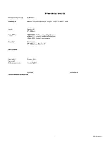 Przedmiar robót Rodzaj robót (branża): budowlana Inwestycja Remont sali gimnastycznej w budynku Zespołu Szkół w Lelisie Adres: Szkolna 51 07-402 Lelis Kody CPV: 45430000-0 - Pokrywanie podłóg i ścian 45440000-3 - Roboty malarskie i szklarskie 45453100-8 - Roboty renowacyjne Inwestor: Gmina Lelis 07-402 Lelis, ul. Szkolna 37 Wykonawca: Sporządził: Sprawdził: Data opracowania: Edward Kłos kwiecień 2014r Inwestor Strona tytułowa przedmiaru Wykonawca 1 SeKo Prix 8.2.1.1 Przedmiar Lp 1 Kod Opis 2 3 1 KNR 2-02 0925-01 Osłony okien i drzwi folią polietylenową 4,4*3,60*6+1,2*4,2+0,5*1,5*1,5*4+3,0*1,0*7+2,1*2,1*3+2,4*2,1*4+1,8*1,9+1,2*2 ,4+2,2*2,2+1,8*2,1*6+1,0*2,1*5+0,9*2,4*6+0,9*2,0*18+0,8*2,0*3+5,0*3,0 2 KNR 2-02 0925-01 Osłony ścian z tynku mozaikowego folią polietylenową 19,30*3,2*2+36,0*2,0+13,22*2,0*2+5,15*2,0 3 KNR-W 4-01 Zabezpieczenie podłóg folią 1216-01 36,0*25,15 4 Użytkowy demontaż wyposażenia [siatki, drabinki,kosze, bramki do piłki ręcznej, odboje, itp] - do ponownego montażu 1 5 KNR 2-02 1611-08 Rusztowania ramowe warszawskie wielokolumnowe wysokości do 10 m. Pozycja zawiera pracę sprzętu. 36,0*8,0*2+25,15*8,0*2 6 KNR 4-01 1211-04 Usunięcie farby olejnej ze ścian (lamperie) (5,7*10+5,2*2+3,0*8)*2,0-[(1,8*2,2+0,9*2,0*12)+(0,9*0,9*2+1,5*0,9*4)*0,5] 7 KNR 4-01 0702-06 Odbicie tynków wewnętrznych z zaprawy cementowo-wapiennej pasami o szerokości do 30 cm 50,00 8 KNR 4-01 0705-05 Wykonanie pasów tynku zwykłego kat. III o szerokości do 30 cm na ścianach z osiatkowaniem siatką cięto-ciągnioną 50,00 9 KNR 4-01 0711-02 Odbicie odstających i spękanych tynków, przygotowanie powierzchni, + KNR 4-01 umocowanie siatki cięto-ciągnionej i wykonanie tynków zwykłych wewnętrznych 0703-01 kat. III z zaprawy cementowo- wapiennej na ścianach i słupach prostokątnych (do 2 m2 w 1 miejscu) 10,00 10 KNR-W 4-01 Przecieranie istniejących tynków wewnętrznych z zeskrobaniem farby na 0713-01 ścianach 36,0*8,0+36,0*6,50+25,15*4,8+25,15*6,0+6,0*1,6*2+13,22*1,0*2+5,15*1,0*2+(5, 7*10+5,2*2+3,0*8)*0,7+(5,70*4+3,0*4)*2,7-(0,9*2,0*4+1,5*0,9*3+5,0*1,0) 11 KNR-W 4-01 Przecieranie istniejących tynków wewnętrznych z zeskrobaniem farby na 0713-0200 sufitach 36,0*6,0+5,20*5,70+5,7*3,0*7+5,7*2,0+5,7*4,0+5,7*2,2+5,7*2,5*2+13,22*5,15 12 NNRNKB 202 (z.VII) Gruntowanie podłoży preparatami wzmacniającymi - sufity 1134-02 508,663 13 NNRNKB 2-02U Gruntowanie podłoży preparatami gruntującymi - ściany 1134-0201 991,25 14 KNR 4-01 Dwukrotne malowanie starych tynków wewnętrznych ścian farbami olejnymi z 1206-0400 jednokrotnym szpachlowaniem 153,73 15 KNR 2-02 0815-03 Wewnętrzne gładzie gipsowe,jednowarstwowe na ścianach 991,25 16 KNR 2-02 Wewnętrzne gładzie gipsowe, jednowarstwowe na sufitach 0815-0500 508,66 17 KNR 2-02 1505-03 Dwukrotne malowanie farbami emulsyjnymi akrylowymi powierzchni wewnętrznych - podłoży gipsowych z gruntowaniem 508,66+991,25 18 KNR 4-01 1212-28 Dwukrotne malowanie farbą olejną rur (profili) o średnicy do 50 mm 60 19 KNR-W 2-02 Demontaż uszkodzonych istniejących listew przypodłogowych i ułożenie nowych 1122-05 w/g istniejącego wzoru 20,00 20 KNR-W 4-01 Mechaniczne szlifowanie starych posadzek z deszczułek z jednoczesnym 0816-03 uzupełnieniem fugowania podłogi 36,0*19,30 21 Odtworzenie linii wyznaczających boiska na posadzce sali gimnastycznej 1 22 KNR-W 2-02 Trzykrotne lakierowanie posadzek drewnianych (parkietów) lakierem 1122-07 poliuretanowym do posadzek o dużym natężeniu ruchu, o parametrach minimum Domalux Super Gold antypoślizgowy (wersja połysk) 694,80 2 Jm 4 m2 m2 m2 m2 m2 Ilości Ilość robót składowe 5 6 268,45 268,45 258,70 258,70 905,40 m2 kpl 905,40 kpl m2 1,00 m2 m2 m2 m 978,40 m m 50,00 m m2 50,00 m2 m2 10,00 m2 991,25 1,00 978,40 153,73 153,73 50,00 50,00 10,00 991,25 m2 508,66 m2 m2 508,66 m2 m2 508,66 m2 m2 991,25 m2 m2 m2 m2 153,73 m2 m2 508,66 m2 m m m 1 499,91 m m2 20,00 m2 kpl kpl m2 694,80 m2 694,80 508,66 991,25 153,73 991,25 991,25 508,66 1 499,91 60,00 60,00 20,00 694,80 1,00 1,00 694,80 SeKo Prix 8.2.1.1 Lp 1 Kod 2 23 KNR 2-02 1017-0200 24 KNR 2-02 1017-0200 25 KNR 4-01 1212-0500 26 KNR 2-02 1506-0700 27 Kalkulacja własna 28 Kalkulacja własna 29 Kalkulacja własdna 30 KNR 4-01 0106-04 31 KNR 4-04 1101-02 + KNR 4-04 1101-05 32 kalkulacja własna 33 KNR-W 4-02 0516-02 34 KNNR 4 0436-01 35 Kalkulacja własna 36 Kalkulacja własna 37 KNR 4-01 1215-02 38 KNR 4-01 1215-04 Opis Jm 3 4 Skrzydła drzwiowe wewnętrzne, pełne, tłoczone wzmacniane plytą wiórową otworową w okleinie z drewna o wzmocnionej odpiorności na dzałanie mechaniczne szer 90 cm z okuciami niklowanymi i zamkiem patentowycnm z wkładką. /B.I.nr 8/96/ 6,0 Skrzydła drzwiowe wewnętrzne, pełne, tłoczone wzmacniane plytą wiórową otworową w okleinie z drewna o wzmocnionej odpiorności na dzałanie mechaniczne szer 90 cm z okuciami niklowanymi i zamkiem patentowycnm z wkładką, z otworami łazienkowymi. /B.I.nr 8/96/ /B.I.nr 8/96/ 6,0 Dwukrotne malowanie farbą olejną nawierzchniową balustrad z rur i prętów prostych (2,80+4,80+4,80+4,80+4,80+4,80+2,8)*0,92 Dwukrotne malowanie farbami olejnymi,powierzchni wewnętrznych drewnianych - ławki i oparcia. (10,70+5,80+11,0)*4*0,34+(32,0+5,20)*(0,1*2+0,095*2)+(0,82+0,2)*48 Oczyszczenie rur wentylacyjnych z kurzu 1,00 Oczyszczenie konstrukcji stalowej wiązarów dachu z kurzu 1,00 Wymiana uszczelek gumowych w oknach z poliwęglanu 4,0*20+3,60*20 Usunięcie z parteru budynku gruzu 0,25 Wywóz gruzu z terenu rozbiorki przy recznym zaladowaniu i wyladowaniu samochodem skrzyniowym na odleg.do 5 km szt. Ilości Ilość robót składowe 5 6 6,00 szt. szt. 6,00 szt. m2 6,00 m2 m2 27,23 m2 kpl. kpl. kpl. kpl. m m m3 m3 m3 100,87 0,25 Spuszczenie wody z instalacji centralnego ogrzewania 1 Demontaż i powtórny montaż grzejnika stalowego dwupłytowego m3 kpl kpl kpl. 0,25 8 Próby z dokonaniem regulacji instalacji centralnego ogrzewania (na gorąco) 8 Dostawa i montaż sia
