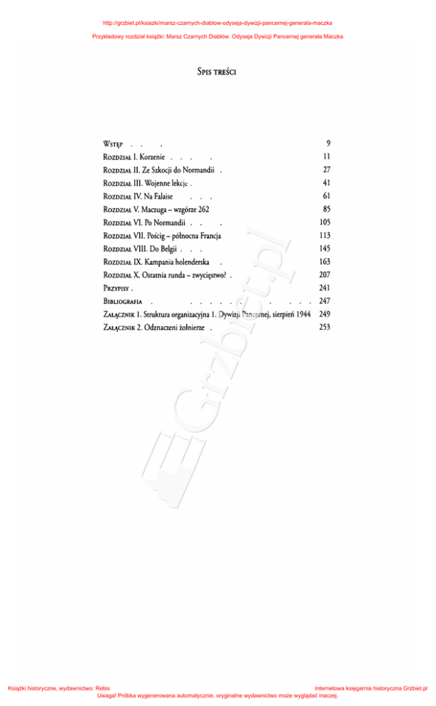 http://grzbiet.pl/ksiazki/marsz-czarnych-diablow-odyseja-dywizji-pancernej-generala-maczka Przykładowy rozdział książki: Marsz Czarnych Diabłów. Odyseja Dywizji Pancernej generała Maczka SPIS TREŚCI WSTĘP o 9 o RozDZIAŁ l. Korzenie 11 RozDZIAl II. Ze Szkocji do Normandii 27 RozDZIAl III. Wojenne lekcjt: . RozDZIAł. IV. Na Falaise RozDZIAl V. Maczuga - wzgórze 262 RoZDZIAł. VI. Po Normandii . . RozDZIAł. VII. Pościg- północna RoZDziAł. VIII. RoZDZIAł. 113 Francja 145 163 Do Belgii . . . IX. Kampania holenderska RozDZIAł. X. PRZYPISY 41 61 85 105 Ostatnia runda - zwycięstwo? . 207 241 o BIBUOGRAFIA 247 ~CZNIK l. Struktura organizacyjna l. Dywizji Pancernej, sierpień 1944 249 ~CZNIK 2. Odznaczeni żołnierze . 253 Książki historyczne, wydawnictwo: Rebis Internetowa księgarnia historyczna Grzbiet.pl Uwaga! Próbka wygenerowana automatycznie, oryginalne wydawnictwo może wyglądać inaczej. http://grzbiet.pl/ksiazki/marsz-czarnych-diablow-odyseja-dywizji-pancernej-generala-maczka Przykładowy rozdział książki: Marsz Czarnych Diabłów. Odyseja Dywizji Pancernej generała Maczka WsTĘP Monografia ta obejmuje historię polskiej jednostki pancer nej dowodzonej przez generała Maczka w okresie od l wrześ nia 1939 do okupacji Wilhelmshaven w 1945 roku. W Polsce i we Francji była to brygada, w Wielkiej Brytanii, od 1942 roku, dywizja i jej poświęcona jest lwia część książki. Pisząc ją, wykorzystywałem polskie źródła, gdyż chciałem przedsta wić autentyczny punkt widzenia polskich żołnierzy wyzwala jących Europę i mających nadzieję wyzwolić swoją ojczyznę. W największym stopniu korzystałem z monografii opisującej działania l O. Pułku Strzelców Konnych, ponieważ to on, jako jednostka zwiadowcza, czyli "oczy", l. Dywizji Pancernej naj częściej pierwszy stykał się z wrogiem. Mam dług wdzięczności wobec wielu osób, zwłaszcza wo bec mojego zmarłego sąsiada, pana Antoniego Położyńskiego to on pierwszy opowiedział mi o jednostce, o której nigdy wcześniej nie słyszałem. Jestem także dłużnikiem doktora An drew Maczka, dzięki któremu poznałem wczesne etapy karie ry jego ojca, pana Bernarda Astachnowicza z Bradford, który udostępnił mi wiele materiałów, oraz państwa Chaima i Ruth Goldbergów, którzy odpowiadali na wszystkie moje pytania aż z Kanady, podobnie jak pan Tadeusz Walewicz, który oprócz Książki historyczne, wydawnictwo: Rebis Internetowa księgarnia historyczna Grzbiet.pl Uwaga! Próbka wygenerowana automatycznie, oryginalne wydawnictwo może wyglądać inaczej. http://grzbiet.pl/ksiazki/marsz-czarnych-diablow-odyseja-dywizji-pancernej-generala-maczka Przykładowy rozdział książki: Marsz Czarnych Diabłów. Odyseja Dywizji Pancernej generała Maczka lO Wstęp odpowiedzi przysłał mi takie swoje materiały. Chciałbym też podziękować panu Bolesławowi Mazurowi, byłemu pracow nikowi University of London, który nauczył mnie tłumaczyć z polskiego. Największy dług mamy wszyscy wobec żołnierzy l. Dywi zji Pancernej, którzy oddali życie za wspólną sprawę w czasie II wojny światowej. A skąd wzięło się określenie "Czarne Diabły"? Tak ponoć Niemcy przezwali we wrześniu 1939 żołnierzy dowodzonych przez generała Maczka (nosili czarne skórzane płaszcze). Więk szość z nich wraz ze swym dowódcą trafiła do Anglii i utworzyła l. Dywizję Pancerną. A generał Maczek nosił czarny skórzany płaszcz przez cały okres wojny. Evan McGilvray Pudsey, West Yorkshire 20 lipca 2004 Książki historyczne, wydawnictwo: Rebis Internetowa księgarnia historyczna Grzbiet.pl Uwaga! Próbka wygenerowana automatycznie, oryginalne wydawnictwo może wyglądać inaczej. http://grzbiet.pl/ksiazki/marsz-czarnych-diablow-odyseja-dywizji-pancernej-generala-maczka Przykładowy rozdział książki: Marsz Czarnych Diabłów. Odyseja Dywizji Pancernej generała Maczka RozDZIAŁ I Korzenie Utworzona w czasie II wojny światowej polska l. Dywizja Pancerna składała się w większości z żołnierzy, którzy opuścili Polskę po przegranej kampanii wrześniowej będącej wynikiem niemieckiego ataku z l września 1939 roku i sowieckiego z 17 września. Ta podwójna inwazja spowodowała szybki upadek Polski, a w konsekwencji kolejny rozbiór państwa i destruk cję społeczeństwa, które zostało poddane wszelkim możliwym formom ucisku. Po raz kolejny jedynym widocznym znakiem, iż Polska nie została do końca pokonana, byli jej żołnierze wal czący na obczyźnie. Polska ma długą i zaszczytną historię militarną, której ukoronowaniem stało się przyjęcie w 1999 roku do NATO. Jednakże Polska nie zawsze istniała jako państwo - w okre sie między 1795 a 1918 rokiem państwa polskiego nie było. Proces destrukcji państwa polskiego zapoczątkował pierw szy rozbiór z 1772 roku, a zakończył trzeci przeprowadzony w roku 1795. Aż do roku 1918 Polska pozostawała pod zabo rem trzech potęg: Austrii, Rosji i Prus (od 1870 roku Niemiec). Po trzecim rozbiorze wielu Polaków wyemigrowało albo wdało się w działalność konspiracyjną wymierzoną przeciwko zabor com. Efektami tej działalności były liczne powstania wybu- Książki historyczne, wydawnictwo: Rebis Internetowa księgarnia historyczna Grzbiet.pl Uwaga! Próbka wygenerowana automatycznie, oryginalne wydawnictwo może wyglądać inaczej.