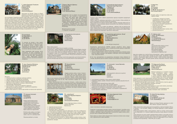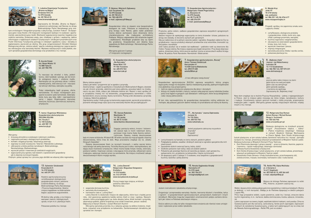 1. Lokalna Organizacja Turystyczna „Brama na Bagna” Strękowa Góra 24 16-075 Zawady tel. 85 738 43 33 www.bramanabagna.pl Zapraszamy do Ośrodka „Brama na Bagna”, malowniczo położonego nad Narwią na skraju Biebrzańskiego Parku Narodowego przy znanym ornitologom i fotografom przyrody z całej Europy „Carskim Trakcie”. Do dyspozycji gości nowy Hostel z 50 miejscami noclegowymi (pokoje 2-6 osobowe i apartamenty), sala konferencyjna i bufet. Możliwość wypożyczenia rowerów i kajaków oraz rozbicia namiotów. Drewniane wiaty, piec chlebowy z grillem i wędzarnią, tablice informujące o najbliższych szlakach turystycznych i atrakcjach przyrodniczych oraz Punkt Informacji Turystycznej pomogą w ciekawym spędzeniu czasu i doradzą w zaplanowaniu wycieczek po okolicy. Dla grup zorganizowanych Ośrodek Edukacji Ekologicznej oferuje „zielone szkoły” oparte o edukację ekologczną i zajęcia sportowo-rekreacyjne oraz warsztaty tkackie. Wystawa realistycznych rzeźb ptaków, starych sprzętów gospodarstwa domowego oraz produktów z lnu i konopi. 5. Kurnik Polski kol. Nowe Miasto 10 16-080 Tykocin tel. 601 955 795 Tu nauczysz się strzelać z łuku, jeździć konno, robić kulebiak i pierogi, ale też krem do pielęgnacji twarzy i ulubione mydło. Namalujesz po raz pierwszy obraz i zrobisz nalewkę piwną. Jeśli starczy ci sił – nauczysz się tańczyć obertasa, walczyka czy polkę. Pobyt indywidualny bądź grupowy, oferta warsztatowa. 10 miejsc noclegowych plus spanie na sianie i pole namiotowe. Zwierzęta: konie, kury, psy, koty, rybki i zaprzyjaźnione sarny i zające. Organizujemy warsztaty taneczne, łucznicze, szermiercze, kulinarne, artystyczne. 9. Iwona i Eugeniusz Wiśniewscy Gospodarstwo ekoturystyczne ZIELONA DOLINA kol. Kuryły 3 16-100 Sokółka tel. 605 989 170 www.kuryly.pl Oferujemy: • kresową atmosferę w wiekowym rodzinnym siedlisku; • regionalne potrawy z ekologicznych produktów; • kontakt z bogatą przyrodą i obserwacją zwierząt; • wyprawy na szlak turystyczne: Tatarski i Rękodzieła Ludowego; • odkrywanie uroków parków narodowych: Biebrzańskiego, Narwiańskiego, Białowieskiego; • wycieczki piesze i rowerowe po sokólskich wzgórzach; • wypoczynek przy ognisku nad stawem z opowieściami gospodarzy jak to dawniej na kresach bywało. Chętnym: pokaz uprawy lnu i procesu jego obróbki we własnej izbie regionalnej. 2. Bożena i Wojciech Zajkowscy 3. Gospodarstwo Agroturystyczne - Łaś-Toczyłowo 36 16-075 Zawady tel. 85 738 45 61 tel. 782 438 575 e-mail: [email protected] Małgorzata i Paweł Pogorzelscy ul. Akacjowa 24 16-075 Zawady tel. 85 714 00 79 tel. 600 376 079 e-mail: [email protected] Gospodarstwo rolne ze stawem oraz bezpośrednim dostępem do rzeki. Położone w malowniczej wsi przy brzegu rzeki Narew, gdzie nadal podziwiać można dobrze zachowane stare drewniane domy charakterystyczne dla tradycyjnej architektury Podlasia. Miejsce odpowiednie dla amatorów kąpieli i wędkowania. Nieodległe grzybowe lasy są rajem dla grzybiarzy. Gospodarstwo jest idealną bazą wypadową do Biebrzańskiego i Narwiańskiego Parku Narodowego. Oferujemy gościom 3 pokoje z 9 miejscami noclegowymi. 7. Gospodarstwo agroturystyczne „Ruczaj” Anna i Tomasz Stefańczuk Karczmisko 41 16-020 Czarna Białostocka tel. 698 519 658 [email protected] „U nas odkryjesz swoją duszę” 10. Danuta Radulska Wasilówka 18 16-130 Janów tel. 85 72 16 024 www.tkanina-dwuosnowowa.pl Sięgając pamięcią wstecz, krosno i kołowrotek zawsze były w moim rodzinnym domu, ponieważ moja mama tkała tkaniny wielonicielnicowe. Dywany, makaty dwuosnowowe były mi znane od dziecka. W latach 80. XX wieku zaczęła się moja przygoda z tkaniną dwuosnowową, która trwa do dziś. Moja pracowania znajduje się na „Szlaku Ginących Zawodów”. Dywany dwuosnowowe tkam na ręcznych krosnach, z wełny owczej koloru naturalnego lub wełny barwionej. Technika tkacka jest trudna i skomplikowana, ale dająca duże możliwości artystyczne. Utkać można każdy motyw: kwiaty, zwierzęta, postacie ludzkie. Inspiracje czerpię z otaczającej mnie przyrody, odtwarzam wzory tradycyjne, wykonuję również prace na zamówienie. Na miejscu możliwość zakupu dwuosnowowych tkanin mojego wyrobu. 14. „Leśny Dworek” Krasnoborki 5 16-310 Sztabin tel. 665 291 273 Małgorzata i Bogusław Ostapowicz Kryłatka 4 16-310 Sztabin tel. 512 479 870 www.lesnydworek.krylatka.pl W okolicy ryby, grzyby, a na miejscu warzywa i owoce z ekologicznych upraw, w tym m.in. plantacja malin. Pokazowe poletka lnu i konopi. Przytulne, pełne zieleni, zadbane gospodarstwo zaprasza wszystkich spragnionych ukojenia i relaksu. Idealne miejsce do spokojnego wypoczynku w cieniu krzewów i drzew, położone na skraju wsi Zawady, w otoczeniu żyznych pól uprawnych. Gdy już nabierzesz sił w pełnym owoców sadzie i ogrodzie, Gospodyni zabierze Cię na grzybobranie i nauczy produkcji własnych przetworów oraz wisiorków, bransolet czy kolczyków z koralików. Jeśli lubisz pluskać się w wodzie lub wędkować – pobliskie rzeki są stworzone dla Ciebie i Twojej rodziny. Na miejscu wypożyczysz kajak lub ponton. Przy okazji obejrzysz piękne, drewniane domy, które jeszcze spotkać można w wioseczkach wzdłuż brzegu Narwi. W pobliżu Parki Narodowe: Narwiański i Biebrzański. „Na Karczaku” Nowa Wieś 133 19-104 Trzcianne tel. 605 072 963 www.karczak.pl 13. Sylwester Sztukowski Kwatera agroturystyczna przy certyfikowanym ekologicznym gospodarstwie rolnym, położona w dolinie Biebrzy, na skraju Biebrzańskiego Parku Narodowego i Puszczy Augustowskiej. Idealne miejsce wypadowe na biebrzańskie bagna i pojezierze augustowskie. Przyjedź, spróbuj, nie zapomnisz smaku sera i zapachu chleba. 6. Gospodarstwo ekoturystyczne Mamy zielone pojęcie! Zobacz jak łatwo i przyjemnie żyć w zgodzie z przyrodą. Zwolnij tempo – wyjdź na spotkanie z mieszkańcami Biebrzańskich Bagien, dowiedz się 