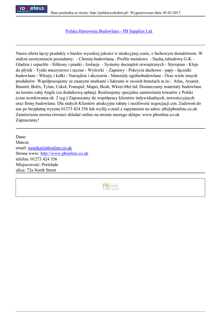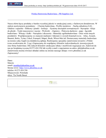 Dane pochodzą ze strony: http://polskieyorkshire.pl/. Wygenerowano dnia: 03-03-2017. Polska Hurtownia Budowlana - PB Supplies Ltd Nasza oferta łączy produkty o bardzo wysokiej jakości w atrakcyjnej cenie, z fachowym doradztwem. W stałym asortymencie posiadamy: - Chemię budowlaną - Profile metalowe - Suchą zabudowę G-K Gładzie i szpachle - Silikony i pianki - Izolacje - Systemy dociepleń zewnętrznych - Styropian - Kleje do płytek - Tynki maszynowe i ręczne - Wylewki - Zaprawy - Pokrycia dachowe - papy - łączniki budowlane - Wkręty i kołki - Narzędzia i akcesoria - Materiały ogólnobudowlane - Oraz wiele innych produktów Współpracujemy ze znanymi markami i liderami w swoich branżach m.in.: Atlas, Arsanit, Baumit, Bolix, Tytan, Cekol, Franspol, Mapei, Bosh, Wkret-Met itd. Dostarczamy materiały budowlane na terenie całej Anglii (za dodatkową opłatą). Realizujemy specjalne zamówienia towarów z Polski (czas oczekiwania ok. 2 tyg.) Zapraszamy do współpracy klientów indywidualnych, inwestycyjnych oraz firmy budowlane. Dla stałych Klientów atrakcyjne rabaty i możliwość negocjacji cen. Zadzwoń do nas po bezpłatną wycenę 01273 424 356 lub wyślij e-mail z zapytaniem na adres: [email protected] Zamówienia można również składać online na stronie naszego sklepu: www.pbonline.co.uk Zapraszamy! Dane: Marcin email: [email protected] Strona www: http://www.pbonline.co.uk telefon: 01273 424 356 Miejscowość: Portslade ulica: 72a North Street