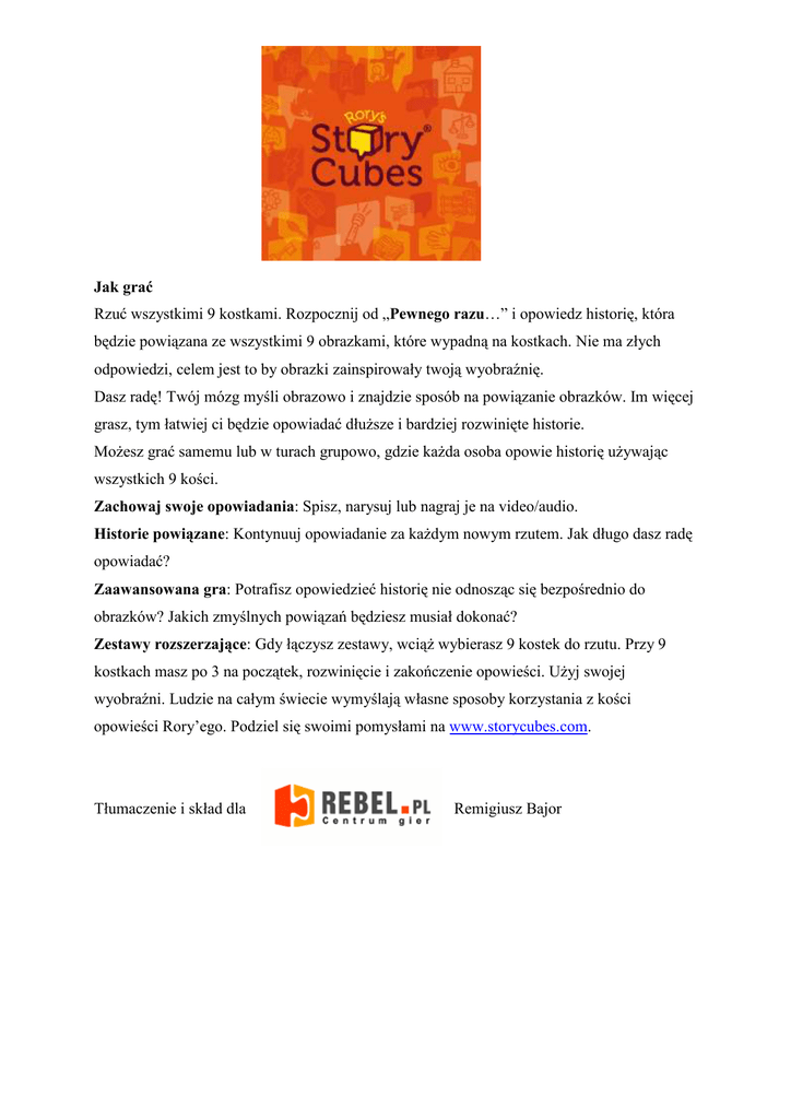 Jak grać Rzuć wszystkimi 9 kostkami. Rozpocznij od „Pewnego razu…” i opowiedz historię, która będzie powiązana ze wszystkimi 9 obrazkami, które wypadną na kostkach. Nie ma złych odpowiedzi, celem jest to by obrazki zainspirowały twoją wyobraźnię. Dasz radę! Twój mózg myśli obrazowo i znajdzie sposób na powiązanie obrazków. Im więcej grasz, tym łatwiej ci będzie opowiadać dłuższe i bardziej rozwinięte historie. Możesz grać samemu lub w turach grupowo, gdzie każda osoba opowie historię używając wszystkich 9 kości. Zachowaj swoje opowiadania: Spisz, narysuj lub nagraj je na video/audio. Historie powiązane: Kontynuuj opowiadanie za każdym nowym rzutem. Jak długo dasz radę opowiadać? Zaawansowana gra: Potrafisz opowiedzieć historię nie odnosząc się bezpośrednio do obrazków? Jakich zmyślnych powiązań będziesz musiał dokonać? Zestawy rozszerzające: Gdy łączysz zestawy, wciąż wybierasz 9 kostek do rzutu. Przy 9 kostkach masz po 3 na początek, rozwinięcie i zakończenie opowieści. Użyj swojej wyobraźni. Ludzie na całym świecie wymyślają własne sposoby korzystania z kości opowieści Rory’ego. Podziel się swoimi pomysłami na www.storycubes.com. Tłumaczenie i skład dla Remigiusz Bajor