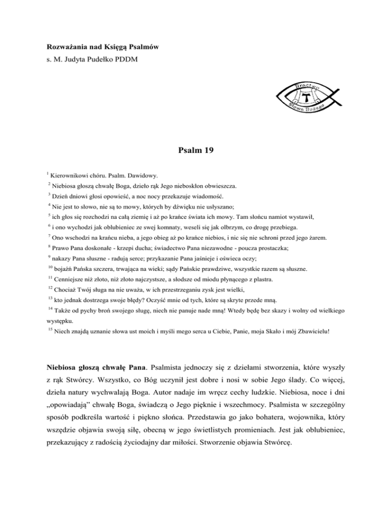 Rozważania nad Księgą Psalmów s. M. Judyta Pudełko PDDM Psalm 19 1 Kierownikowi chóru. Psalm. Dawidowy. 2 Niebiosa głoszą chwałę Boga, dzieło rąk Jego nieboskłon obwieszcza. 3 Dzień dniowi głosi opowieść, a noc nocy przekazuje wiadomość. 4 Nie jest to słowo, nie są to mowy, których by dźwięku nie usłyszano; 5 ich głos się rozchodzi na całą ziemię i aż po krańce świata ich mowy. Tam słońcu namiot wystawił, 6 i ono wychodzi jak oblubieniec ze swej komnaty, weseli się jak olbrzym, co drogę przebiega. 7 Ono wschodzi na krańcu nieba, a jego obieg aż po krańce niebios, i nic się nie schroni przed jego żarem. 8 Prawo Pana doskonałe - krzepi ducha; świadectwo Pana niezawodne - poucza prostaczka; 9 nakazy Pana słuszne - radują serce; przykazanie Pana jaśnieje i oświeca oczy; 10 bojaźń Pańska szczera, trwająca na wieki; sądy Pańskie prawdziwe, wszystkie razem są słuszne. 11 Cenniejsze niż złoto, niż złoto najczystsze, a słodsze od miodu płynącego z plastra. 12 Chociaż Twój sługa na nie uważa, w ich przestrzeganiu zysk jest wielki, 13 kto jednak dostrzega swoje błędy? Oczyść mnie od tych, które są skryte przede mną. 14 Także od pychy broń swojego sługę, niech nie panuje nade mną! Wtedy będę bez skazy i wolny od wielkiego występku. 15 Niech znajdą uznanie słowa ust moich i myśli mego serca u Ciebie, Panie, moja Skało i mój Zbawicielu! Niebiosa głoszą chwałę Pana. Psalmista jednoczy się z dziełami stworzenia, które wyszły z rąk Stwórcy. Wszystko, co Bóg uczynił jest dobre i nosi w sobie Jego ślady. Co więcej, dzieła natury wychwalają Boga. Autor nadaje im wręcz cechy ludzkie. Niebiosa, noce i dni „opowiadają” chwałę Boga, świadczą o Jego pięknie i wszechmocy. Psalmista w szczególny sposób podkreśla wartość i piękno słońca. Przedstawia go jako bohatera, wojownika, który wszędzie objawia swoją siłę, obecną w jego świetlistych promieniach. Jest jak oblubieniec, przekazujący z radością życiodajny dar miłości. Stworzenie objawia Stwórcę. Prawo Pana doskonałe. Druga część psalmu zawiera inną przestrzeń Bożej obecności. Jest nią Boże Prawo – Tora. Psalmista w równie barwny sposób o powiada o zaletach Tory, jak wcześniej mówił o dziele stworzenia. Oprócz zapewnienia co do wielkiego waloru Prawa, pojawiają się metafory, które oddają coś z tajemnicy Tory. Jest więc ona cenna jak złoto, a nawet od niego cenniejsza. Prowadzi do życia, którego nie można przecież nabyć za żadne skarby tej ziemi. Jest również słodka jak miód, a nawet tę słodycz przewyższa. Daje więc człowiekowi pełnię szczęścia, radości, nasycenie. Prawo stanowi wyznacznik, który weryfikuje człowieka. Psalmista staje przed Bogiem w pokorze serca, gdyż wie, iż nie jest proste poznanie własnego serca. Błędy mogą być ukryte. Łaska Boga obecna w Jego Prawie odsłania prawdę o człowieku. Może on powierzyć się Bogu jako swemu Stwórcy i Zbawcy. Rz 8,14–21: Albowiem wszyscy ci, których prowadzi Duch Boży, są synami Bożymi. Nie otrzymaliście przecież ducha niewoli, by się znowu pogrążyć w bojaźni, ale otrzymaliście ducha przybrania za synów, w którym możemy wołać: «Abba, Ojcze!» Sam Duch wspiera swym świadectwem naszego ducha, że jesteśmy dziećmi Bożymi. Jeżeli zaś jesteśmy dziećmi, to i dziedzicami: dziedzicami Boga, a współdziedzicami Chrystusa, skoro wspólnie z Nim cierpimy po to, by też wspólnie mieć udział w chwale. Sądzę bowiem, że cierpień teraźniejszych nie można stawiać na równi z chwałą, który ma się w nas objawić. Bo stworzenie z upragnieniem oczekuje objawienia się synów Bożych. Stworzenie bowiem zostało poddane marności – nie z własnej chęci, ale ze względu na Tego, który je poddał – w nadziei, że również i ono zostanie wyzwolone z niewoli zepsucia, by uczestniczyć w wolności i chwale dzieci Bożych. Panie Jezu Chryste, w Tobie wszystko zostało stworzone i jeszcze w bardziej przedziwny sposób dokonało się dzieło odkupienia. Udziel nam Twojego Ducha Świętego, który jest naszym najwyższym Prawem umieszczonym w głębi naszych serc. Niech On odnowi całe stworzenie, a w nas umocni udzieloną łaskę Bożego synostwa.