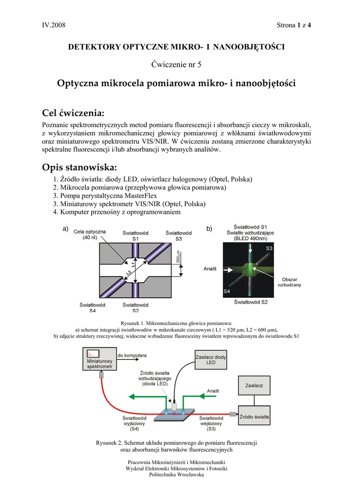 IV.2008 Strona 1 z 4 DETEKTORY OPTYCZNE MIKRO- I NANOOBJĘTOŚCI Ćwiczenie nr 5 Optyczna mikrocela pomiarowa mikro‐ i nanoobjętości Cel ćwiczenia: Poznanie spektrometrycznych metod pomiaru fluorescencji i absorbancji cieczy w mikroskali, z wykorzystaniem mikromechanicznej głowicy pomiarowej z włóknami światłowodowymi oraz miniaturowego spektrometru VIS/NIR. W ćwiczeniu zostaną zmierzone charakterystyki spektralne fluorescencji i/lub absorbancji wybranych analitów. Opis stanowiska: 1. Źródło światła: diody LED, oświetlacz halogenowy (Optel, Polska) 2. Mikrocela pomiarowa (przepływowa głowica pomiarowa) 3. Pompa perystaltyczna MasterFlex 3. Miniaturowy spektrometr VIS/NIR (Optel, Polska) 4. Komputer przenośny z oprogramowaniem Rysunek 1. Mikromechaniczna głowica pomiarowa: a) schemat integracji światłowodów w mikrokanale cieczowym ( L1 = 520 µm, L2 = 600 µm), b) zdjęcie struktury rzeczywistej, widoczne wzbudzenie fluoresceiny światłem wprowadzonym do światłowodu S1 Rysunek 2. Schemat układu pomiarowego do pomiaru fluorescencji oraz absorbancji barwników fluorescencyjnych Pracownia Mikroinżynierii i Mikromechaniki Wydział Elektroniki Mikrosystemów i Fotoniki Politechnika Wrocławska IV.2008 Strona 2 z 4 Przebieg ćwiczenia: 1. Przygotowanie stanowiska: 1. Włączyć oświetlacz halogenowy (czas rozgrzewania lampy ok. 15 min). 2. Włączyć komputer. Upewnić się, że spektrometr jest prawidłowo podłączony do złącza USB komputera. Złącze to służy zarówno do transmisji danych jak i do zasilania spektrometru. 3. Uruchomić program obsługi spektrometru (skrót na Pulpicie). 2. Pomiary charakterystyk spektralnych diod LED Cel: wstępne dobranie źródła światła wzbudzającego do pomiarów fluorescencji barwników. 1. Przepłukać układ pomiarowy wodą, a następnie zapowietrzyć. 2. Zestawić układ pomiarowy według Rys. 3. a. Wybraną diodę LED zainstalować w obudowie mikroceli pomiarowej i podłączyć do zasilacza. b. Ustawić w programie obsługi spektrometru: i. Zakładka Parametry: „Czas integracji”: 700−800 ms (dopasować). ii. Typ pomiaru: „Pojedynczy”. c. Zmierzyć i zapisać widma natężeniowe wszystkich diod LED w katalogu swojej grupy (Pulpit\Mikrosystemy analityczne\<Nazwa_grupy>). 3. Opracowanie wyników: a. Wszystkie charakterystyki widmowe natężenia światła dla poszczególnych diod LED znormalizować względem widma o największej amplitudzie i przedstawić na jednym wykresie. Rysunek 3. Schemat układu do pomiaru charakterystyki spektralnej diod LED 3. Pomiary widma transmisji wybranych barwników fluorescencyjnych Cel: zmierzenie widma transmisji barwników fluorescencyjnych oraz określenie na ich podstawie długości fali λTmin, dla której barwniki wykazują największą absorpcję światła. • • • • Analit 1: roztwór fluoresceiny Analit 2: roztwór eozyny Analit 3: roztwór ryboflawiny Rozpuszczalnik dla wszystkich barwników: woda Pracownia Mikroinżynierii i Mikromechaniki Wydział Elektroniki Mikrosystemów i Fotoniki Politechnika Wrocławska IV.2008 Strona 3 z 4 1. Zestawić układ pomiarowy według. Rys. 4. a. Podłączyć światłowód wejściowy S3 do oświetlacza halogenowego. b. Podłączyć światłowód odbiorczy S4 do spektrometru. c. Przepłukać obwód cieczowy wodą. d. W programie obsługi spektrometru ustawić: i. Zakładka Parametry: „Czas integracji”: 2−3 ms (dopasować tak, aby program nie sygnalizował przekroczenia maksymalnego poziomu światła). ii. Typ pomiaru „Pojedynczy”. Rysunek 4. Schemat układu do pomiaru widma transmitancji barwników fluorescencyjnych 2. Pomiar transmisji oraz wyznaczanie absorpcji a. Wypełnić celę pomiarową rozpuszczalnikiem. b. Przeprowadzić normalizację spektrometru. W programie obsługi spektrometru wybrać zakładkę „Normowanie. Wcisnąć „Zeruj pomiary”. Zmierzyć prąd ciemny CCD, a następnie zmierzyć widmo źródła światła (postępować według wskazówek programu). c. Wypełnić celę pomiarową badanym barwnikiem. d. Przejść do zakładki „Widmo”. Zmierzyć i zapisać widmo absorpcji barwnika. e. Przejść do zakładki „Transmisja”. Zmierzyć i zapisać widmo transmisji. f. Zanotować długość fali odcięcia dla widma transmisji (minimum transmisji). g. Powtórzyć pkt a-f dla pozostałych barwników. 3. Opracowanie wyników: a. Wszystkie charakterystyki widmowe transmisji dla poszczególnych barwników przedstawić na jednym wykresie. b. Wykonać analogiczny wykres dla widmowych charakterystyk absorpcji, uprzednio je normalizując. Pracownia Mikroinżynierii i Mikromechaniki Wydział Elektroniki Mikrosystemów i Fotoniki Politechnika Wrocławska IV.2008 Strona 4 z 4 4. Pomiary fluorescencji wybranych barwników fluorescencyjnych 1. Zestawić układ pomiarowy według Rys. 5. a. Wybraną diodę LED zainstalować w obudowie mikroceli pomiarowej. b. Ustawić w programie obsługi spektrometru: i. Zakładka Parametry: „Czas integracji”: 700−800 ms (dopasować). ii. Typ pomiaru „Pojedynczy”. Rysunek 3. Schemat układu do pomiaru fluorescencji 2. Pomiar fluorescencji: a. Przed każdym pomiarem celę pomiarową przepłukać wodą. b. Wypełnić celę badanym barwnikiem. c. Zmierzyć i zapisać widma fluorescencji poszczególnych barwników. 3. Opracowanie wyników: d. Dla każdego zapisanego widma fluorescencji: odjąć linię bazową, a następnie znormalizować przebieg. e. Określić długość fali, dla której przypada maksimum fluorescencji poszczególnych barwników. f. Przedstawić na jednym wykresie znormalizowane charakterystyki widmowe fluorescencji barwników. g. Przedstawić na jednym wykresie znormalizowane charakterystyki widmowe fluorescencji eozyny dla różnych koncentracji. h. Przepłukać układ pomiarowy wodą, a następnie zapowietrzyć. Literatura: 1. S. Bargiel i in., Nanoliter detectors for flow systems, Sensors & Actuators A, 115, 2004, 245-251 Pracownia Mikroinżynie