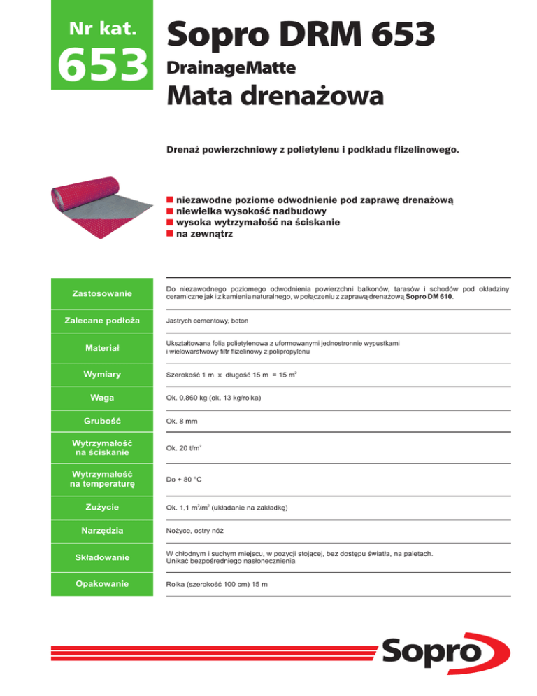 Nr kat. 653 15 17 14 66 Sopro DRM 653 DrainageMatte Mata drenażowa Drenaż powierzchniowy z polietylenu i podkładu flizelinowego. n niezawodne poziome odwodnienie pod zaprawę drenażową wysokość nadbudowy n wysoka wytrzymałość na ściskanie n na zewnątrz n niewielka Zastosowanie Zalecane podłoża Do niezawodnego poziomego odwodnienia powierzchni balkonów, tarasów i schodów pod okładziny ceramiczne jak i z kamienia naturalnego, w połączeniu z zaprawą drenażową Sopro DM 610. Jastrych cementowy, beton Materiał Ukształtowana folia polietylenowa z uformowanymi jednostronnie wypustkami i wielowarstwowy filtr flizelinowy z polipropylenu Wymiary Szerokość 1 m x długość 15 m = 15 m2 Waga Ok. 0,860 kg (ok. 13 kg/rolka) Grubość Ok. 8 mm Wytrzymałość na ściskanie Ok. 20 t/m2 Wytrzymałość na temperaturę Do + 80 °C Zużycie Narzędzia Ok. 1,1 m2/m2 (układanie na zakładkę) Nożyce, ostry nóż Składowanie W chłodnym i suchym miejscu, w pozycji stojącej, bez dostępu światła, na paletach. Unikać bezpośredniego nasłonecznienia Opakowanie Rolka (szerokość 100 cm) 15 m Właściwości Mata drenażowa Sopro DRM 653 posiada wysoką wytrzymałość na ściskanie, jest odporna na proces starzenia, powierzchnia drenażowa nie ulega butwieniu, a w połączeniu z zaprawą drenażową Sopro DM 610 tworzy system niezawodnego poziomego odwodnienia powierzchni balkonów, tarasów i schodów, pod okładzinami ceramicznymi i z kamienia naturalnego. Podłoża Zalecane są podłoża z jastrychów cementowych i betonów, z 1,5-2% minimalnym spadkiem. Podłoża muszą być nośne, trwałe, pozbawione rys i materiałów zmniejszających przyczepność (np. kurz, olej, wosk, materiały pędne, wykwity, warstwy materiałów spiekanych). Krawędzie należy odłamać, łączenia sprowadzić do lica, zaokrąglając do promienia co najmniej 4 cm. Wymagane jest wykonanie pod matą drenażową uszczelnienia np. Sopro DSF lub SoproThene®. Przy użyciu Sopro DSF należy przestrzegać następujących zasad: Powłoki uszczelniające można nanieść tylko na te elementy budowlane, które osiadając nie ulegają deformacjom. Pęknięcia w jastrychu zamknąć Sopro GH 564. W miejscach odpływów w podłogach, przy przyłączach i fugach dylatacyjnych należy wbudować uszczelki podłogowe i taśmy uszczelniające Sopro. Podłoże zwilżyć tak, aby przed nałożeniem uszczelnienia był matowo wilgotne. Uszczelnienia, zgodne z normą DIN 18195, należy wykonać odpowiednio do regulacji technicznych. Przygotowanie podłoża Matę drenażową Sopro DRM 653 rozłożyć luźno, filtrem flizelinowym do góry, na uszczelnionym podłożu. Aby osiągnąć właściwe zespolenie miedzy taśmami, niezbędne jest nałożenie taśmy z zakładem na kolejny element. Prócz tego w obszarze styku podkładu flizelinowego zerwać taśmę z dwóch pierwszych rzędów wypustów i założyć na wypusty następnej taśmy oraz mocno przycisnąć. Oderwana część filtru flizelinowego układana jest na założonej i silnie dociśniętej taśmie. Wskazówka: Należy zwrócić uwagę na takie wykonanie niezbędnego zakładu, aby główny odpływ wody nie prowadził pod matę. Zaprawę drenażową Sopro DM 610 ułożyć bezpośrednio na matach drenażowych Sopro DRM 653. Warstwa zaprawy powinna mieć grubość co najmniej 5 cm. Jako podkład sczepny między zaprawą drenażową a ceramiczną lub kamienną okładziną można zastosować Sopro MAS 418, Sopro HSF 748 lub najbardziej właściwie zaprawę cienkowarstwową Sopro. Podkład należy rozmieszać do odpowiedniej konsystencji i nanieść na obrabianą powierzchnię, tak aby nie zanieczyścić spoin i zapewnić dobre odwodnienie. Należy wykonać dylatacje w zaprawie i przenieść je do górnej powierzchni okładziny. Wielkość obszaru powinna być możliwie zbliżona do kwadratu i podzielona na części, maksymalnie 4x4 m. Do fugowania okładzin zalecane są zaprawy o właściwościach drenażowych Sopro PF lub Sopro EPF. Jeśli nie jest wymagana zaprawa fugowa o właściwościach drenażowych, może do wyboru również użyć cementowej, np. Sopro TNF Sposób użycia Oznakowanie opakowania: Wskazówki BHP Znak: nie jest wymagany Składniki niebezpieczne: brak Zwroty zagrożenia: brak Dane zawarte w niniejszej ulotce stanowią opis produktu. Są to ogólne wskazówki oparte na naszych doświadczeniach i badaniach i nie odnoszą się do konkretnych zastosowań. Dążąc do ciągłego rozwoju i ulepszania produktów, zastrzegamy sobie prawo do zmiany parametrów bez uprzedniego informowania. Prezentowane dane nie mogą stanowić podstawy do jakichkolwiek roszczeń. W razie potrzeby prosimy zwrócić się do Działu Doradztwa Technicznego Sopro Polska. Aktualna wersja karty technicznej produktu znajduje się na www.sopro.pl. Sopro Polska Sp. z o.o. Centrala ul. Poleczki 23/F 02-822 Warszawa tel. 0/22 335 23 00 fax 0/22 335 23 09 Sprzedaż Północ i Centrum ul. Poleczki 21/E 02-822 Warszawa tel. 0/22 335 23 22 fax 0/22 335 23 23 www.sopro.pl Sprzedaż Południe ul. Mogilska 40 31-546 Kraków tel. 0/12 410 58 50 fax 0/12 411 08 04 Doradztwo Techniczne Warszawa tel. 0 606 14 58 11 Gliwice tel. 0 602 28 10 40 Poznań tel. 0 604 27 49 60 Sitkówka/Nowiny tel. 0 602 44 44 91 04.2008/PL Zwroty bezpieczeństwa (zwroty S): S 2 chronić przed dziećmi