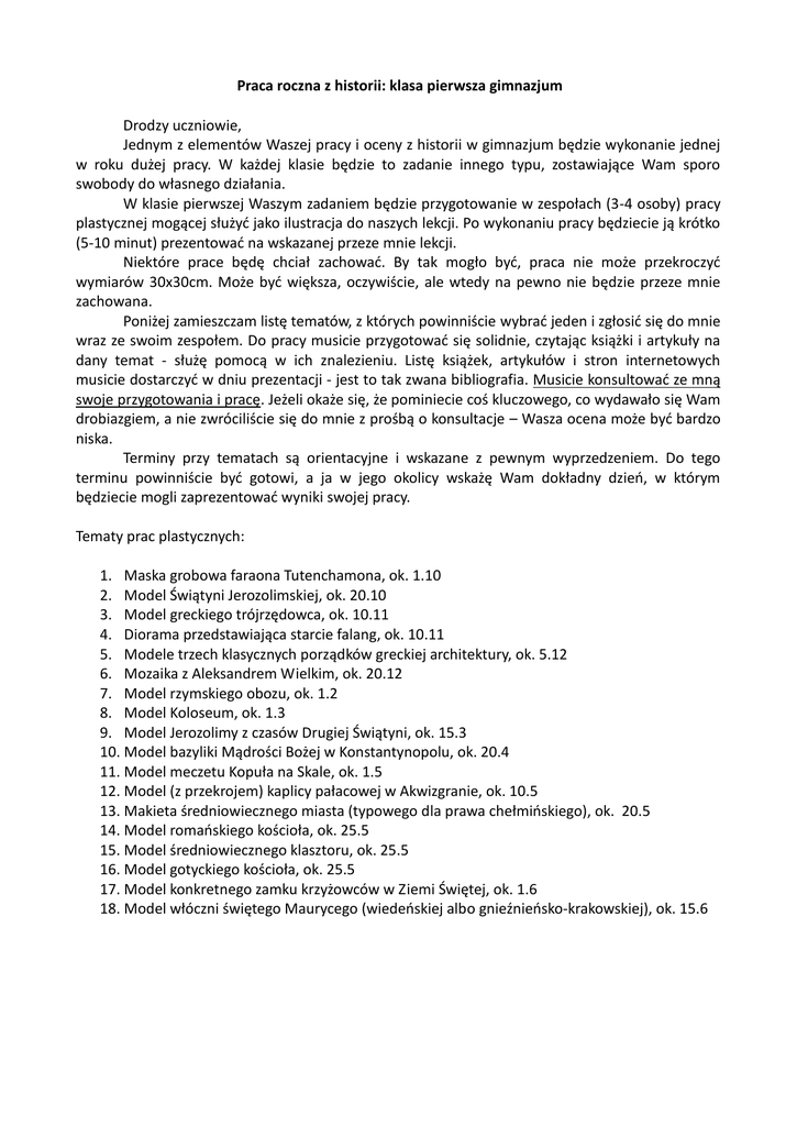 Praca roczna z historii: klasa pierwsza gimnazjum Drodzy uczniowie, Jednym z elementów Waszej pracy i oceny z historii w gimnazjum będzie wykonanie jednej w roku dużej pracy. W każdej klasie będzie to zadanie innego typu, zostawiające Wam sporo swobody do własnego działania. W klasie pierwszej Waszym zadaniem będzie przygotowanie w zespołach (3-4 osoby) pracy plastycznej mogącej służyć jako ilustracja do naszych lekcji. Po wykonaniu pracy będziecie ją krótko (5-10 minut) prezentować na wskazanej przeze mnie lekcji. Niektóre prace będę chciał zachować. By tak mogło być, praca nie może przekroczyć wymiarów 30x30cm. Może być większa, oczywiście, ale wtedy na pewno nie będzie przeze mnie zachowana. Poniżej zamieszczam listę tematów, z których powinniście wybrać jeden i zgłosić się do mnie wraz ze swoim zespołem. Do pracy musicie przygotować się solidnie, czytając książki i artykuły na dany temat - służę pomocą w ich znalezieniu. Listę książek, artykułów i stron internetowych musicie dostarczyć w dniu prezentacji - jest to tak zwana bibliografia. Musicie konsultować ze mną swoje przygotowania i pracę. Jeżeli okaże się, że pominiecie coś kluczowego, co wydawało się Wam drobiazgiem, a nie zwróciliście się do mnie z prośbą o konsultacje – Wasza ocena może być bardzo niska. Terminy przy tematach są orientacyjne i wskazane z pewnym wyprzedzeniem. Do tego terminu powinniście być gotowi, a ja w jego okolicy wskażę Wam dokładny dzień, w którym będziecie mogli zaprezentować wyniki swojej pracy. Tematy prac plastycznych: 1. Maska grobowa faraona Tutenchamona, ok. 1.10 2. Model Świątyni Jerozolimskiej, ok. 20.10 3. Model greckiego trójrzędowca, ok. 10.11 4. Diorama przedstawiająca starcie falang, ok. 10.11 5. Modele trzech klasycznych porządków greckiej architektury, ok. 5.12 6. Mozaika z Aleksandrem Wielkim, ok. 20.12 7. Model rzymskiego obozu, ok. 1.2 8. Model Koloseum, ok. 1.3 9. Model Jerozolimy z czasów Drugiej Świątyni, ok. 15.3 10. Model bazyliki Mądrości Bożej w Konstantynopolu, ok. 20.4 11. Model meczetu Kopuła na Skale, ok. 1.5 12. Model (z przekrojem) kaplicy pałacowej w Akwizgranie, ok. 10.5 13. Makieta średniowiecznego miasta (typowego dla prawa chełmińskiego), ok. 20.5 14. Model romańskiego kościoła, ok. 25.5 15. Model średniowiecznego klasztoru, ok. 25.5 16. Model gotyckiego kościoła, ok. 25.5 17. Model konkretnego zamku krzyżowców w Ziemi Świętej, ok. 1.6 18. Model włóczni świętego Maurycego (wiedeńskiej albo gnieźnieńsko-krakowskiej), ok. 15.6