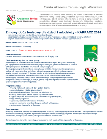 Oferta Akademii Tenisa Legia Warszawa www.asir.waw.pl ___ www.tenislegia.pl _________________________________________________________________ Zapraszamy na zimowy obóz tenisowy dla dzieci i młodzieży w ośrodku tenisowym Family Tennis Camp, położonym u podnóża Karkonoszy, ok. 2 km od Karpacza. Obiekt powstał kilka lat temu z myślą o zgrupowaniach dla zawodników, obozach oraz turniejach tenisowych. Malownicze położenie kortów sprzyja efektywnemu treningowi, a wiele kilometrów ścieżek po górskim terenie daje możliwość optymalnego treningu kondycyjnego. _________________________________________________________________________________________ Zimowy obóz tenisowy dla dzieci i młodzieży - KARPACZ 2014 - z elementami treningu narciarskiego i snowboardowego - przeznaczony dla zawodników klubów tenisowych oraz niezrzeszone dzieci i młodzież w wieku szkolnym - program obozu realizowany jest przez kadrę szkoleniową Akademii Tenisa Legia Warszawa termin obozu: 21.02.2014 – 02.03.2014 dojazd: autokarem z Warszawy cena: 3290 zł / 2990 zł - oferta first minute do 30.11.2013 / Zakwaterowanie: Ośrodek tenisowy Family Tennis Camp w Karpaczu, Ściegny 119. Obóz podzielony jest na dwie grupy: Pierwsza grupa, to zaawansowani zawodnicy klubów tenisowych. Program szkoleniowy, jaki będą realizować ma charakter intensywnych treningów, przeprowadzanych w ramach cyklu przygotowań do startów w turniejach klasyfikacyjnych. Do drugiej grupy przydzieleni będą początkujący tenisiści, którzy w swoich podgrupach wiekowych zapoznają się z technikami uderzeń, począwszy od tych podstawowych serwis, forhand, beckhand. W dalszym etapie, w zależności od stopnia zaawansowania i oczekiwań uczestników, szkolenie poszerzane będzie o bardziej skomplikowane elementy gry, podstawy taktyki i teorii tenisa ziemnego. Program przewiduje również rozegranie turnieju tenisowego, w którym, grając na punkty z przeciwnikiem, będzie można sprawdzić poziom swoich umiejętności. Program obozu: • • • • • • • • • treningi na kortach ziemnych do 4 godzin dziennie sparingi obozowe między zawodnikami wyjazdy indywidualne do Czech na turnieje i sparingi treningi kondycyjne, siłowe, zajęcia ogólnorozwojowe zajęcia taktyczne ukierunkowujące zawodnika na grę turniejową rajdy piesze po górach ognisko z pieczeniem kiełbasek, dyskoteki program narciarsko–snowboardowy na stokach w Karpaczu, wycieczka do Aquaparku w Karpaczu Cena zawiera: przejazdy autokarem, nocleg, wyżywienie (3 posiłki dziennie), realizację programu szkoleniowo - treningowego na kortach tenisowych, realizację programu ogólnorozwojowego w terenie, realizację programu rekreacyjno-wypoczynkowego, całodobową opiekę wychowawców, ubezpieczenie NNW, podatek VAT. Cena nie zawiera karnetów na wyciągi, wypożyczenia nart, wycieczki do Aquaparku w Karpaczu. _____________________________________________________________________________ rezerwacja, kontakt z organizatorem: e-mail: [email protected] tel. kom. 513-460-460, 513-470-470, _________________________________________________________________ www.tenislegia.pl ___ www.asir.waw.pl