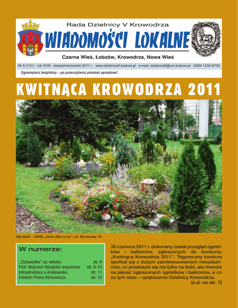 Nr 5 (131) rok XVIII sierpień/wrzesień 2011 r. www.dzielnica5.krakow.pl e-mail: [email protected] ISSN 1234-9739 KWITNĄCA KROWODRZA 2011 Ogródek – MDK „Dom Harcerza”, ul. Reymonta 18 W numerze: „Dziewiątka” po włosku Prof. Wojciech Narębski wspomina Infrastruktura a środowisko Felieton Piotra Klimowicza str. 6 str. 8-10 str. 11 str. 12 30 czerwca 2011 r. dokonany został przegląd ogródków i balkonów, zgłoszonych do konkursu „Kwitnąca Krowodrza 2011”. Tegoroczny konkurs spotkał się z dużym zainteresowaniem mieszkańców, co przełożyło się nie tylko na ilość, ale również na jakość zgłoszonych ogródków i balkonów, a co za tym idzie – upiększenie Dzielnicy Krowodrza. (c.d. na str. 7) Z prac Rady i Zarządu 21 czerwca br. odbyła się VI sesja Rady Dzielnicy V Krowodrza. Zawnioskowano do realizacji zadania priorytetowe przyjęte uchwałami: Rady Dzielnicy V Krowodrza z: 6 lipca 2010 r., 31 sierpnia 2010 r., 19 kwietnia 2011 r. oraz 17 maja 2011 r.: 1. Zadania interwencyjne i remontowe związane z bezpieczeństwem ruchu drogowego wg wskazań Dzielnicy (kwota – 20 000 zł, realizator – ZIKiT) 2. Remonty chodników wg wskazań Dzielnicy (kwota – 98 400 zł, realizator – ZIKiT) 3. Doposażenie ogródków jordanowskich, założenie rabat kwiatowych i zieleńców wraz z ogrodzeniem wg wskazań Dzielnicy (kwota – 16 000 zł, realizator – ZIKiT) 4. Szkoła Podstawowa nr 34 – zakup dodatkowego wyposażenia boiska sportowego ORLIK 2012 (kwota 1500 zł, realizator: ZEO) 5. Szczepienie przeciwko grypie dla mieszkańców Dzielnicy V Krowodrza (kwota – 3000 zł, realizator – Biuro ds. Ochrony Zdrowia) 6. Badanie PSA dla mężczyzn z terenu Dzielnicy V Krowodrza (kwota – 1 300 zł, realizator: Biuro ds. Ochrony Zdrowia) 7. Zakup czujnika tlenku węgla dla zespołów ratownictwa medycznego Krakowskiego Pogotowia Ratunkowego z ul. Łazarza 14 w Krakowie (kwota – 700 zł, realizator: Biuro ds. Ochrony Zdrowia) 8. ZSOI nr 1 – zakup nagród i organizacja Krowoderskich Dni Sportu (kwota: 10 000 zł, realizator: ZEO) 9. Zakup nagród na konkurs sportowy pn. „Bądź bezpieczny” (kwota: 600 zł, realizator: MDK „Dom Harcerza”) 2 10. Gimnazjum nr 16 – dofinansowanie projektu pn. „Mocni bez przemocy” (kwota: 2400 zł, realizator: MDK „Dom Harcerza”) Zmniejszono kwotę na zadaniach (Uchwała Rady Dzielnicy V Krowodrza z 19 kwietnia 2011 r.): pn. „Remonty chodników wg wskazań Dzielnicy” z 115 500 zł na kwotę – 32 600 zł, realizator – ZIKiT oraz pn. „Montaż i naprawa ogrodzeń, remont wejść do schronów, montaż słupków zabezpieczających przed nieprawidłowym parkowaniem wg wskazań Dzielnicy” z 50 000 zł na kwotę – 25 000 zł, realizator – ZIKiT. Rozdzielono środki finansowe w wysokości 446 000 złotych na niżej podane zadania: 1. Konkurs „Kwitnąca Krowodrza” - MDK „Dom Harcerza” – 4 000 zł 2. Akcja pn. „Sprzątaj po swoim psie” – MDK „Dom Harcerza” – 4 000 zł 3. Doposażenie ogródków jordanowskich, założenie rabat kwiatowych i zieleńców wraz z ogrodzeniem wg wskazań Dzielnicy – ZIKiT – 12 000 zł 4. Piknik Krowoderski – MDK „Dom Harcerza” – 18 000 zł 5. Krowoderska Biblioteka Publiczna – zakup książek – Krowoderska Biblioteka Publiczna – 3 000 zł 6. Konkurs fotograficzny – MDK „Dom Harcerza” – 3 000 zł 7. Dofinansowanie wystawy fotograficznej Muzeum Historii Fotografii – 3 000 zł 8. Klub Kultury „Paleta” – Akcja Lato warsztaty twórcze oraz wycieczki dla dzieci pozostających w mieście w okresie wakacji – Centrum Kultury „Dworek Białoprądnicki” – 2 000 zł 9. Oddział „Celestat” – opracowaRada Dzielnicy V Krowodrza nie biografii słynnych Krowodrza Muzeum Historyczne Miasta Krakowa – 1 000 zł 10. „Komunikacja z mieszkańcami” – prowadzenie strony internetowej – Biuro Rady – 4 500 zł 11. „Komunikacja z mieszkańcami” – redakcja gazetki – BR – 11 000 zł 12. „Komunikacja z mieszkańcami” – druk gazetki – BR – 29 100 zł 13. Zakup i dostosowanie szafek w szatni komisariatu Straży Miejskiej Oddział II Krowodrza w Krakowie – Straż Miejska – 12 000 zł 14. Komisariat IV Policji w Krakowie – zakup sprzętu informatycznego wraz z materiałami eksploatacyjnymi, materiałów eksploatacyjnych dla informatyki oraz materiałów biurowych – OC – 10 000 zł 15. MDK „Dom Harcerza” – dofinansowanie zadań poprawiających bezpieczeństwo na terenie MDK – „Dom Harcerza” – MDK „Dom Harcerza” – 8 000 zł 16. Remont chodników wg wskazań Dzielnicy – ZIKiT – 148 400 zł 17. Pomoc społeczna dla mieszkańców – zakup podręczników i przyborów szkolnych – MOPS Filia nr 7 – 6 000 zł 18. Pomoc społeczna dla mieszkańców – zakup opału – MOPS Filia nr 7 – 12 000 zł 19. Pomoc społeczna dla mieszkańców – zakup biletów do kina i teatru w ramach projektu socjalnego „Z kulturą na ty” – MOPS Filia nr 7 – 3 000 zł 20. Pomoc społeczna dla mieszkańców – wycieczka dla dzieci – MOPS Filia nr 7 – 7 000 zł 21. Pomoc społeczna dla mieszkańców – impreza integracyjna „Pożegnanie lata” –MOPS Filia nr 7 – 1 500 zł 22. Pomoc społeczna dla mieszkańców – zakup żywności do realizacji projektu socjalnego „Z kulturą na Ty” – MOPS Filia nr 7 – 500 zł 23. Badania profilaktyczne – program profilaktyki tarczycy – Biuro ds. Ochrony Zdrowia – 5 000 zł 24. Badania profilaktyczne raka stercza (PSA) – program profilaktyki – Biuro ds. Ochrony Zdrowia – 3 000 zł 25. Szczepienia profilaktyczne – program szczepień przeciw grypie – Biuro ds. Ochrony Zdrowia – 12 000 zł 26. Szczepienia profilaktyczne – program szczepień przeciw żółtaczce – Biuro ds. Ochrony Zdrowia – 7 000 zł 27. Żłobek nr 14 – doposażenie ogrodu w zabawki i urządzenia ogrodowe – Żłobek nr 14 – 12 000 zł 28. Dzień Senio