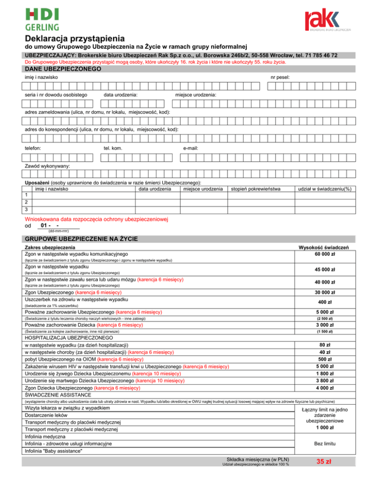 Deklaracja przystąpienia do umowy Grupowego Ubezpieczenia na Życie w ramach grupy nieformalnej UBEZPIECZAJĄCY: Brokerskie biuro Ubezpieczeń Rak Sp.z o.o., ul. Borowska 246b/2, 50-558 Wrocław, tel. 71 785 46 72 Do Grupowego Ubezpieczenia przystąpić mogą osoby, które ukończyły 16. rok życia i które nie ukończyły 55. roku życia. DANE UBEZPIECZONEGO imię i nazwisko seria i nr dowodu osobistego nr pesel: data urodzenia: miejsce urodzenia: adres zameldowania (ulica, nr domu, nr lokalu, miejscowość, kod): adres do korespondencji (ulica, nr domu, nr lokalu, miejscowość, kod): telefon: tel. kom. e-mail: Zawód wykonywany: Uposażeni (osoby uprawnione do świadczenia w razie śmierci Ubezpieczonego): imię i nazwisko data urodzenia miejsce urodzenia 1 2 3 stopień pokrewieństwa udział w świadczeniu(%) Wnioskowana data rozpoczęcia ochrony ubezpieczeniowej 01 - od (dd-mm-rrrr) GRUPOWE UBEZPIECZENIE NA ŻYCIE Wysokość świadczeń 60 000 zł Zakres ubezpieczenia Zgon w następstwie wypadku komunikacyjnego (łącznie ze świadczeniem z tytułu zgonu Ubezpieczonego i zgonu w następstwie wypadku) Zgon w następstwie wypadku 45 000 zł (łącznie ze świadczeniem z tytułu zgonu Ubezpieczonego) Zgon w następstwie zawału serca lub udaru mózgu (karencja 6 miesięcy) 40 000 zł (łącznie ze świadczeniem z tytułu zgonu Ubezpieczonego) 30 000 zł Zgon Ubezpieczonego (karencja 6 miesięcy) Uszczerbek na zdrowiu w następstwie wypadku 400 zł (świadczenie za 1% uszczerbku) 5 000 zł Poważne zachorowanie Ubezpieczonego (karencja 6 miesięcy) (Świadczenie z tytułu leczenia choroby naczyń wieńcowych - inne zabiegi) (2 500 zł) Poważne zachorowanie Dziecka (karencja 6 miesięcy) 3 000 zł (Świadczenie za kolejne zachorowanie, inne niż pierwsze) (1 500 zł) HOSPITALIZACJA UBEZPIECZONEGO w następstwie wypadku (za dzień hospitalizacji) w następstwie choroby (za dzień hospitalizacji) (karencja 6 miesięcy) pobyt Ubezpieczonego na OIOM (karencja 6 miesięcy) Zakażenie wirusem HIV w następstwie transfuzji krwi u Ubezpieczonego (karencja 6 miesięcy) Urodzenie się żywego Dziecka Ubezpieczonemu (karencja 10 miesięcy) Urodzenie się martwego Dziecka Ubezpieczonego (karencja 10 miesięcy) Zgon Dziecka Ubezpieczonego (karencja 6 miesięcy) ŚWIADCZENIE ASSISTANCE 80 zł 40 zł 500 zł 5 000 zł 1 800 zł 3 800 zł 4 000 zł (wystąpienie choroby albo uszkodzenia ciała lub utraty zdrowia w nast. Wypadku lub/albo określonej w OWU nagłej trudnej sytuacji losowej mającej wpływ na zdrowie fizyczne lub psychiczne) Wizyta lekarza w związku z wypadkiem Dostarczenie leków Transport medyczny do placówki medycznej Transport medyczny z placówki medycznej Infolinia medyczna Infolinia - zdrowotne usługi informacyjne Infolinia "Baby assistance" Łączny limit na jedno zdarzenie ubezpieczeniowe 1 000 zł Bez limitu Składka miesięczna (w PLN) Udział ubezpieczonego w składce 100 % 35 zł INFORMACJE O STANIE ZDROWIA Odpowiedź na „tak” oznacza odmowę ubezpieczenia (nie dotyczy odpowiedzi na pytanie, co do posiadania ubezpieczenia – pkt 5). PYTANIA: 1. Czy w przeszłości chorował/a Pan/i lub choruje obecnie na choroby wymienione poniżej: a) zawał mięśnia sercowego, choroba wieńcowa, arytmia, nadciśnienie, przewlekłe choroby układu krążenia, wady serca; Tak □ Nie □ b) stany zapalne nerek, kamica nerek, przewlekłe choroby nerek; Tak □ Nie □ c) astma, chroniczny bronchit, gruźlica, przewlekłe choroby układu oddechowego; Tak □ Nie □ d) cukrzyca, choroby tarczycy; Tak □ Nie □ e) zapalenie trzustki, jelit, przewlekłe choroby układu pokarmowego; Tak □ Nie □ f) nowotwory, guzy, chłoniaki, białaczka; Tak □ Nie □ g) udar, porażenie; Tak □ Nie □ h) padaczka, uzależnienie (od alkoholu, narkotyków, leków), zaburzenia nerwicowe, zaburzenia psychiczne, choroby psychiczne, inne przewlekłe choroby układu nerwowego; Tak □ Nie □ i) wirusowe zapalenie wątroby typu B, wirusowe zapalenie wątroby typu C, przewlekłe choroby wątroby, bolerioza, AIDS, zakażenie wirusem HIV; Tak □ Nie □ 2. Czy ubiegał się Pan/i lub otrzymywał rentę lub Pana/i zdolność do pracy w pełnym wymiarze jest ograniczona? Tak □ Nie □ 3. Czy w przeszłości palił(a) Pan(i) lub pali obecnie powyżej 50 sztuk papierosów dziennie? Tak □ Nie □ 4. Czy wykonuje Pan/i którykolwiek z poniżej wymienionych zawodów o wysokim stopniu ryzyka: bokser; sportowiec zawodowy; cyrkowiec; dżokej; kaskader; ochroniarz; policjant; detektyw; strażak; wojskowy; dziennikarz B korespondent; nurek; marynarz; pilot; kominiarz; monter (z wyłączeniem montera mebli, sprzętu AGD, RTV – prace naziemne); kierowca samochodu ciężarowego o masie dopuszczalnej całkowitej powyżej 3500 kg; elektryk; górnik; hutnik; rybak; drwal; dekarz; spawacz; cieśla; murarz; tynkarz; operator ciężkiego sprzętu; pracownik budowlany (z wyłączeniem personelu nadzoru, inspektora budowlanego, glazurnika, malarza pokojowego, hydraulika); pracownik pracujący: na wysokościach powyżej 1 m od stałej powierzchni, przy budowie rusztowań, przy materiałach chemicznych, przy azbeście, przy żwirze, przy paliwach, w kamieniołomie, przy materiałach wybuchowych? Tak □ Nie □ 5. Czy posiada Pan/i w naszym Towarzystwie inne polisy ubezpieczeniowe na życie? Jeśli tak, prosimy o podanie numeru polisy lub certyfikatu Tak □ Nie □ Ochrona ubezpieczeniowa w stosunku do Ubezpieczonego, miedzy innymi, wygasa z ostatnim dniem okresu, za który została zapłacona składka, nie później jednak niż z ostatnim dniem miesiąca, w którym dany Ubezpieczony ukończył 65 (sześćdziesiąt pięć) lat. Ja niżej podpisany/a oświadczam, że: Wyrażam zgodę na zawarcie przez Ubezpieczającego z HDI- Gerling Życie Towarzystwem Ubezpieczeń SA umowy grupowego ubezpieczenia na życie związanego z ubezpieczeniowym funduszem kapitałowym na mój rachunek oraz wyrażam chęć przystąpienia do w/w 