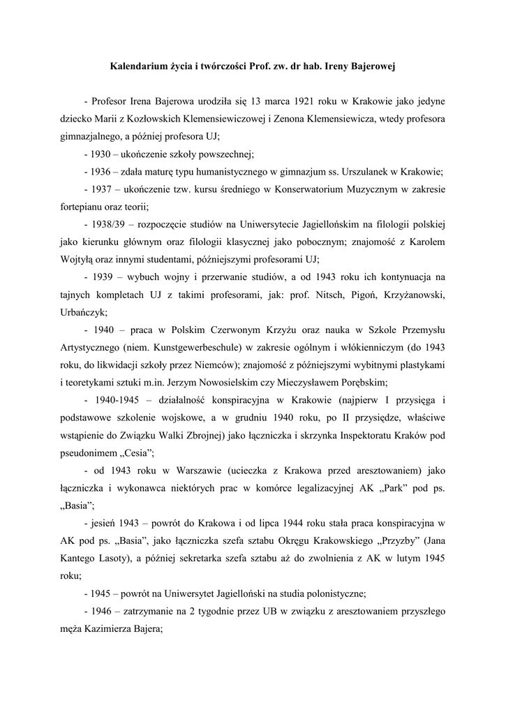 Kalendarium życia i twórczości Prof. zw. dr hab. Ireny Bajerowej - Profesor Irena Bajerowa urodziła się 13 marca 1921 roku w Krakowie jako jedyne dziecko Marii z Kozłowskich Klemensiewiczowej i Zenona Klemensiewicza, wtedy profesora gimnazjalnego, a później profesora UJ; - 1930 – ukończenie szkoły powszechnej; - 1936 – zdała maturę typu humanistycznego w gimnazjum ss. Urszulanek w Krakowie; - 1937 – ukończenie tzw. kursu średniego w Konserwatorium Muzycznym w zakresie fortepianu oraz teorii; - 1938/39 – rozpoczęcie studiów na Uniwersytecie Jagiellońskim na filologii polskiej jako kierunku głównym oraz filologii klasycznej jako pobocznym; znajomość z Karolem Wojtyłą oraz innymi studentami, późniejszymi profesorami UJ; - 1939 – wybuch wojny i przerwanie studiów, a od 1943 roku ich kontynuacja na tajnych kompletach UJ z takimi profesorami, jak: prof. Nitsch, Pigoń, Krzyżanowski, Urbańczyk; - 1940 – praca w Polskim Czerwonym Krzyżu oraz nauka w Szkole Przemysłu Artystycznego (niem. Kunstgewerbeschule) w zakresie ogólnym i włókienniczym (do 1943 roku, do likwidacji szkoły przez Niemców); znajomość z późniejszymi wybitnymi plastykami i teoretykami sztuki m.in. Jerzym Nowosielskim czy Mieczysławem Porębskim; - 1940-1945 – działalność konspiracyjna w Krakowie (najpierw I przysięga i podstawowe szkolenie wojskowe, a w grudniu 1940 roku, po II przysiędze, właściwe wstąpienie do Związku Walki Zbrojnej) jako łączniczka i skrzynka Inspektoratu Kraków pod pseudonimem „Cesia”; - od 1943 roku w Warszawie (ucieczka z Krakowa przed aresztowaniem) jako łączniczka i wykonawca niektórych prac w komórce legalizacyjnej AK „Park” pod ps. „Basia”; - jesień 1943 – powrót do Krakowa i od lipca 1944 roku stała praca konspiracyjna w AK pod ps. „Basia”, jako łączniczka szefa sztabu Okręgu Krakowskiego „Przyzby” (Jana Kantego Lasoty), a później sekretarka szefa sztabu aż do zwolnienia z AK w lutym 1945 roku; - 1945 – powrót na Uniwersytet Jagielloński na studia polonistyczne; - 1946 – zatrzymanie na 2 tygodnie przez UB w związku z aresztowaniem przyszłego męża Kazimierza Bajera; - 1948 – uzyskanie magisterium po obronie pracy z zakresu językoznawstwa pt. „Wyrazy złożone nowszej polszczyzny kulturalnej”; - 1949-1953 – praca dodatkowa w oddziale krakowskim Instytutu Badań Literackich; - 1951 – obrona pracy doktorskiej „Oboczność e do zera w przyimkach i przedrostkach w języku polskim” (promotor prof. Kazimierz Nitsch); - 1952 – małżeństwo z Kazimierzem Bajerem, poznanym podczas pracy w konspiracji w AK w Krakowie, dwukrotnie aresztowanym po wojnie przez UB i skazanym na 5 lat więzienia, dziś inżynierem na emeryturze; - narodziny dzieci: 1953 – syn Jerzy (później inżynier), 1958 córka Renata (później filolog-iberysta w Instytucie Filologii Romańskiej UJ); - 1945-1946, 1950-1955 – praca na Uniwersytecie Jagiellońskim: młodszy asystent w Studium Słowiańskim, starszy asystent, adiunkt przy Katedrze Filologii Słowiańskiej na Wydziale Filozoficznym; - od 1 IX 1955 praca w Wyższej Szkole Pedagogicznej w Katowicach jako zastępca profesora przy Katedrze Języka Polskiego; - 1963 – habilitacja na Uniwersytecie Wrocławskim na podstawie pracy „Kształtowanie się systemu języka polskiego w XVIII wieku”; - 1964 – ukazała się książka „Kształtowanie się systemu polskiego języka literackiego w XVIII wieku”; - 1964 – uzyskanie docentury i objęcie kierownictwa Katedry Języka Polskiego, a po reorganizacji Katedry Historii Języka Polskiego do 1987 roku; - 1969-1972 – praca na stanowisku zastępcy dyrektora Instytutu Filologii Polskiej Uniwersytetu Śląskiego; - 1969 – śmierć ojca w katastrofie lotniczej pod Zawoją; - od 1970 – wygłaszanie licznych prelekcji z zakresu kultury języka w miejscach związanych z Kościołem; m.in. w ramach Tygodni Kultury Chrześcijańskiej; - 1972-1979 – zaangażowanie w prace Synodu Diecezjalnego; - 1974 – uzyskanie tytułu profesora nadzwyczajnego; - 1980 – przystąpienie do komitetu założycielskiego NSZZ „Solidarność” na Wydziale Filologicznym UŚ; - 1980 – ukazała się książka „Wpływ techniki na ewolucję języka polskiego”; - 1980-1986 – udział w pracach Komitetu Terminologii PAN; - 1981 – objęcie funkcji prorektora Uniwersytetu Śląskiego do spraw dydaktycznych; - 12 XII - 18 XII 1981 – internowanie i zwolnienie z funkcji prorektora; - 1983-1987 – prowadzenie zajęć z kultury języka polskiego na Wydziale Teologicznym XX. Misjonarzy w Krakowie; - 1986-1990 – praca w Zespole Koordynacyjnym Resortowego Programu Badań Podstawowych; - 1986 – ukazała się książka „Polski język ogólny XIX wieku: stan i ewolucja. T. 1: Ortografia, fonologia z fonetyką, morfonologia.”; - 1988-1992 – przewodnicząca Rady Naukowej Instytutu Języka Polskiego PAN; - 1989 – uzyskanie tytułu profesora zwyczajnego; - 1990-1992 – praca w Zespole Ekspertów Ministerstwa Edukacji Narodowej; - 1991 – przejście na emeryturę; - 1991-1994 – praca w Radzie Głównej Szkolnictwa Wyższego, Centralnej Komisji ds. Stopni i Tytułów oraz Komitecie Badań Naukowych; - 1992-1994 – zajęcia z kultury języka w Duchownym Seminarium w Krakowie; - 1992 - ukazała się książka „Polski język ogólny XIX wieku: stan i ewolucja. T. 2: Fleksja”; - 1993-1995 – praca w Komitecie Historii Nauki i Techniki PAN; - 1996 – redakcja i autorstwo wybranych rozdziałów opublikowanej książki „Język polski czasu drugiej wojny światowej (1939-1945); - 1997 - 2002 – praca w Wyższej Szkole Języków Obcych i Ekonomii (później Akademii Polonijnej) w Częstochowie na stanowisku profesora; - ukazała się książka „Polski język ogólny XIX wieku: stan i ewolucja. T. 3: Składnia. Synteza”; - 2003 – opublikowanie książki „Zarys historii języka polskiego 1939-2000”; Przynależno