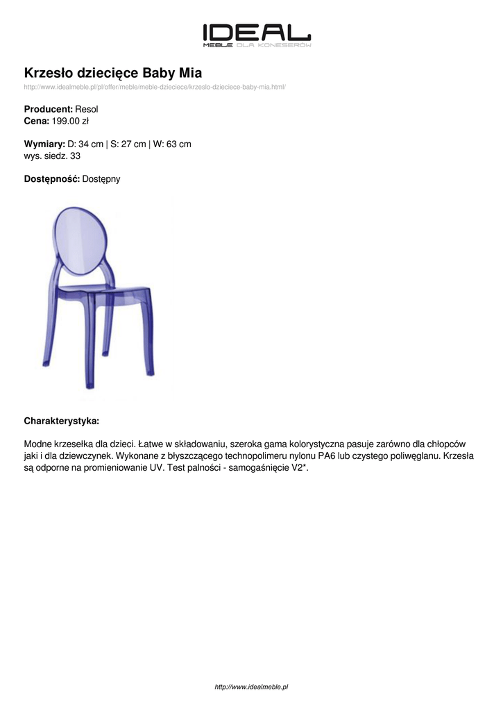Krzesło dziecięce Baby Mia http://www.idealmeble.pl/pl/offer/meble/meble-dzieciece/krzeslo-dzieciece-baby-mia.html/ Producent: Resol Cena: 199.00 zł Wymiary: D: 34 cm | S: 27 cm | W: 63 cm wys. siedz. 33 Dostępność: Dostępny Charakterystyka: Modne krzesełka dla dzieci. Łatwe w składowaniu, szeroka gama kolorystyczna pasuje zarówno dla chłopców jaki i dla dziewczynek. Wykonane z błyszczącego technopolimeru nylonu PA6 lub czystego poliwęglanu. Krzesła są odporne na promieniowanie UV. Test palności - samogaśnięcie V2*. http://www.idealmeble.pl Dostępne wersje produktu: nazwa produktu Krzesło dziecięce Baby Mia warianty kolor fioletowy transparentny cena 199.00zł dostępne Na zamówienie Krzesło dziecięce Baby Mia kolor biały 199.00zł Dostępny Krzesło dziecięce Baby Mia kolor niebieski transparentny 199.00zł 4-6 tygodni Krzesło dziecięce Baby Mia kolor różowy transparentny 199.00zł 4-6 tygodni Krzesło dziecięce Baby Mia kolor transparentny 199.00zł Dostępny http://www.idealmeble.pl Zdjęcia produktu: http://www.idealmeble.pl Powered by TCPDF (www.tcpdf.org)