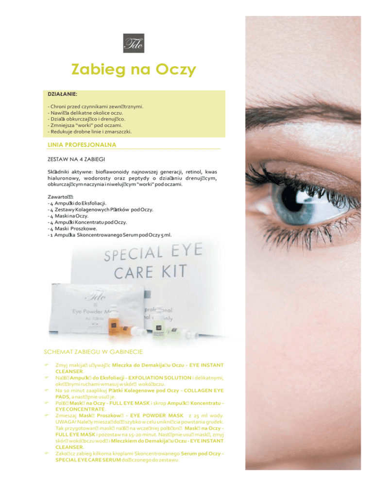 Zabieg na Oczy DZIAŁANIE: - Chroni przed czynnikami zewnętrznymi. - Nawilża delikatne okolice oczu. - Działa obkurczająco i drenująco. - Zmniejsza “worki” pod oczami. - Redukuje drobne linie i zmarszczki. LINIA PROFESJONALNA ZESTAW NA 4 ZABIEGI Składniki aktywne: bioflawonoidy najnowszej generacji, retinol, kwas hialuronowy, wodorosty oraz peptydy o działaniu drenującym, obkurczającym naczynia i niwelującym “worki” pod oczami. Zawartość: - 4 Ampułki do Eksfoliacji. - 4 Zestawy Kolagenowych Płatków pod Oczy. - 4 Maski na Oczy. - 4 Ampułki Koncentratu pod Oczy. - 4 Maski Proszkowe. - 1 Ampułka Skoncentrowanego Serum pod Oczy 5 ml. SCHEMAT ZABIEGU W GABINECIE F Zmyj makijaż używając Mleczka do Demakijażu Oczu - EYE INSTANT CLEANSER. F Nałóż Ampułkę do Eksfoliacji - EXFOLIATION SOLUTION i delikatnymi, okrężnymi ruchami wmasuj w skórę wokół oczu. F Na 10 minut zaaplikuj Płatki Kolagenowe pod Oczy - COLLAGEN EYE PADS, a następnie usuń je. F Połóż Maskę na Oczy - FULL EYE MASK i skrop Ampułką Koncentratu EYE CONCENTRATE. F Zmieszaj Maskę Proszkową - EYE POWDER MASK z 25 ml wody. UWAGA! Należy mieszać dość szybko w celu uniknięcia powstania grudek. Tak przygotowaną maskę nałóż na wcześniej położoną Maskę na Oczy FULL EYE MASK i pozostaw na 15-20 minut. Następnie usuń maskę, zmyj skórę wokół oczu wodą i Mleczkiem do Demakijażu Oczu - EYE INSTANT CLEANSER. F Zakończ zabieg kilkoma kroplami Skoncentrowanego Serum pod Oczy SPECIAL EYE CARE SERUM dołączonego do zestawu. ZALECENIA: Zabieg wykonujemy raz w tygodniu. Aby utrzymać maksymalny efekt zabiegu, a skóra wokół oczu pozostawała w dobrej kondycji polecamy preparaty: DZIEŃ NOC Krem do Pielęgnacji Skóry wokół Oczu Krem do Pielęgnacji Skóry wokół Oczu Serum do Pielęgnacji Skóry wokół Oczu Do demakijażu oczu i ust stosuj Mleczko do Demakijażu Oczu. Raz, bądź dwa razy w tygodniu stosuj Ujędrniającą Maskę do Pielęgnacji Skóry wokół Oczu przed Snem. Raz w miesiącu stosuj Ampułki do Pielęgnacji Skóry wokół Oczu. PRODUKTY DO PIELĘGNACJI W DOMU Serum do Pielęgnacji Skóry wokół Oczu 20 ml Special Eye Care Serum Gęsta emulsja bogata w kwas hialuronowy oraz wyciągi z roślin takich, jak: aloes, olej jojoba, myszopłoch, mirt i inne. Krem do Pielęgnacji Skóry wokół Oczu 15 ml Special Eye Care Cream Krem bogaty w witaminy, glikoproteiny,owies, olej sezamowy i wyciągi roślinne takie, jak: myszopłoch, cytryna, aloes i mirt oraz inne. Zestaw do Pielęgnacji Skóry wokół Oczu Special Eye Care Pack Krem do Pielęgnacji Skóry wokół Oczu + Serum do Pielęgnacji Skóry wokół Oczu. Krem do Pielęgnacji Skóry wokół Oczu Deluxe 15 ml Expression Eye Cream Deluxe Krem do skóry wokół oczu 3 w 1: drenuje “worki” pod oczami, wygładza zmarszczki i unosi powieki. Główne składniki to: owies, olej jojoba, nasiona sezamu, mirt, bioflawonoidy i peptydy. Ampułki do Pielęgnacji Skóry wokół Oczu 14x3 ml Wide Eyes Ampoules I ntensywne działanie liftingujące, wywołujące wrażenie “otwartych” oczu. Wygładza kontur oka i przywraca promienny wygląd. Główne składniki: ginkgo biloba, mirt, aktywne polimery oraz hexapeptyd 9. Ujędrniająca Maska do Pielęgnacji Skóry wokół Oczu przed Snem 50 ml Wide Eyes Beauty Sleep Mask Maska ujędrniająca, która niweluje oznaki zmęczenia. Polecana przed snem. Można ją zmyć lub pozostawić na noc. Relaksująca i Obkurczająca Maska do Pielęgnacji Skóry wokół Oczu Relaxing & Decongesting Eye Mask Maska do pielęgnacji skóry wokół oczu o właściwościach obkurczających, relaksujących i tonujących. Przechowujemy ją w lodówce.