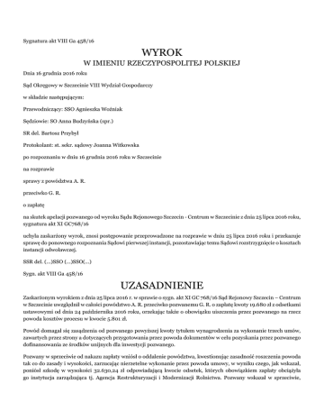 Sygnatura akt VIII Ga 458/16 WYROK W IMIENIU RZECZYPOSPOLITEJ POLSKIEJ Dnia 16 grudnia 2016 roku Sąd Okręgowy w Szczecinie VIII Wydział Gospodarczy w składzie następującym: Przewodniczący: SSO Agnieszka Woźniak Sędziowie: SO Anna Budzyńska (spr.) SR del. Bartosz Przybył Protokolant: st. sekr. sądowy Joanna Witkowska po rozpoznaniu w dniu 16 grudnia 2016 roku w Szczecinie na rozprawie sprawy z powództwa A. R. przeciwko G. R. o zapłatę na skutek apelacji pozwanego od wyroku Sądu Rejonowego Szczecin - Centrum w Szczecinie z dnia 25 lipca 2016 roku, sygnatura akt XI GC768/16 uchyla zaskarżony wyrok, znosi postępowanie przeprowadzone na rozprawie w dniu 25 lipca 2016 roku i przekazuje sprawę do ponownego rozpoznania Sądowi pierwszej instancji, pozostawiając temu Sądowi rozstrzygnięcie o kosztach instancji odwoławczej. SSR del. (...)SSO (...)SSO(...) Sygn. akt VIII Ga 458/16 UZASADNIENIE Zaskarżonym wyrokiem z dnia 25 lipca 2016 r. w sprawie o sygn. akt XI GC 768/16 Sąd Rejonowy Szczecin – Centrum w Szczecinie uwzględnił w całości powództwo A. R. przeciwko pozwanemu G. R. o zapłatę kwoty 19.680 zł z odsetkami ustawowymi od dnia 24 października 2016 roku, orzekając także o obowiązku uiszczenia przez pozwanego na rzecz powoda kosztów procesu w kwocie 5.801 zł. Powód domagał się zasądzenia od pozwanego powyższej kwoty tytułem wynagrodzenia za wykonanie trzech umów, zawartych przez strony a dotyczących przygotowania przez powoda dokumentów w celu pozyskania przez pozwanego dofinansowania ze środków unijnych dla inwestycji pozwanego. Pozwany w sprzeciwie od nakazu zapłaty wniósł o oddalenie powództwa, kwestionując zasadność roszczenia powoda tak co do zasady i wysokości, zarzucając nierzetelne wykonanie przez powoda umowy, w wyniku czego, jak wskazał, poniósł szkodę w wysokości 32.630,24 zł odpowiadającą kwocie odsetek, których obowiązkiem zapłaty obciążyła go instytucja zarządzająca tj. Agencja Restrukturyzacji i Modernizacji Rolnictwa. Pozwany wskazał w sprzeciwie, że potrąca powyższą wierzytelność z wierzytelnością powoda. Pozwany w sprzeciwie od nakazu zapłaty wniósł o przeprowadzenie dowodu z dokumentów załączonych do sprzeciwu oraz o przesłuchanie w charakterze strony. Sąd Rejonowy uwzględniając powództwo uznał, że powód wyjaśnił należycie sposób wyliczenia dochodzonej kwoty, w tym co do błędnie wystawionej na rzecz pozwanego w 2013 roku faktury VAT. Co do zarzutu potrącenia Sąd I instancji uznał, że pozwany nie wykazał, aby złożył skutecznie powodowi oświadczenie o potrąceniu. Gdyby odczytywać treść sprzeciwu jako oświadczenie o potrąceniu złożone w toku postępowania pełnomocnikowi powoda - to w ocenie Sądu I instancji - nie wynika z okoliczności sprawy, aby pełnomocnik powoda był umocowany do przyjęcia powyższego oświadczenia. Niezależnie od powyższego Sąd I instancji podniósł, że z materiału dowodowego zebranego w sprawie nie wynika, aby powód nienależycie wykonał umowę stron, gdyż zarzut nieterminowego złożenia wniosku o płatność nie znajduje potwierdzenia w materiale procesowym sprawy. Sąd I instancji wskazał nadto, iż gdyby nawet przyjąć, że powoda obciążał co do zasady obowiązek umowny złożenia takiego wniosku, to zgodnie z twierdzeniami powoda czynność ta miałaby być wykonana w chwili, kiedy współpraca stron już ustała, co nastąpiło w październiku 2014 roku. Jednocześnie Sąd I instancji wyjaśnił przyczyny, dla których nie uwzględnił wniosku pozwanego o odroczenie terminu rozprawy w dniu 25 lipca 2016 roku. (karta 91). Sąd Rejonowy wskazał, że wniosek ten został nadany wiadomością e-mail do sądu w dniu 25 lipca 2016 roku (tj. w dniu rozprawy) o godzinie 9.56, rozprawa rozpoczęła się o godzinie 13.20. Sąd I instancji podkreślił, że do wniosku nie załączono zaświadczenia lekarza sądowego a jedynie nieczytelny dokument. Podniósł, że po zamknięciu rozprawy, w dniu 29 lipca 2016 roku pozwany nadał e-mail do którego załączył zwolnienie lekarskie z dnia 22 lipca 2016 roku oraz zwolnienie wystawione dla pozwanego mieszkającego w P. wystawione przez lekarza sądowego w S. w dniu 28 lipca 2016 roku. Wskazał, że jako kuriozalna jawi się sytuacja, gdzie pozwany z P. jedzie do S. do lekarza po zwolnienie lekarskie, z którego wynika, że pozwany nie może stawić się w S.. Za budzący wątpliwości uznał przy tym Sąd Rejonowy fakt, że pismo odnoszące się do zwolnienia z dnia 22 lipca 2016 roku nie zostało wysłane w dniu 22 lipca 2016 roku, ale w dniu rozprawy bo w dniu 25 lipca 2016 roku. Sąd Rejonowy wskazał również, że uznał obecność pozwanego na zbędną. Sąd I instancji nie miał wątpliwości, że pozwany poświadczyłby twierdzenie, iż złożył powodowi ustne oświadczenie o potrąceniu. W ocenie Sądu I instancji fakt zaś nierzetelnego wykonania umowy powinien wynikać z dokumentów a takich pozwany nie przedłożył. Podkreślił, że dowód z przesłuchania stron ma charakter absolutnie pomocniczy i stosowany jest w ostateczności. Mimo licznej korespondencji między stronami wiadomościami e-mail, pozwany nie złożył żadnych wiadomości e-mail na okoliczność wzywania powoda do dokonania określonych czynności, co wskazuje na fakt, że takowe nie istnieją. Szersza teza dowodowa nie została w sprzeciwie wskazana. W apelacji od powyższego wyroku pozwany wniósł o uchylenie zaskarżonego i orzeczenia i przekazanie sprawy do ponownego rozpoznania z pozostawieniem Sądowi I instancji rozstrzygnięcia o kosztach postępowania apelacyjnego. Skarżący zarzucił naruszenie art. 379 pkt 5 k.p.c. w zw. z art. 214 § 1 k.p.c., art. 2141 § 1 k.p.c., art. 216 k.p.c. art. 217 § 1-3 k.p.c. art. 224 par 1 k.p.c. poprzez pozbawienie pozwanego możliwości obrony i dochodzenia jego praw wskutek nieodroczenia rozprawy w dniu 25 lipca 2016, pominięciu na tej rozprawie d